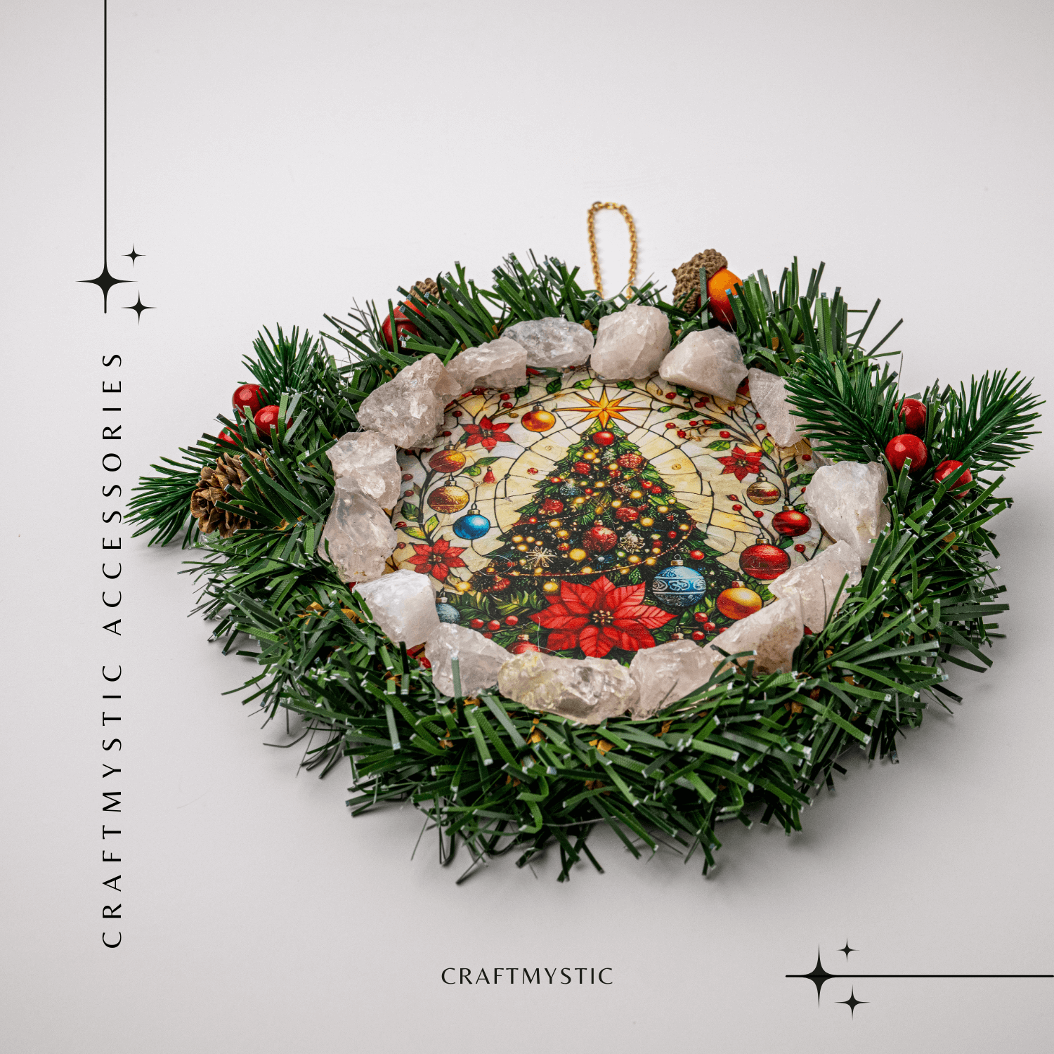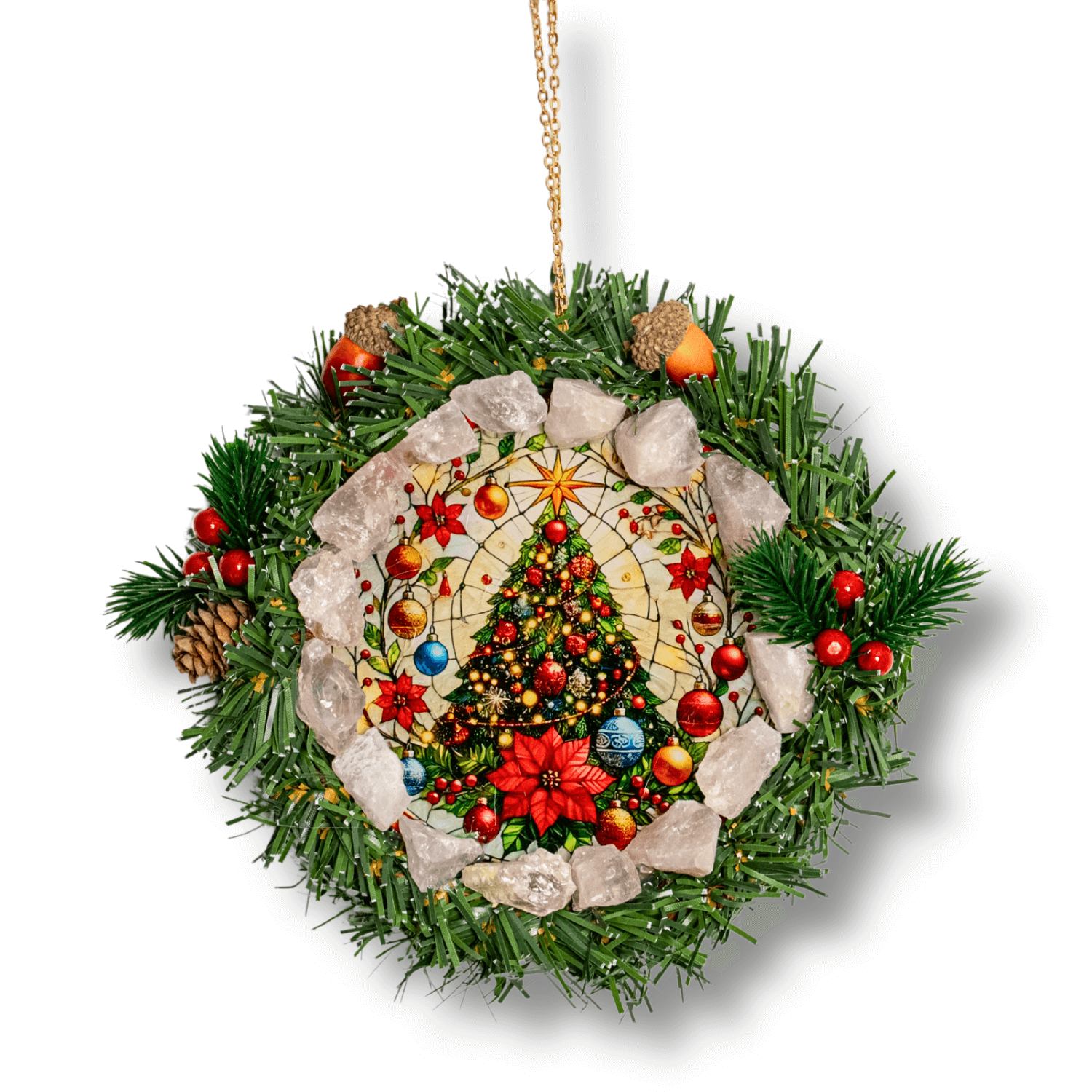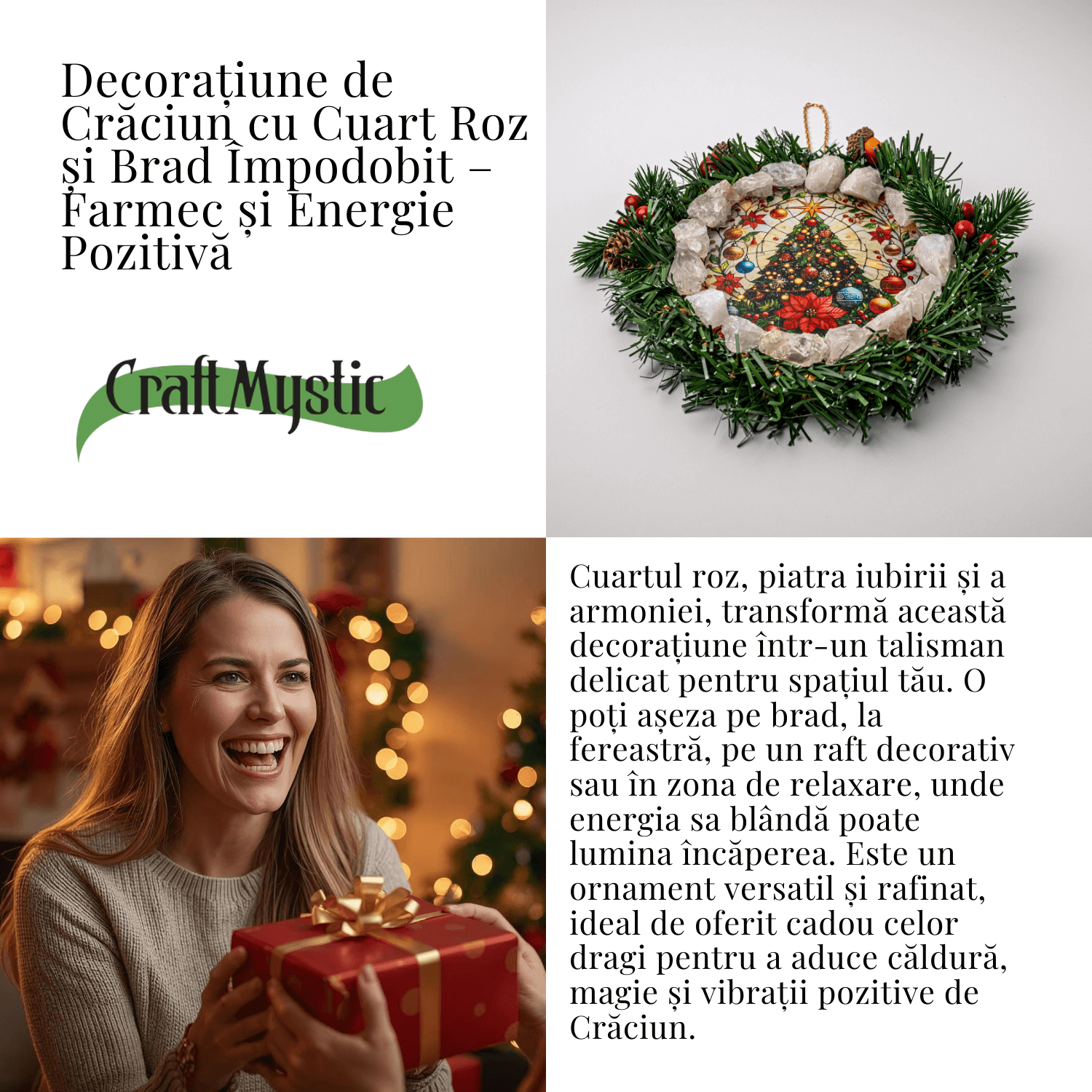 Aceasta decoratiune de Craciun cu Cuart Roz este un cerc magic al armoniei, creat pentru a aduce blandete, caldura si energie afectiva in orice spatiu. Forma circulara reprezinta eternitatea, protectia si renasterea – simbol al ciclurilor vietii si al unitatii. Cuartul Roz, piatra iubirii neconditionate, transforma coronita intr-un portal de energie calma, vindecare emotionala si conexiune sufleteasca. Imaginea centrala – bradul luminos si florile de poinsettia – adauga vibratia sarbatorilor, prosperitate, bucurie si spirit festiv.