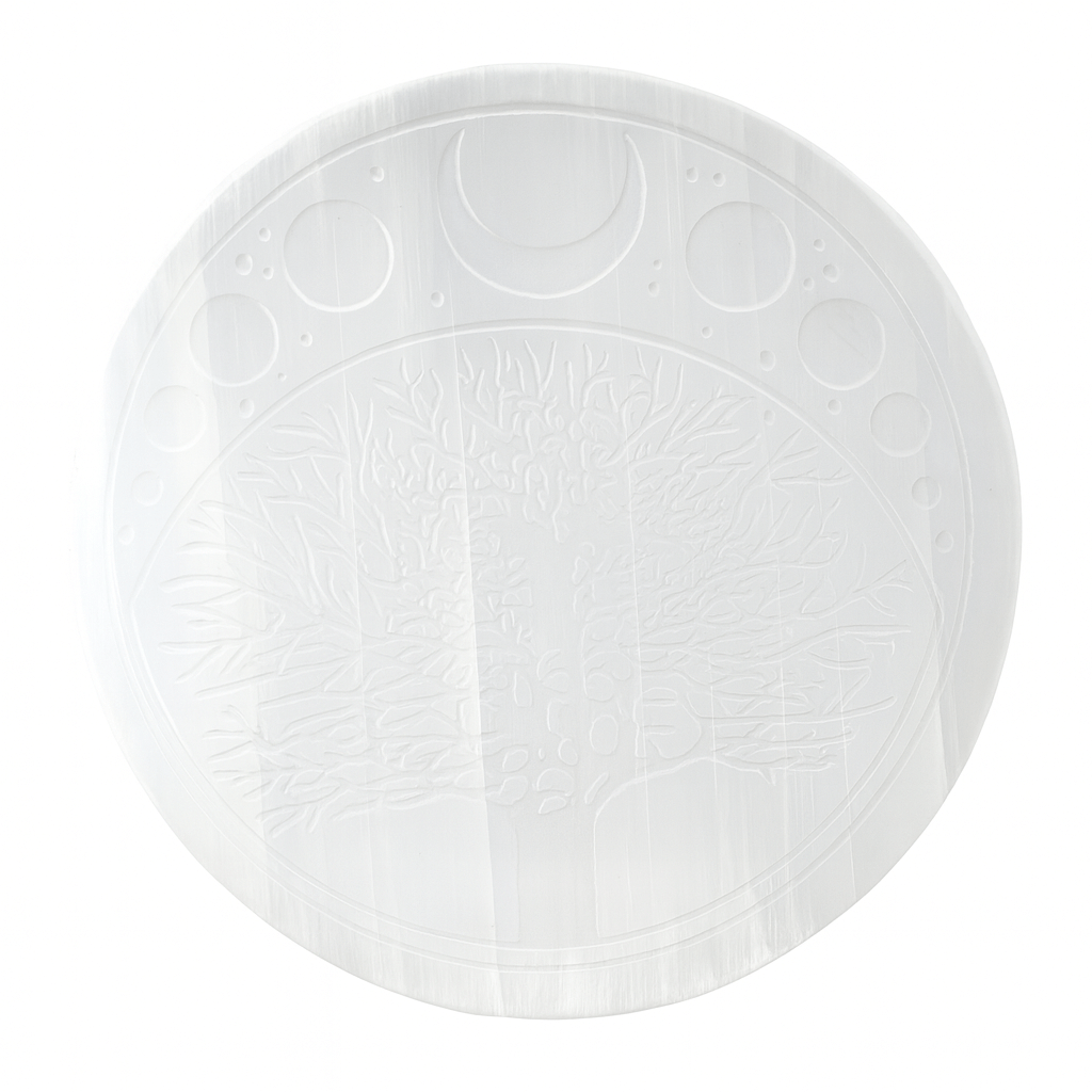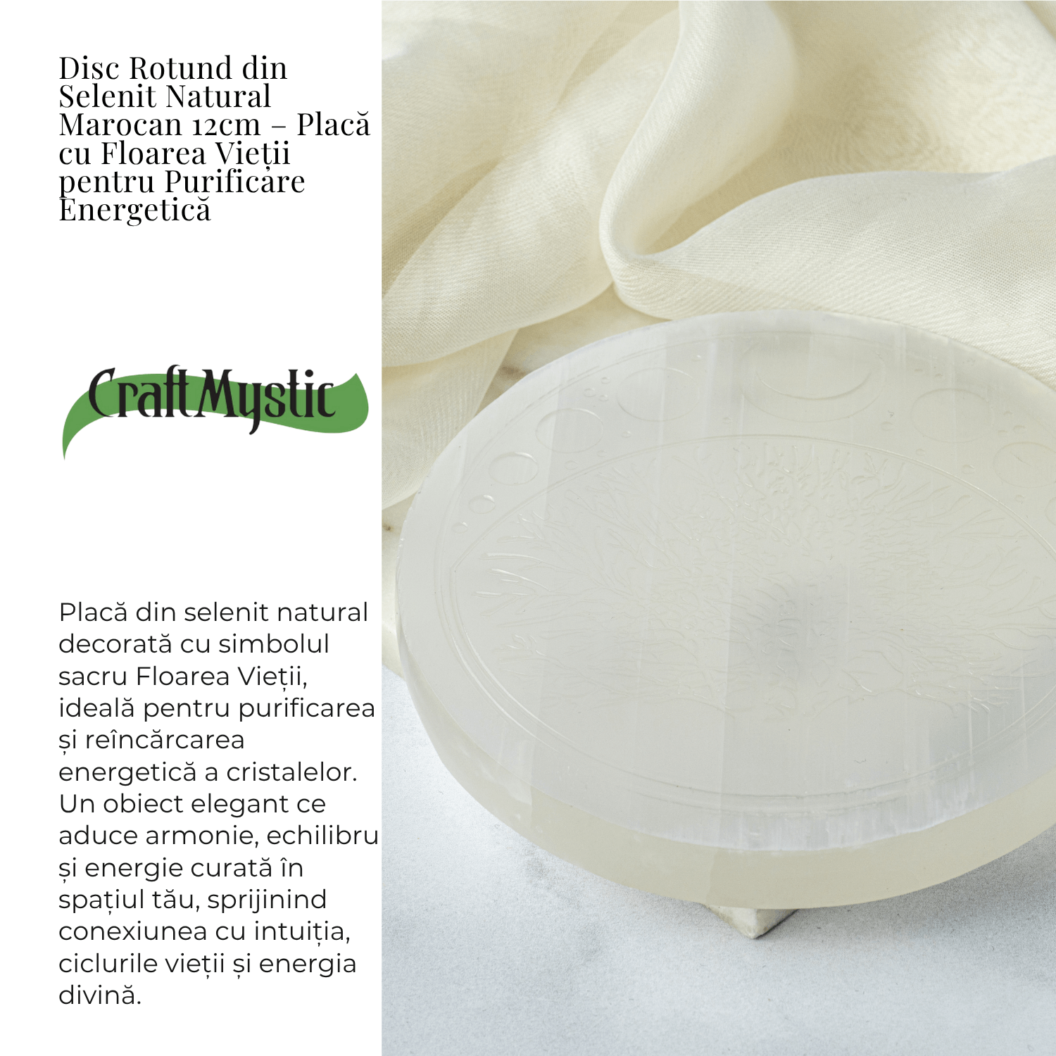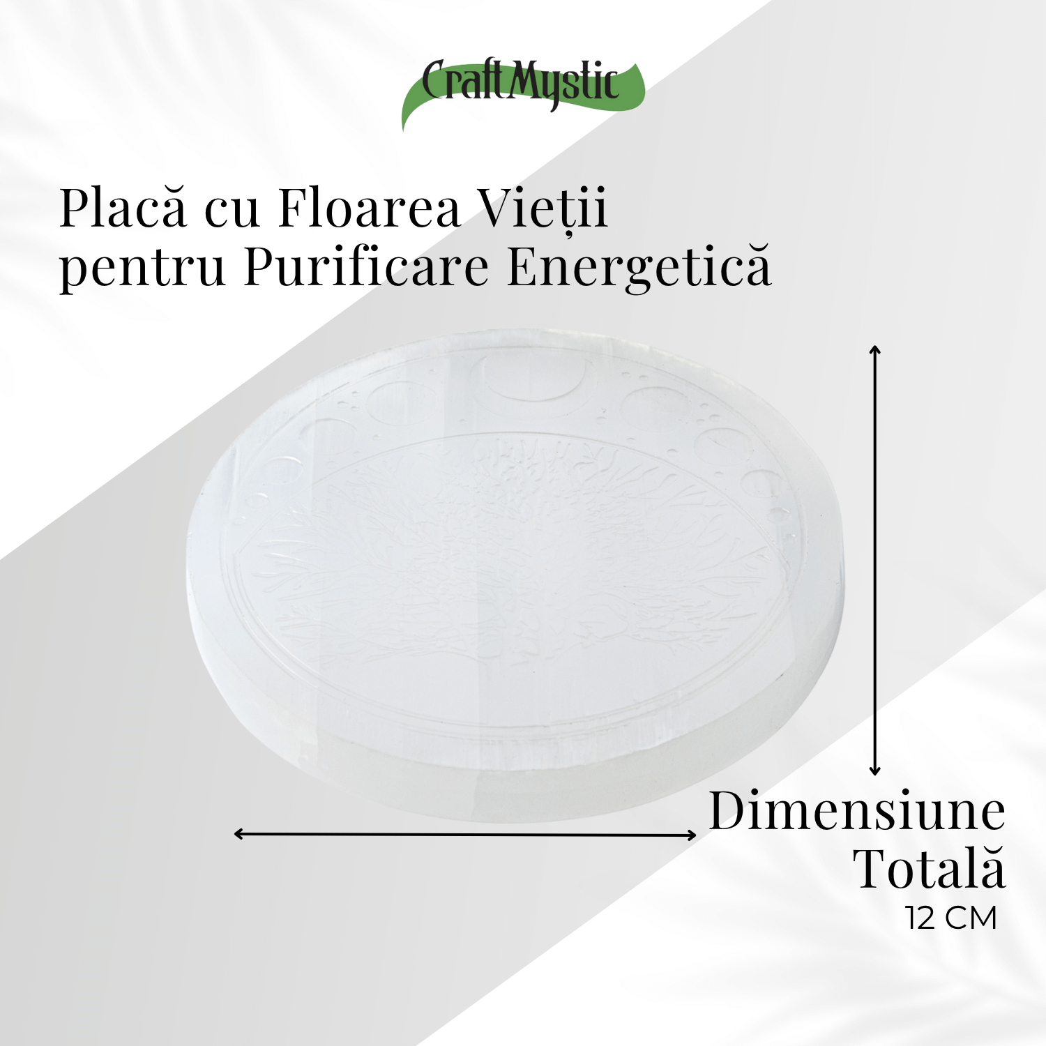 Aceasta placa rotunda din selenit natural este un portal al luminii si purificarii. Simbolul Floarea Vietii gravat pe suprafata sa reprezinta creatia universala, conexiunea dintre spirit si materie si echilibrul perfect al energiilor.