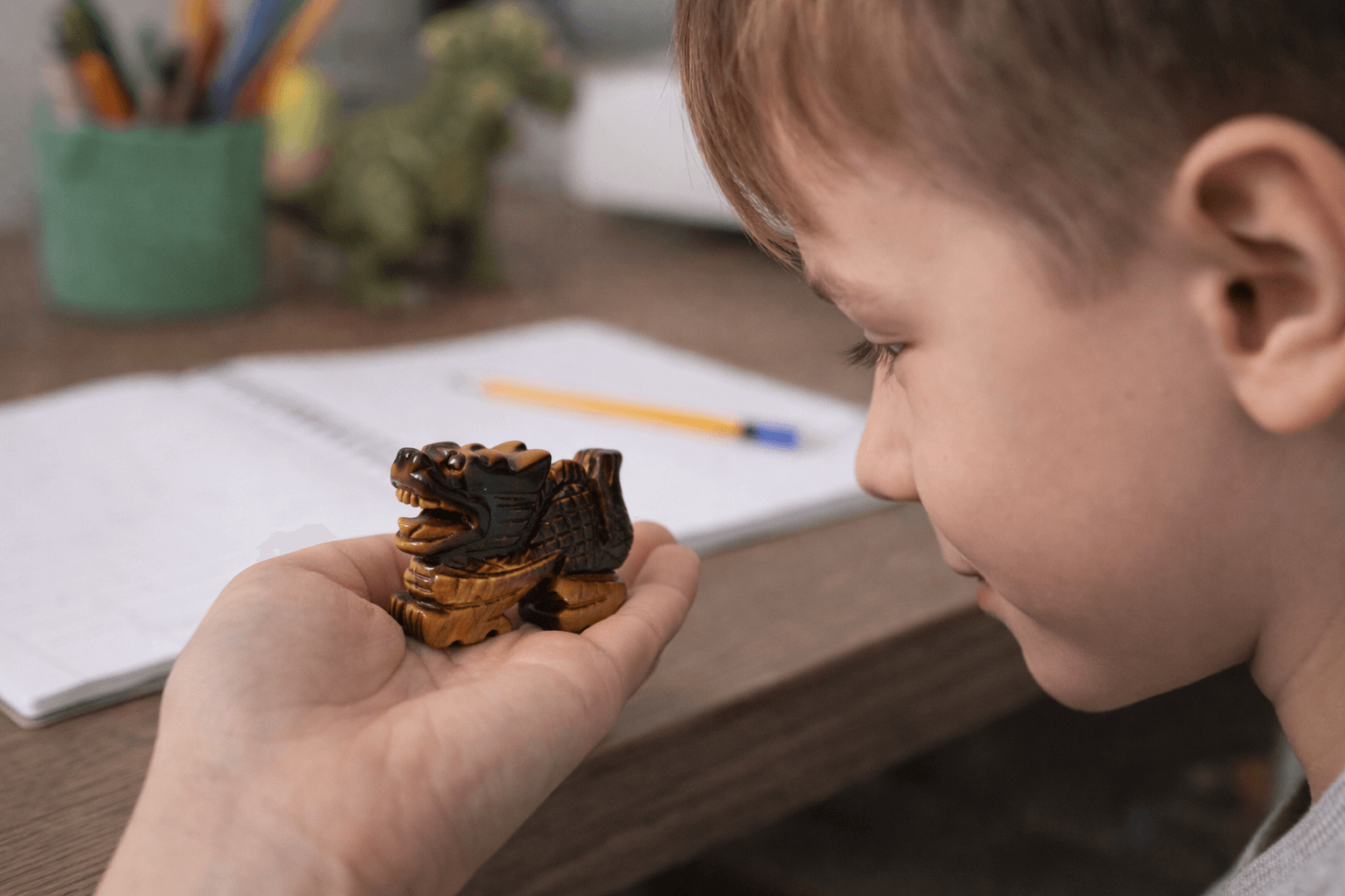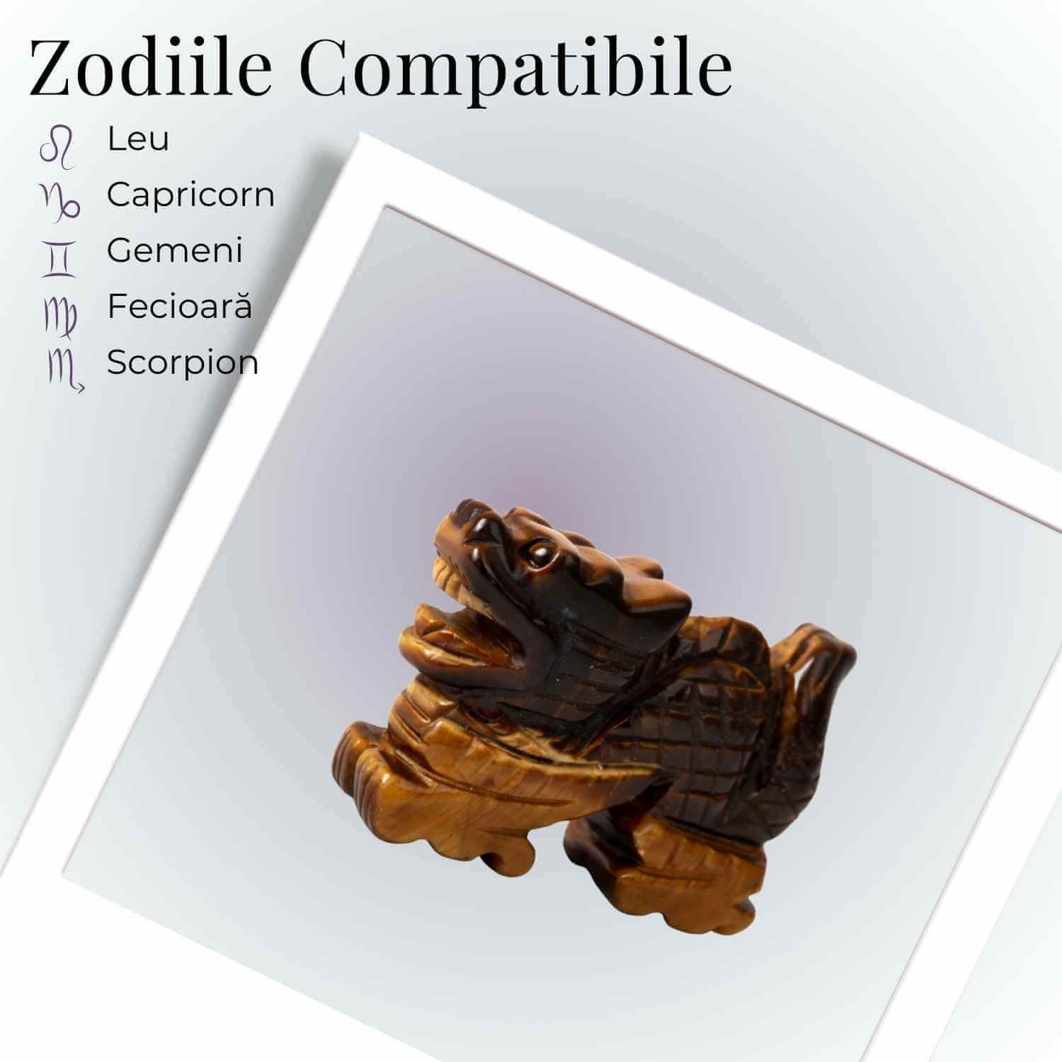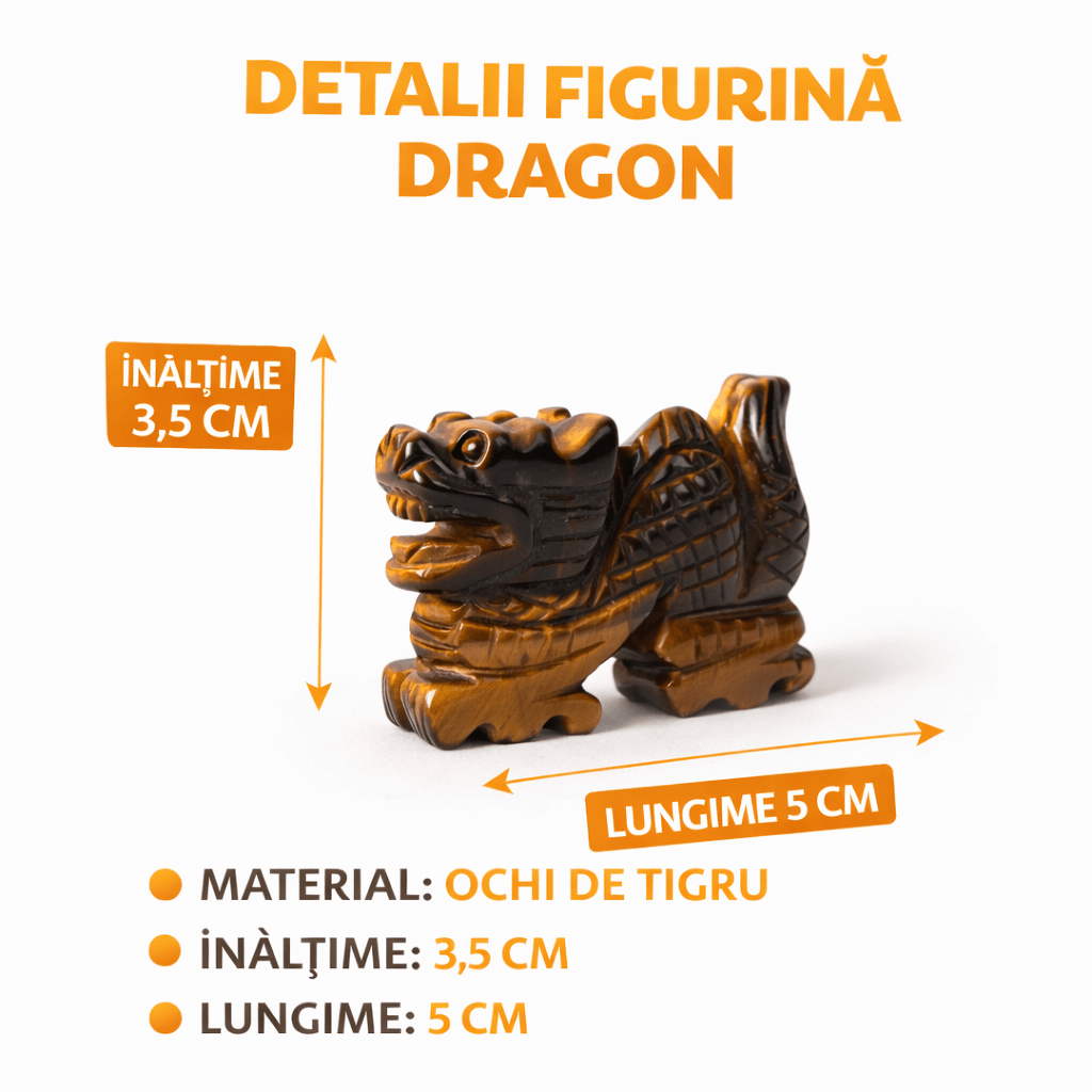Această figurină dragon din Ochi de Tigru este un simbol puternic al protecției, curajului și forței interioare. Dragonul, ființă mitică a înțelepciunii și a puterii, este considerat un gardian energetic, capabil să îndepărteze influențele negative și să susțină reușita personală.