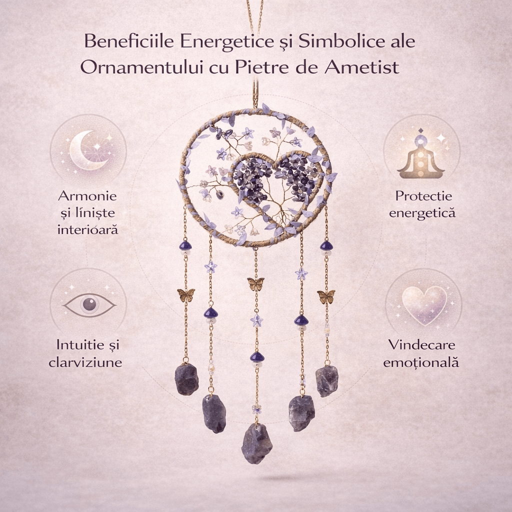 Ametistul este asociat cu liniștea interioară, introspecția și echilibrul emoțional. În acest ornament, pietrele brute adaugă un caracter autentic și o prezență naturală, fără promisiuni sau afirmații exagerate.