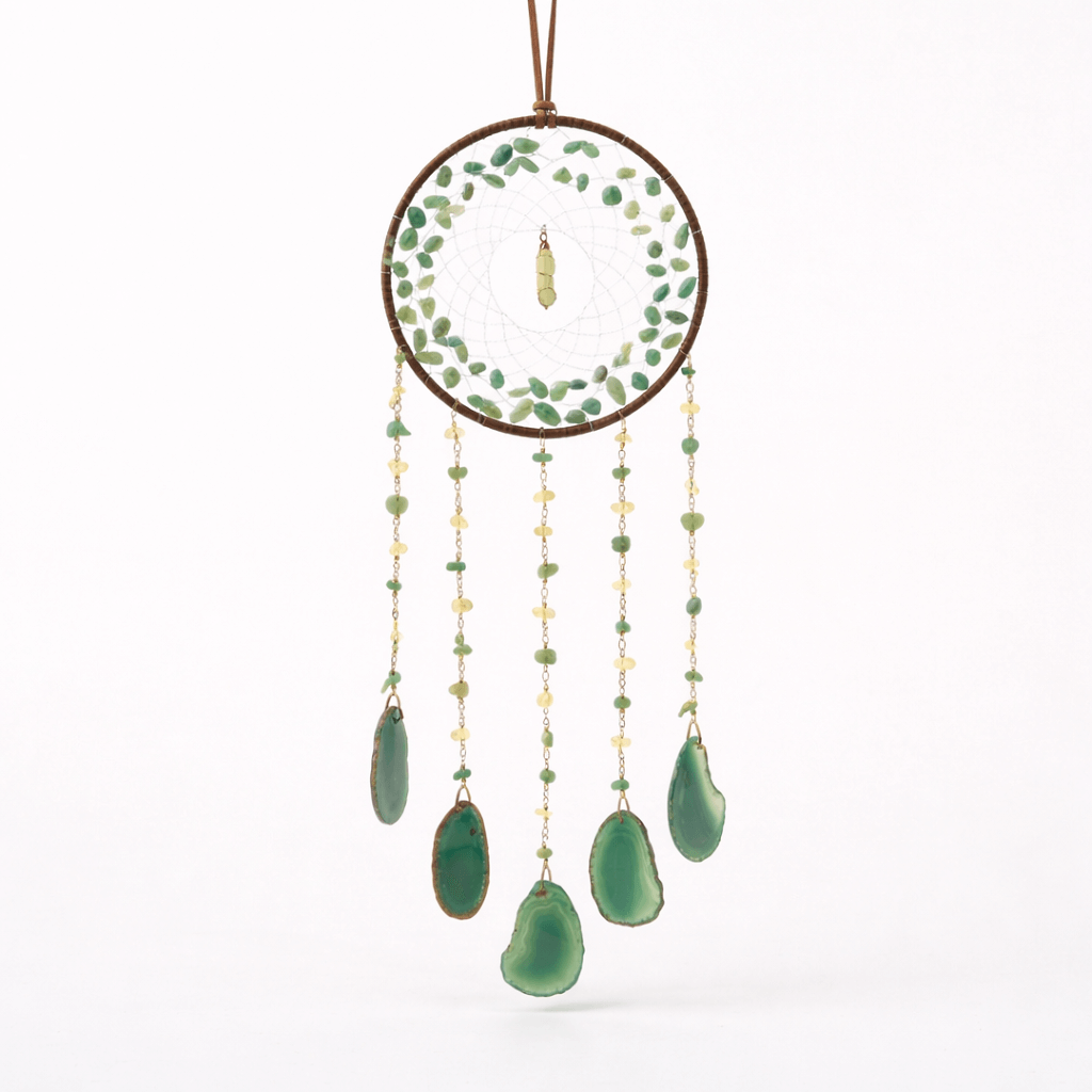 Acest dreamcatcher creează o atmosferă calmă, proaspătă și echilibrată, inspirată de energia naturii. Nuanțele de verde și formele organice ale pietrelor aduc o senzație de liniște, claritate și deschidere, fără a încărca spațiul.