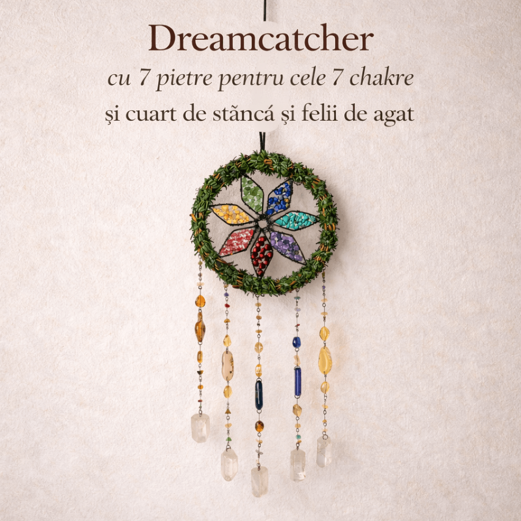 Dreamcatcher cu cele 7 chakre si cuart de stanca, realizat manual. Obiect spiritual decorativ, potrivit pentru ritual personal, echilibru interior si armonizarea spatiului.