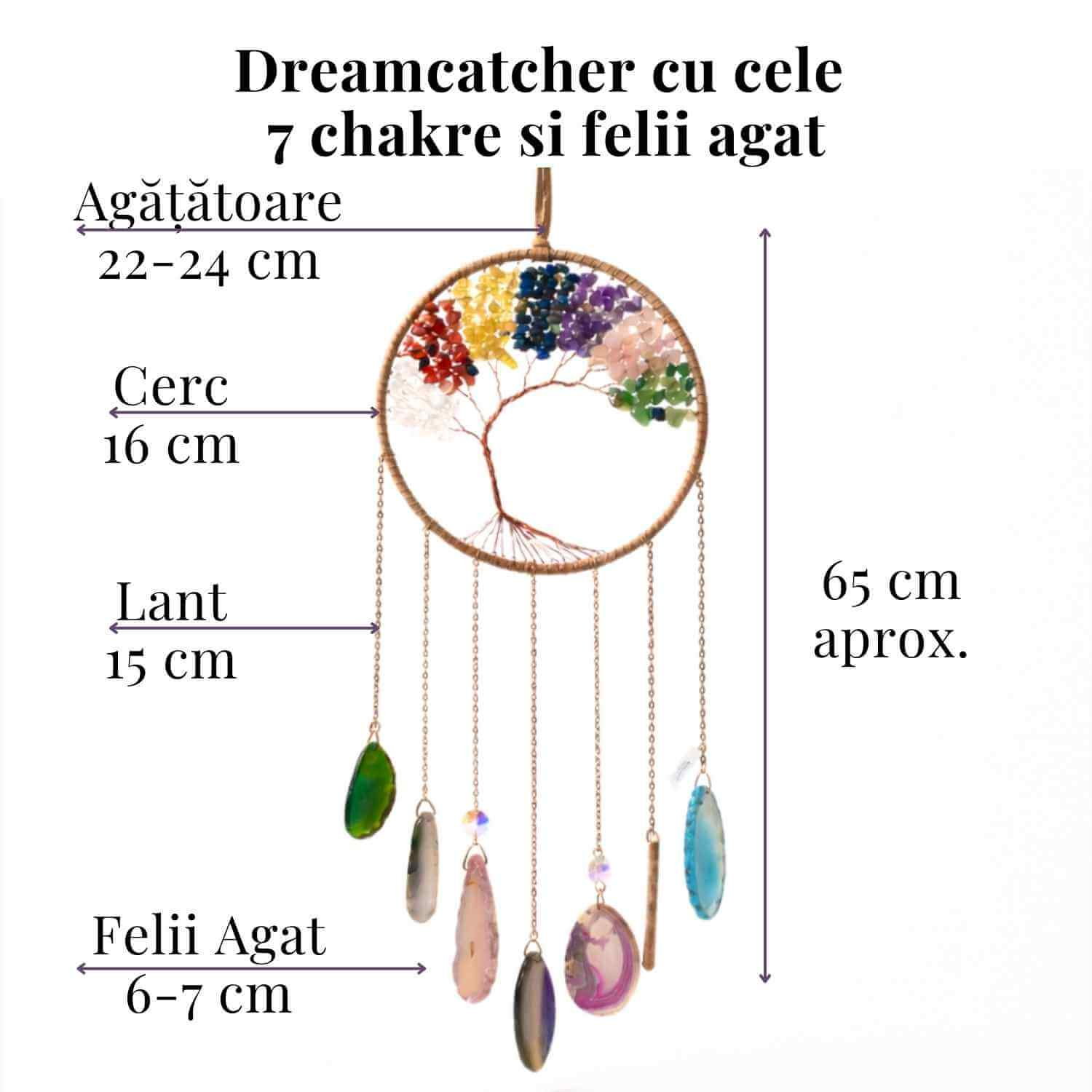 Un dreamcatcher cu cele 7 chakre și felii de agat, creat pentru armonie, calm și spații cu sens. Un obiect decorativ cu simbolistică spirituală, potrivit pentru ritualuri personale simple.