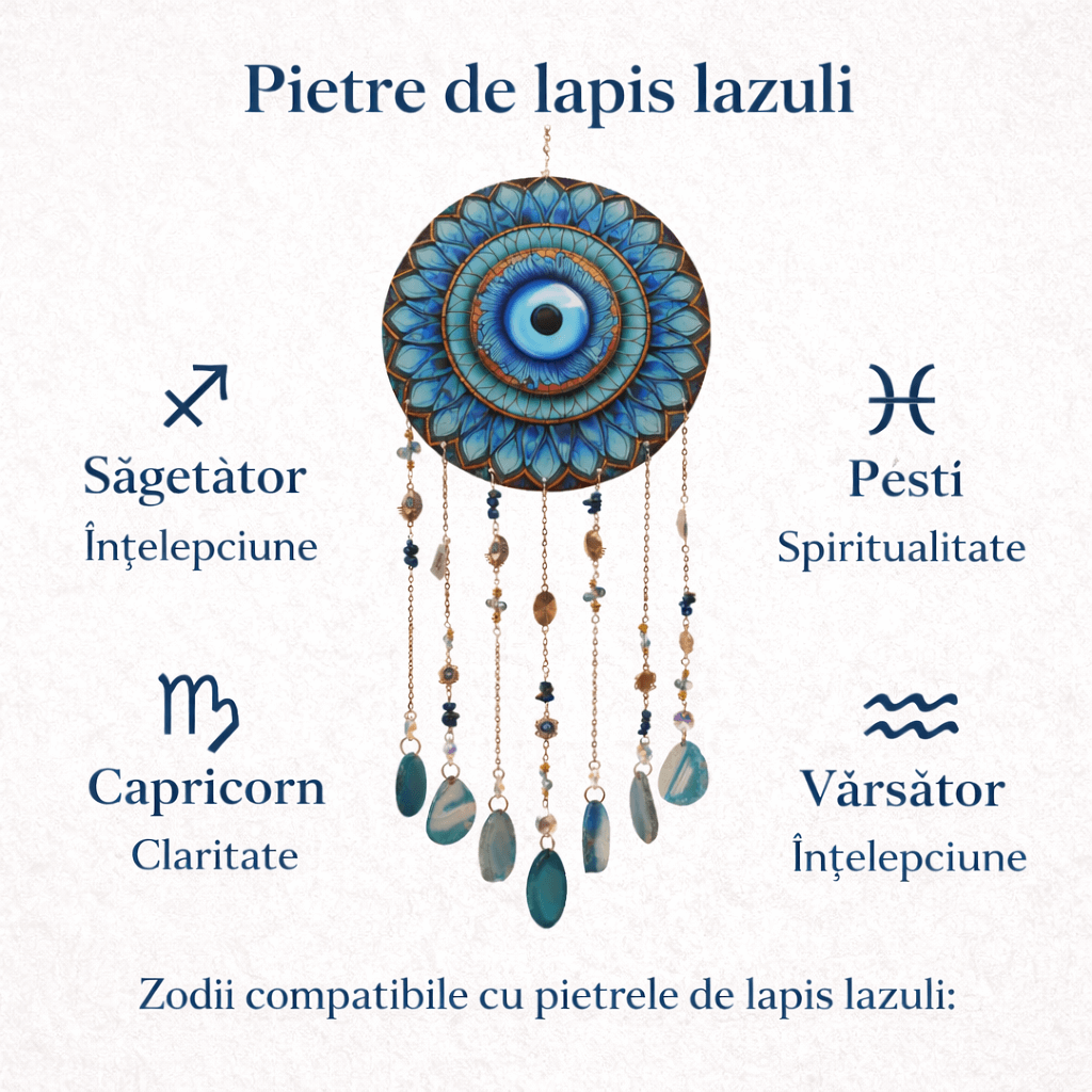 Dreamcatcher cu lapis lazuli si simbol de ochi protector, realizat manual. Un obiect spiritual decorativ pentru claritate, intuitie si un spatiu personal echilibrat.