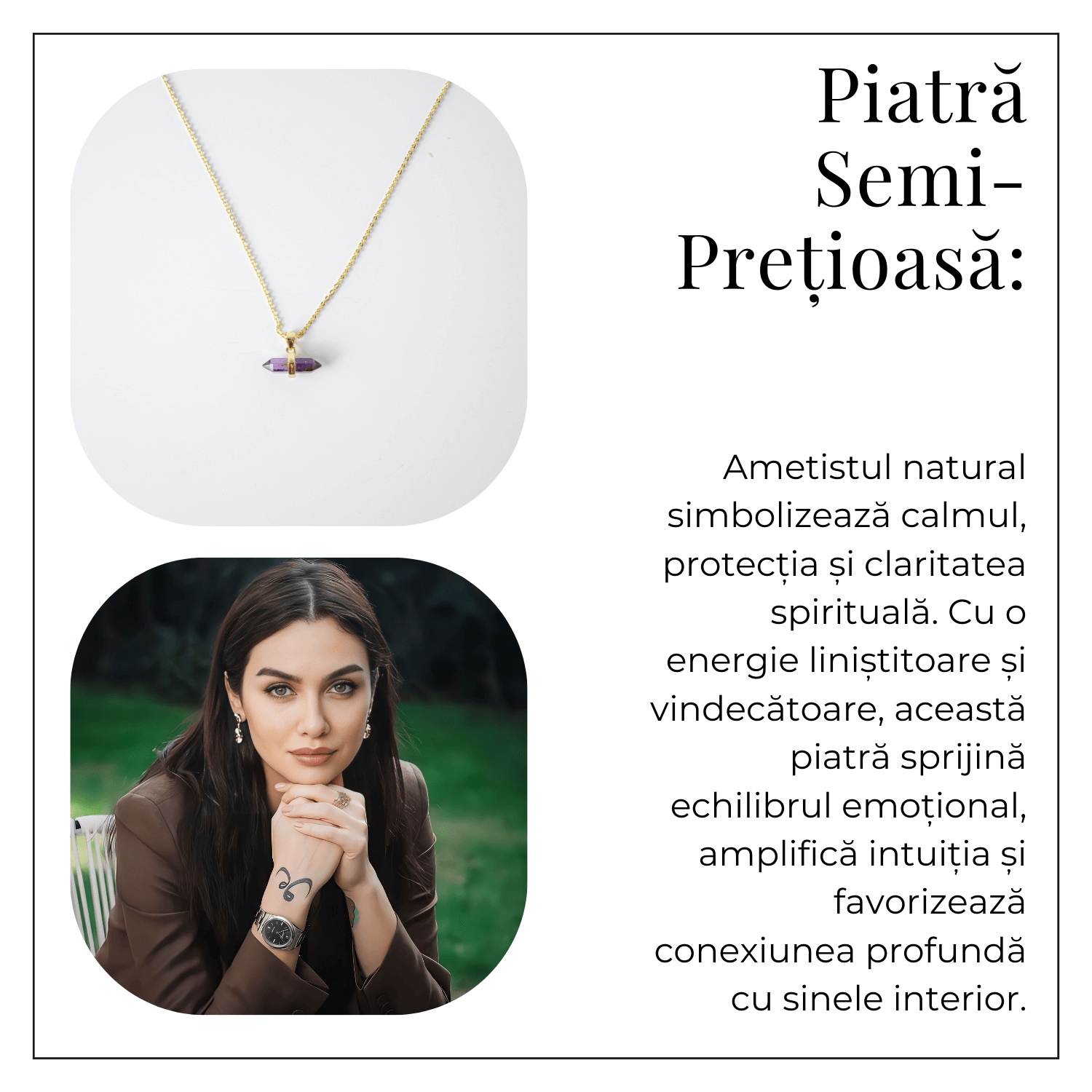 Când porți acest colier, simți o stare de calm și protecție subtilă. Ametistul îți relaxează mintea, alungă stresul și aduce claritate în gânduri, ajutându-te să te centrezi și să păstrezi armonia emoțională.