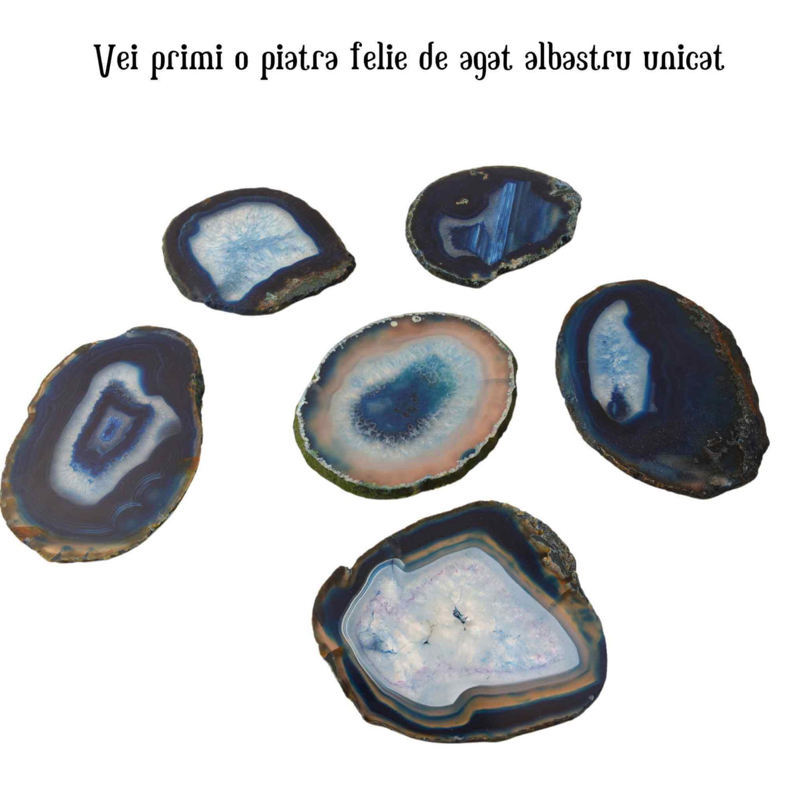 Adaugă această felie de Agat Albastru în formă neregulată în colecția ta pentru a te bucura de beneficiile sale de îmbunătățire a creativității și a energiei pozitive, sau ofer-o cadou pentru a împărtăși aceste avantaje cu cineva drag!