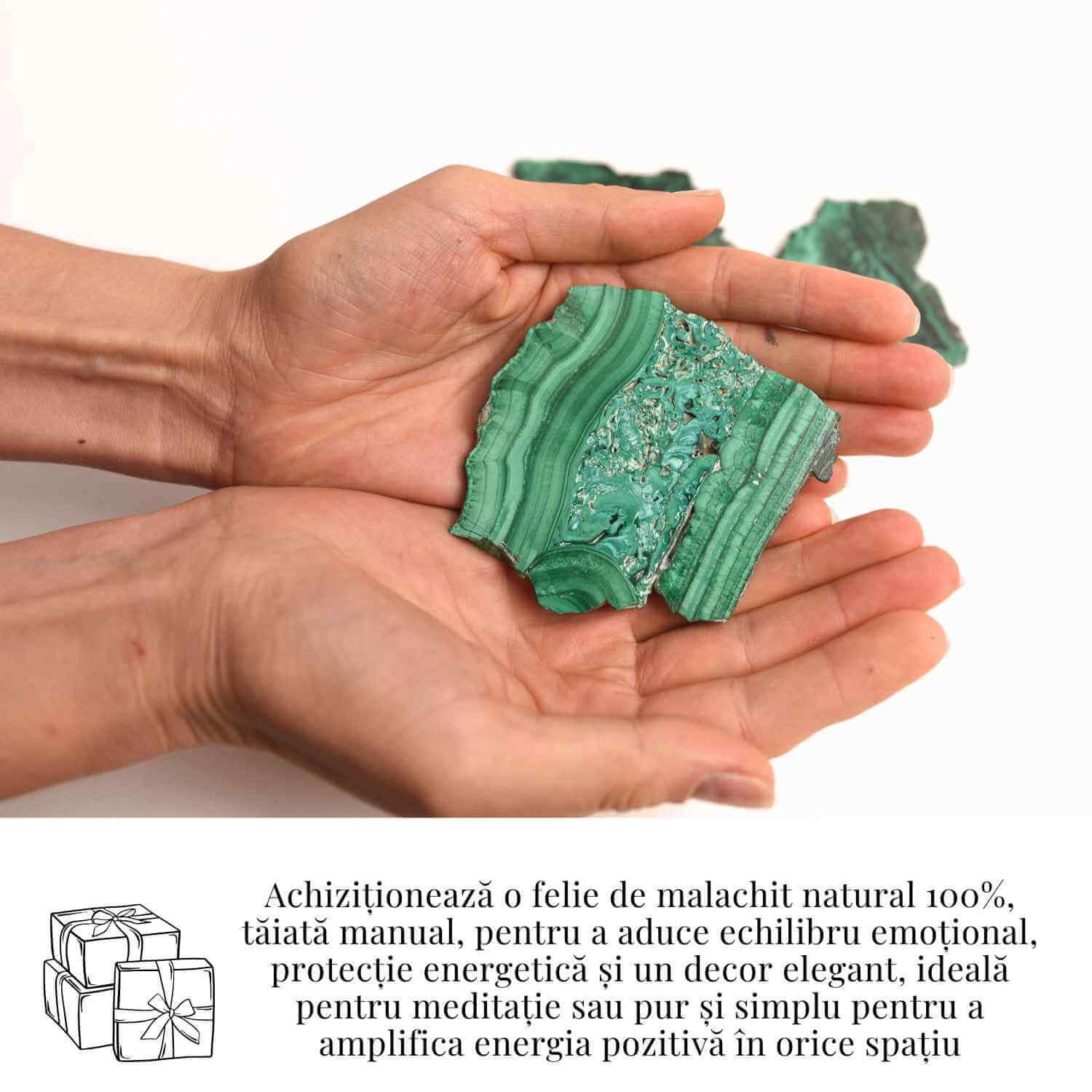 - Pietre naturale: Fiecare felie de malachit este unică, cu mici variații de culoare și textură datorate procesului manual de lucru.