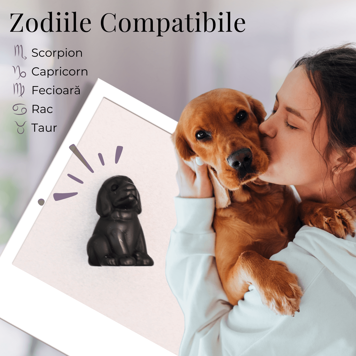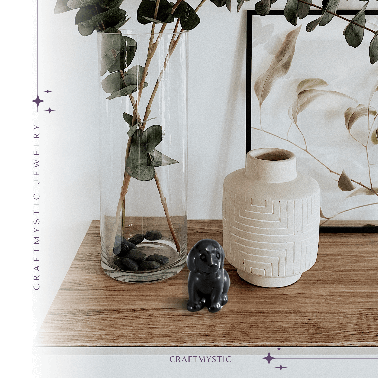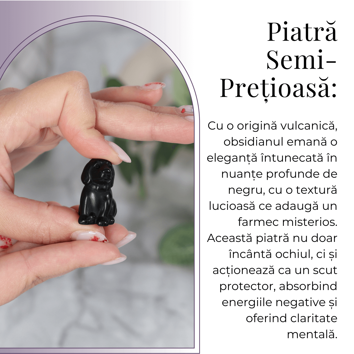 Descriere: Această figurină deosebită de cățeluș, sculptată cu măiestrie din obsidian, aduce un strop de eleganță și protecție în spațiul tău.