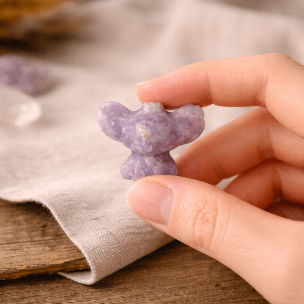 Uneori, liniștea nu vine din răspunsuri, ci din prezență. Această figurină din lepidolit este un mic reminder că echilibrul începe din interior.