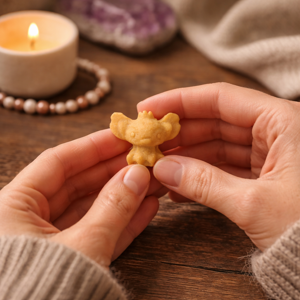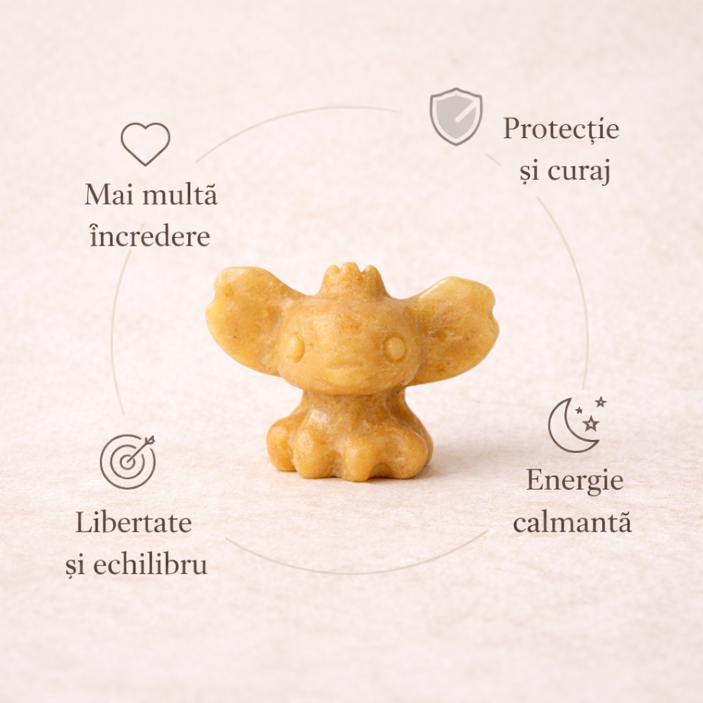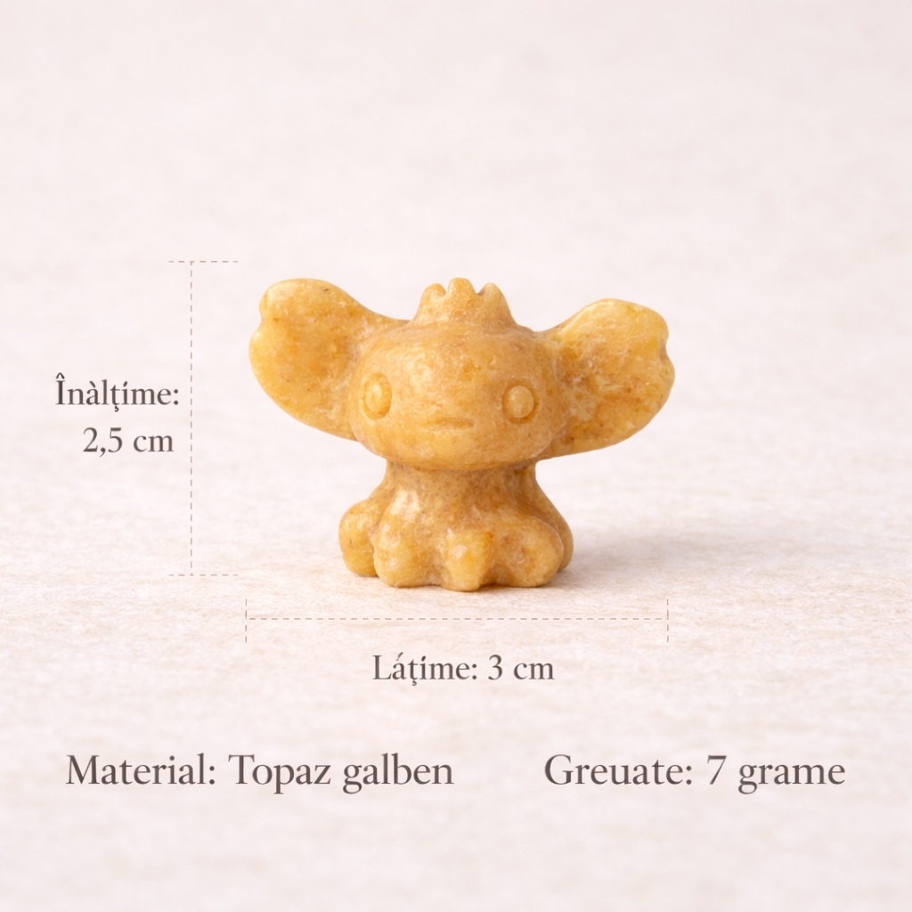 Această figurină din topaz galben aduce o stare de seninătate blândă și optimism liniștit. Forma sa jucăușă inspiră deschidere, curaj interior și o relație mai relaxată cu viața de zi cu zi. Topazul galben este asociat cu claritatea emoțională și cu energia luminoasă care susține echilibrul interior, fără a forța schimbarea.