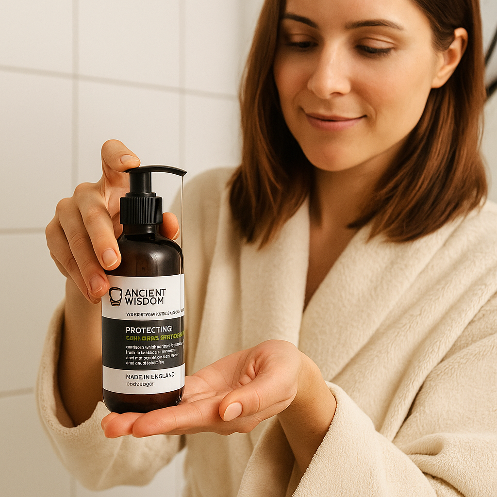 • Ca săpun lichid pentru mâini: aplică 1–2 pompițe, masează și clătește bine.