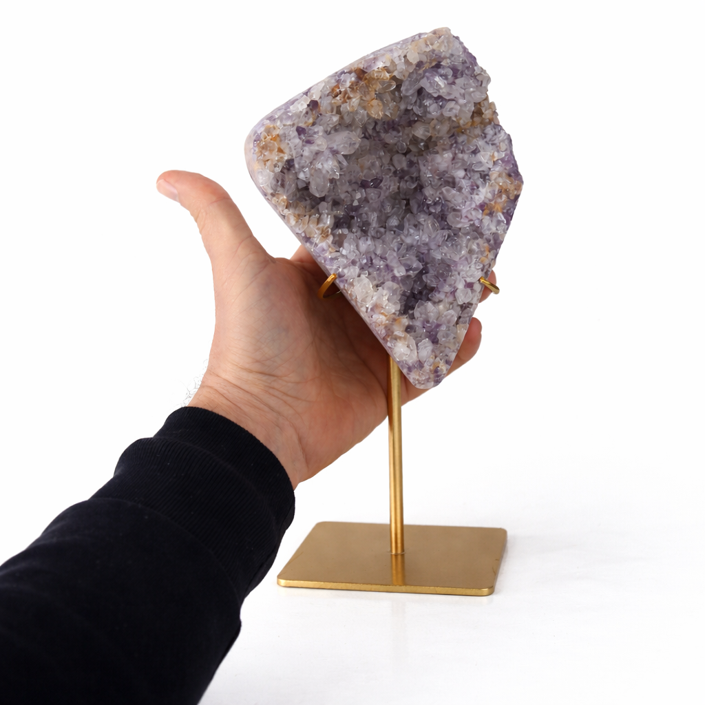 Această geodă din ametist natural brazilian emană o stare de calm așezat și claritate. Cavitatea cristalină adâncă, cu reflexii naturale și nuanțe de violet și lila, creează o prezență echilibrată, potrivită pentru spații în care ai nevoie de stabilitate și concentrare.