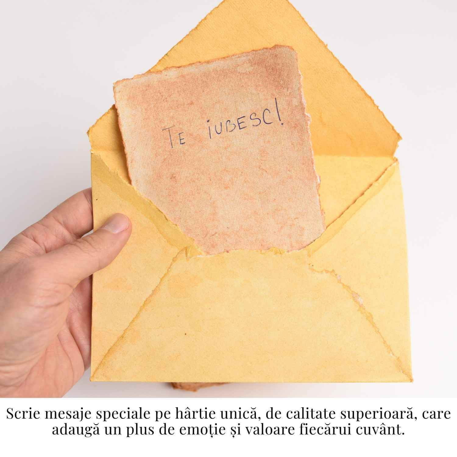 - Notă: Fiecare coală de hârtie este realizată manual, așa că pot exista mici variații de textură și culoare, ceea ce oferă fiecărui set de hârtie unicitate și frumusețe aparte.