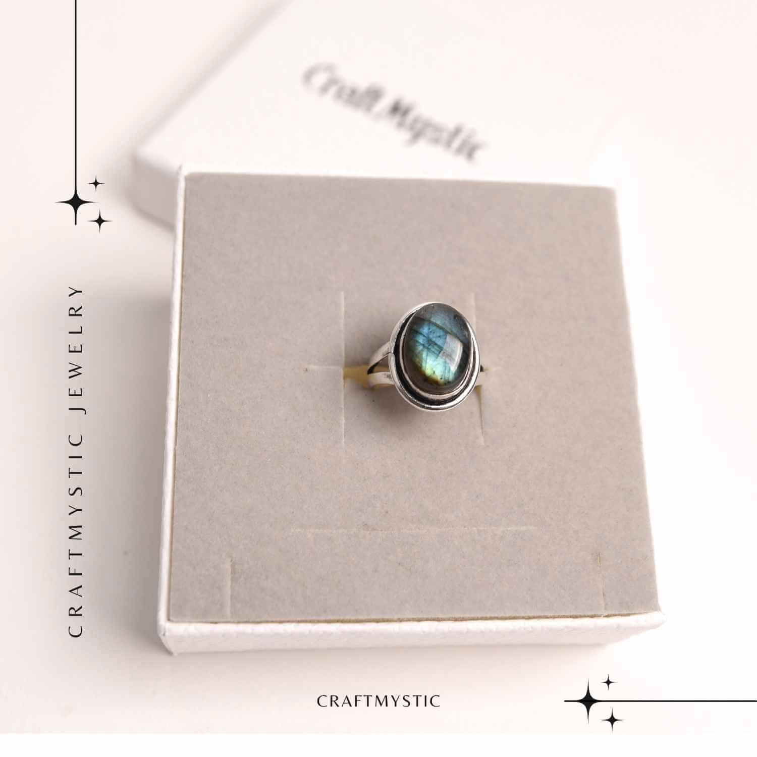 • Bijuterie lucrată manual: fiecare inel are un caracter unic, datorită variațiilor naturale de culoare și textură ale labradoritului.