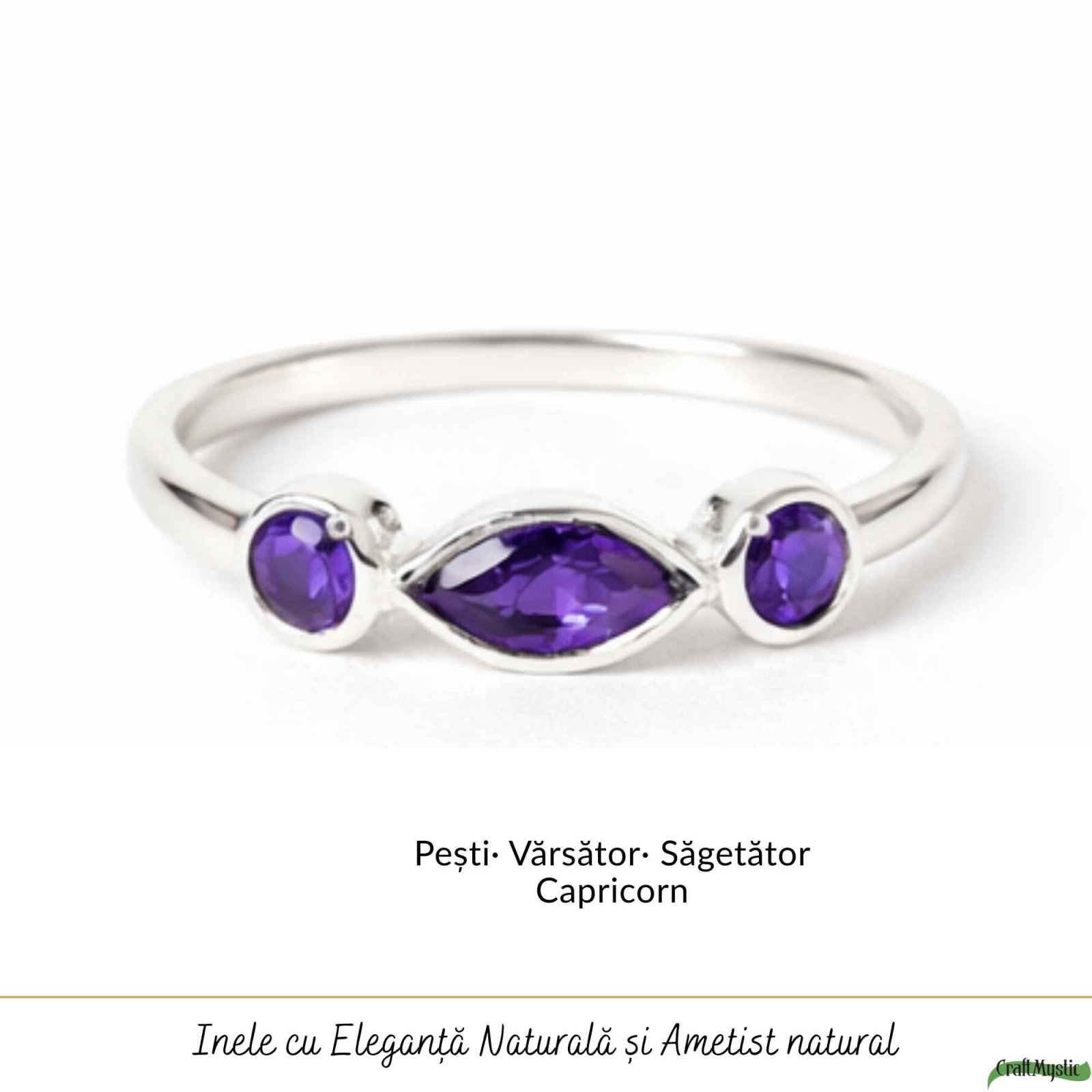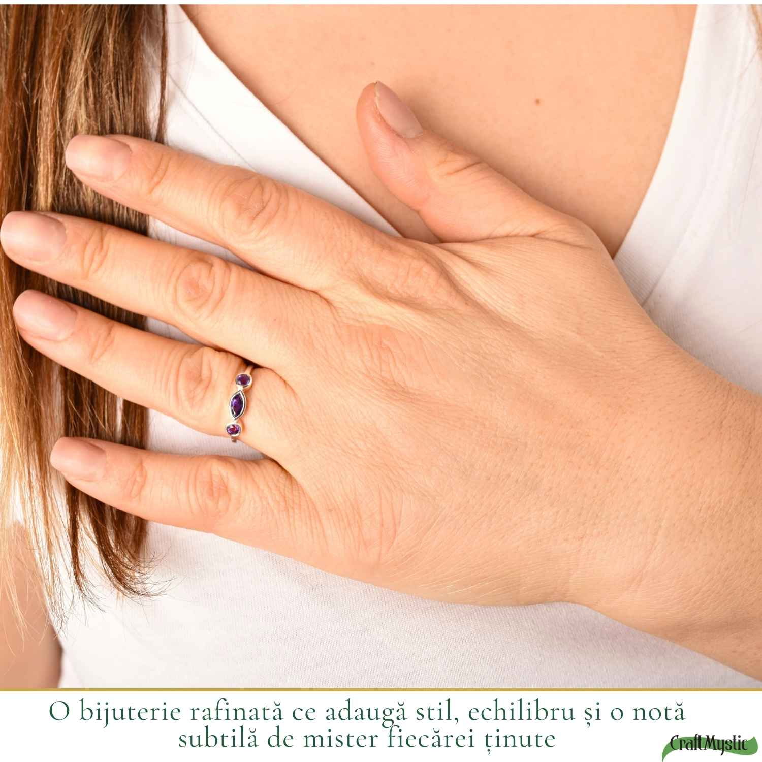 Îți pui inelul dimineața înainte să pleci de acasă. Cele trei pietre de ametist prind lumina discret, iar violetul lor elegant completează perfect orice ținută. Este delicat și ușor, atât de confortabil încât după câteva minute uiți că îl porți, dar energia lui rămâne cu tine toată ziua.