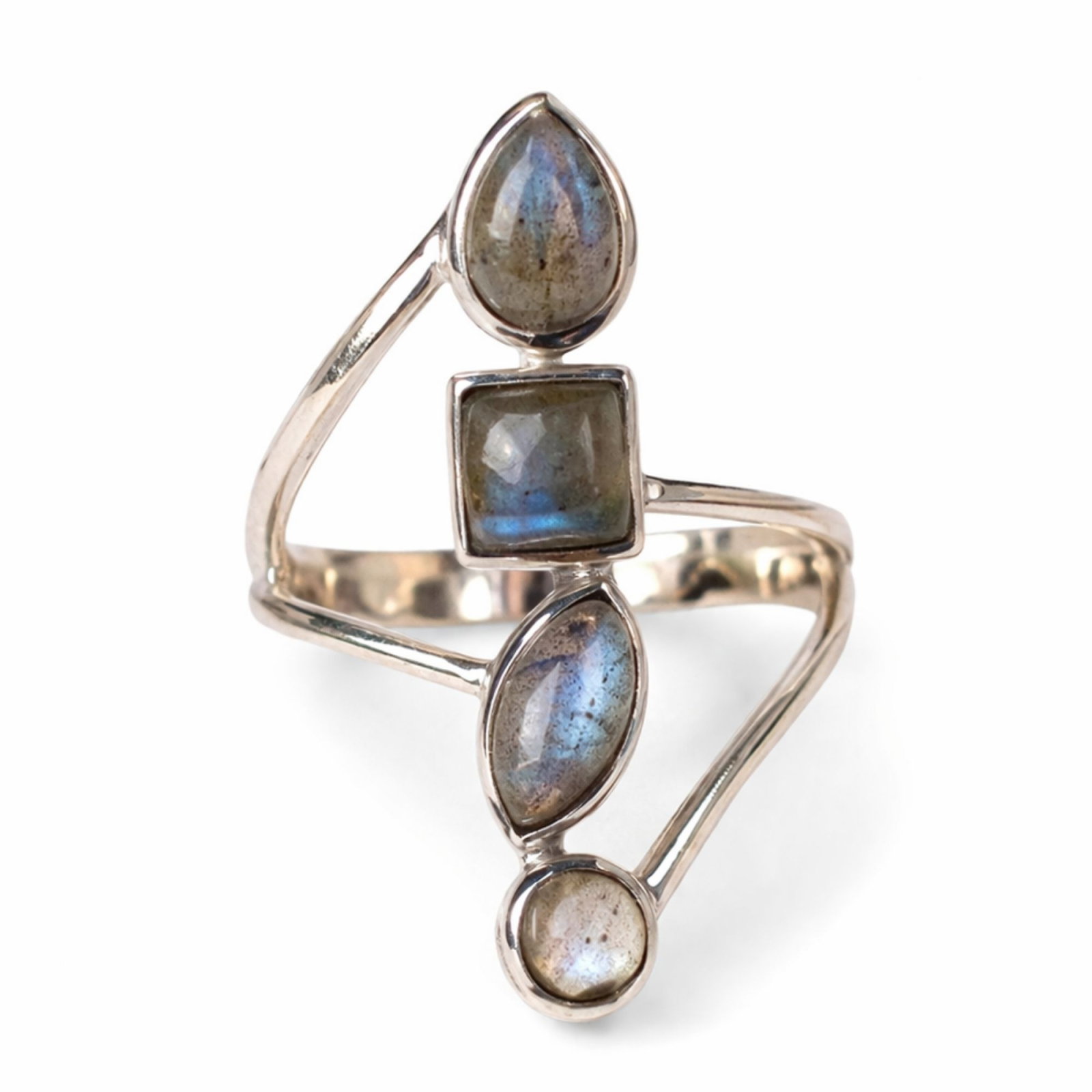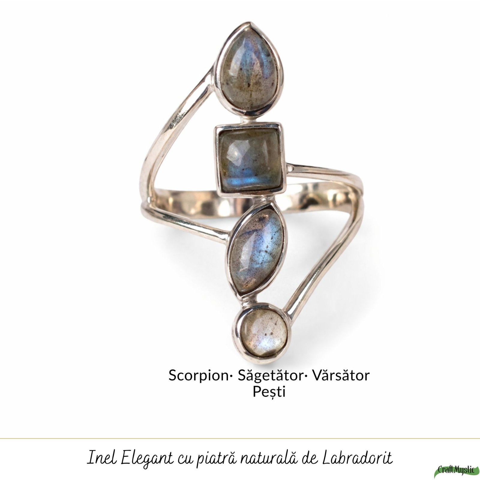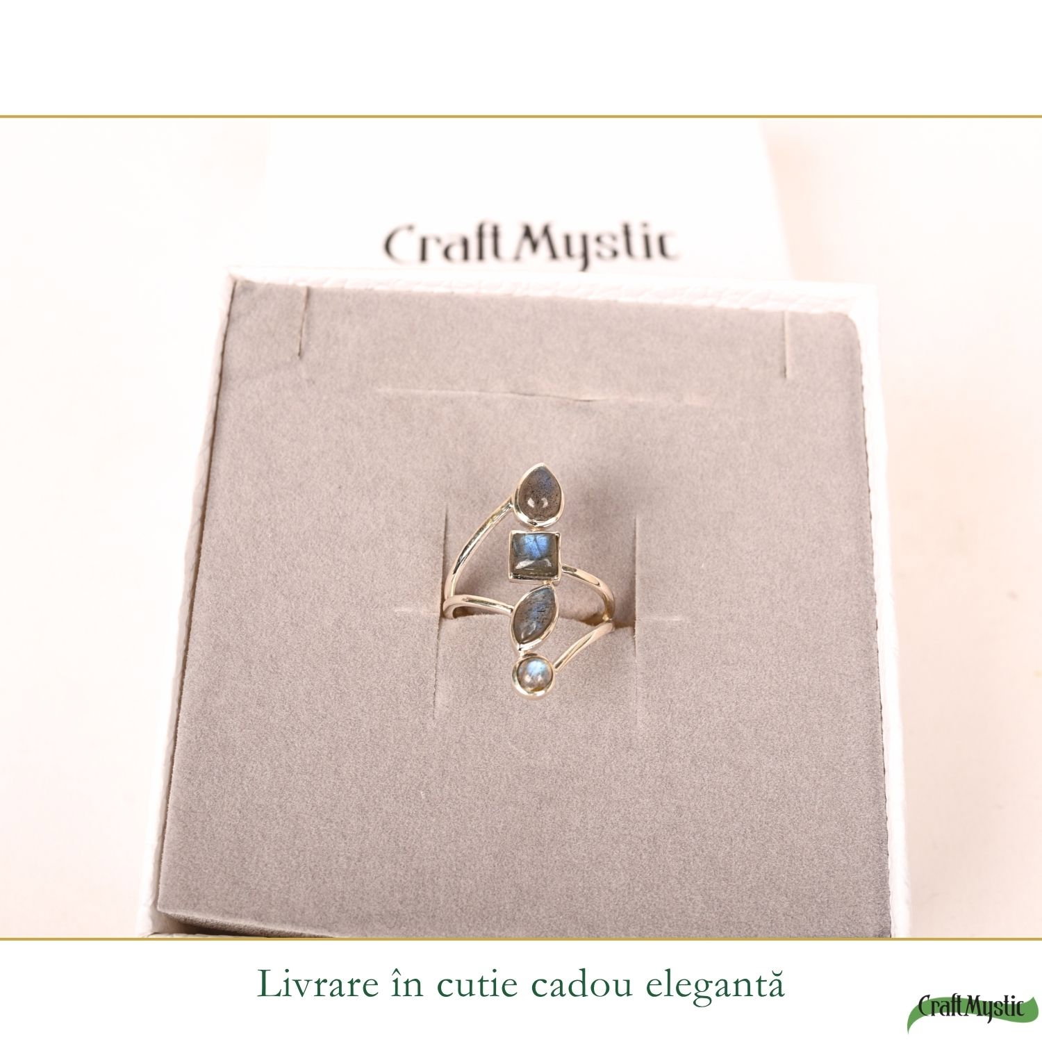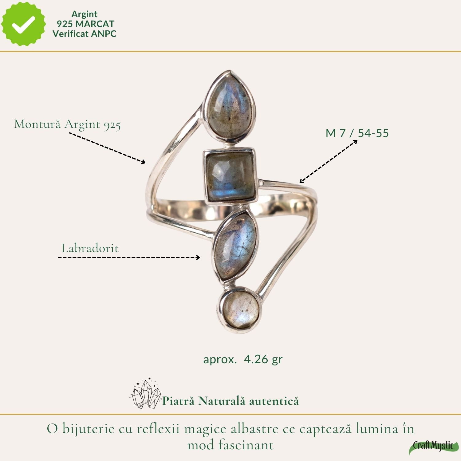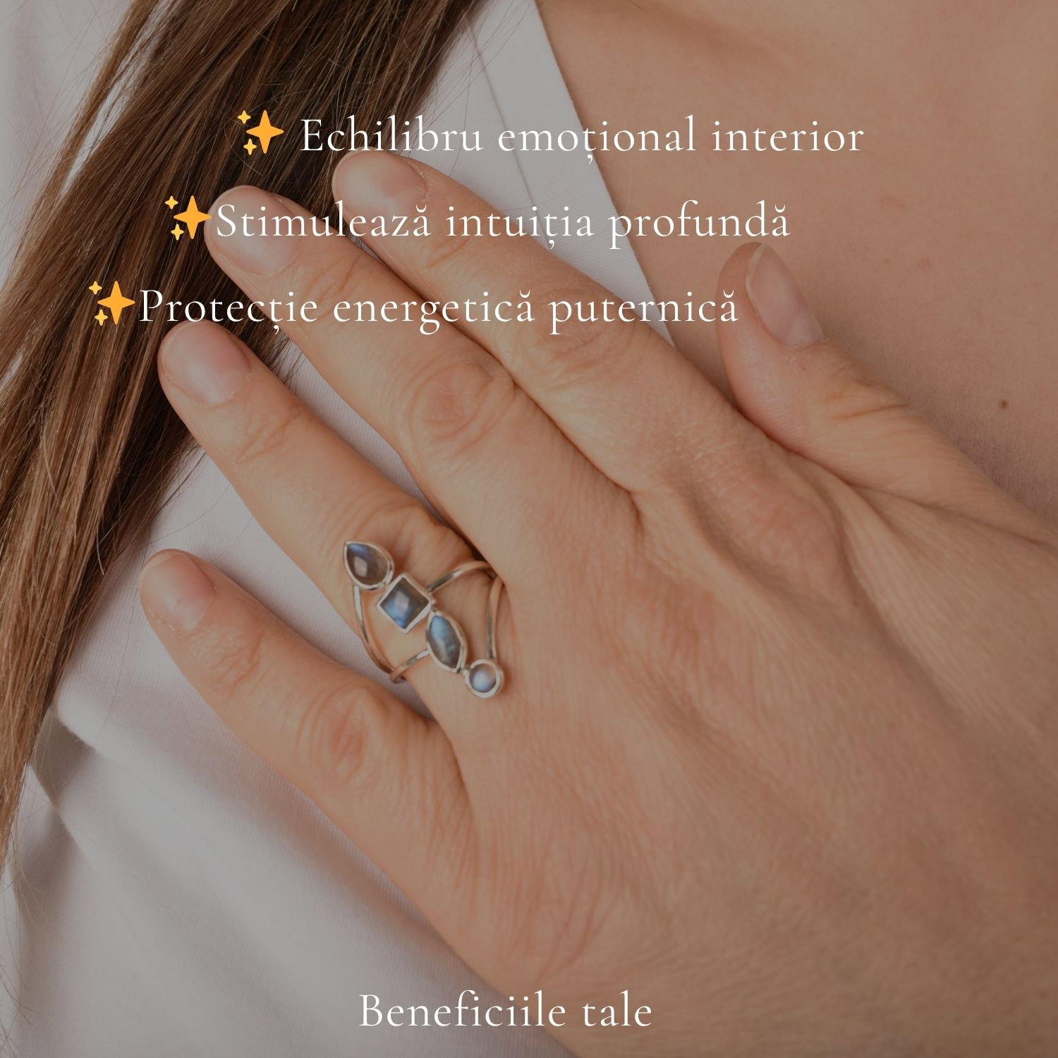 Inel din argint 925 cu labradorit și 4 pietre, o bijuterie ce simbolizează echilibrul și protecția. Cu reflexii misterioase și prezență elegantă, îl porți ca un detaliu care îți completează energia și stilul