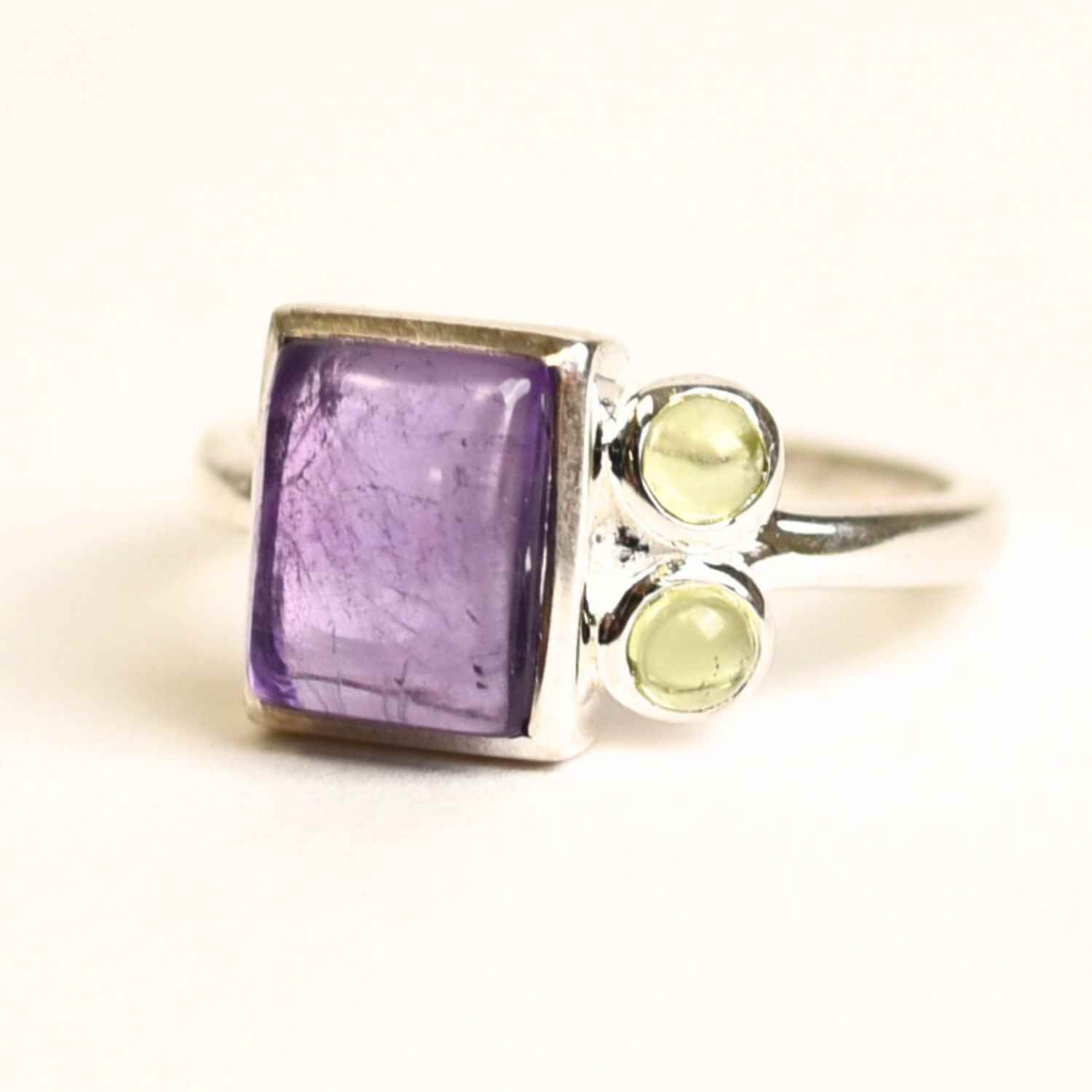 Acest inel din argint 925 îmbină frumusețea regală a ametistului cu energia vie a peridotului, creând un simbol al armoniei dintre liniște interioară și vitalitate. Forma pătrată a ametistului sugerează stabilitate și ordine, iar peridotul rotund aduce fluxul energiei pozitive, rezultând o bijuterie ce inspiră echilibru și încredere în forțele proprii.