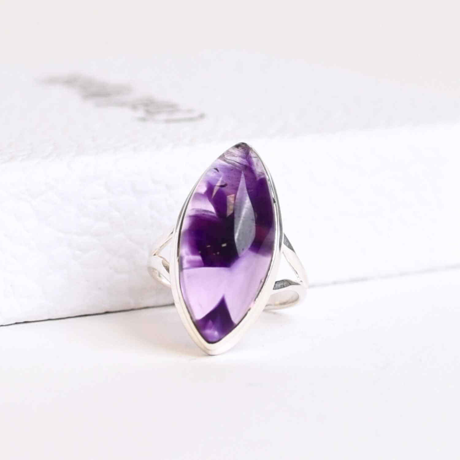 Un inel ce poartă misterul cosmic – piatra de Atomic Trapiche Ametist, rară și spectaculoasă, îmbină nuanțele de violet profund cu fascinația formelor geometrice naturale. Forma marquise (ochi sau navetă) simbolizează protecția divină, viziunea clară și conexiunea cu energiile universului, făcând ca acest inel să devină un talisman spiritual de putere și echilibru.