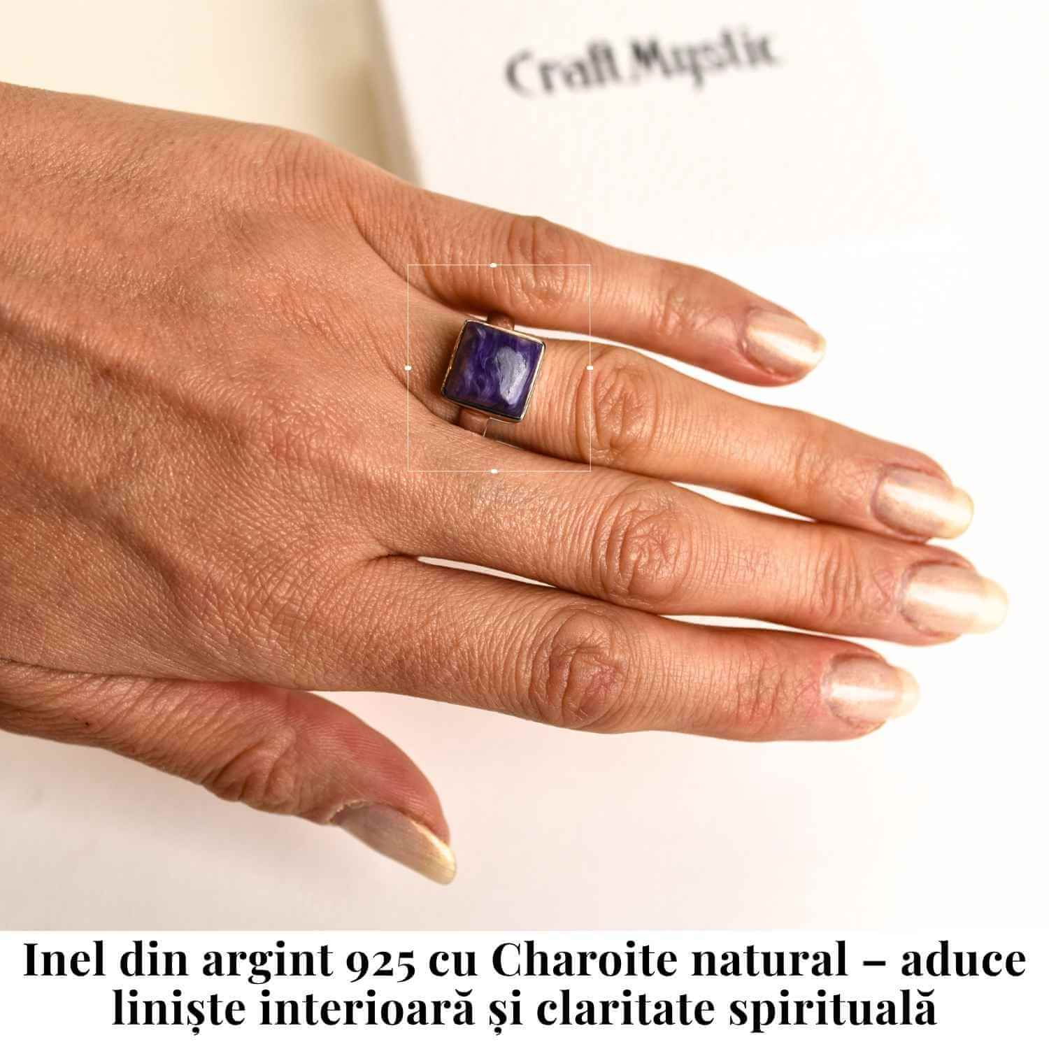 Un inel cu Charoite naturală montată într-o formă pătrată, simbol al stabilității, echilibrului și fundamentului solid în viață. Piatra violet cu reflexe misterioase aduce un aer mistic și oferă purtătoarei protecție energetică și transformare interioară. Este un talisman al curajului sufletesc și al echilibrului între minte și inimă.