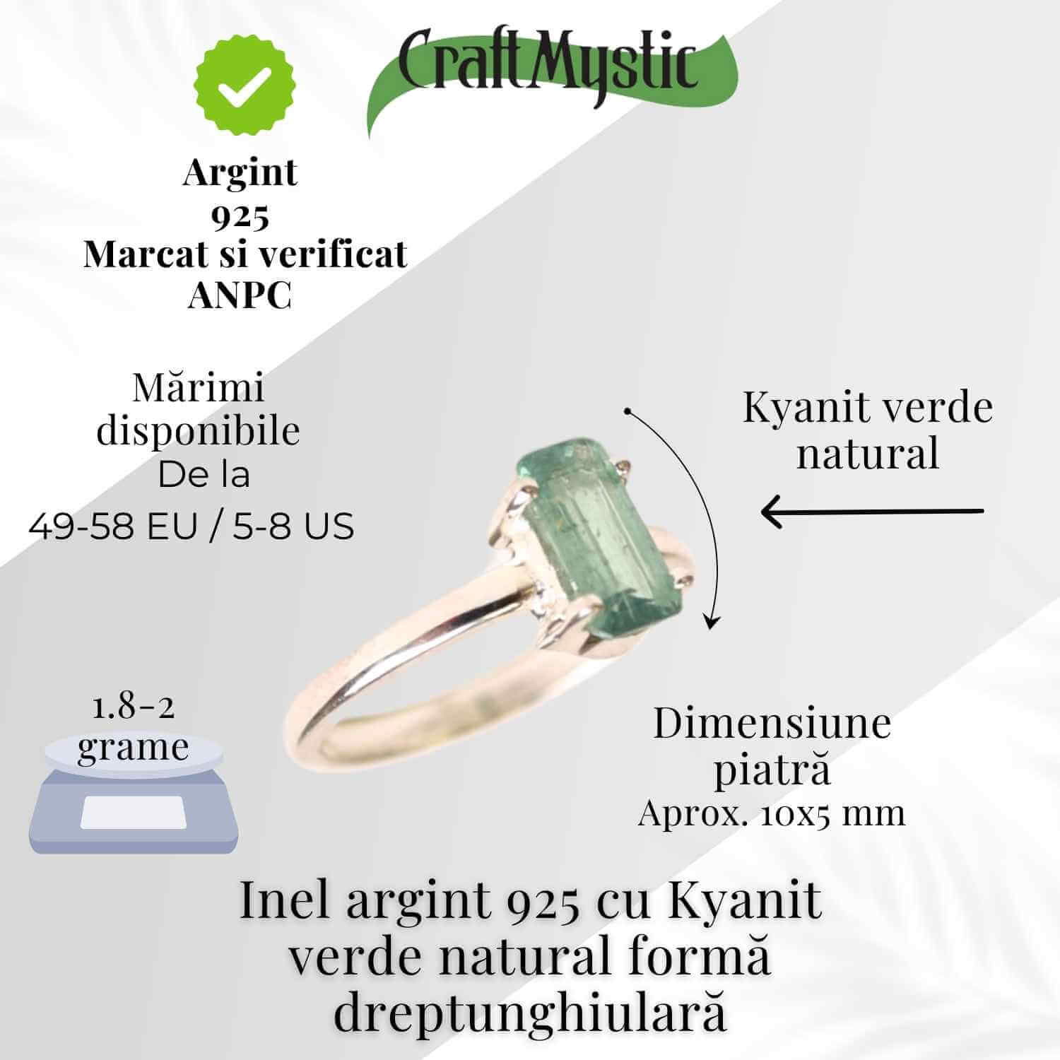 Descoperă liniștea clară a Kyanitului verde – piatra armoniei interioare și a comunicării sincere. Montat într-un inel elegant din argint 925, Kyanitul tăiat dreptunghiular aduce o energie blândă de echilibrare, limpezind mintea și susținând deciziile înțelepte. O bijuterie fină, cu vibrație calmă, pe care o porți zilnic ca pe un ghid subtil către claritate.