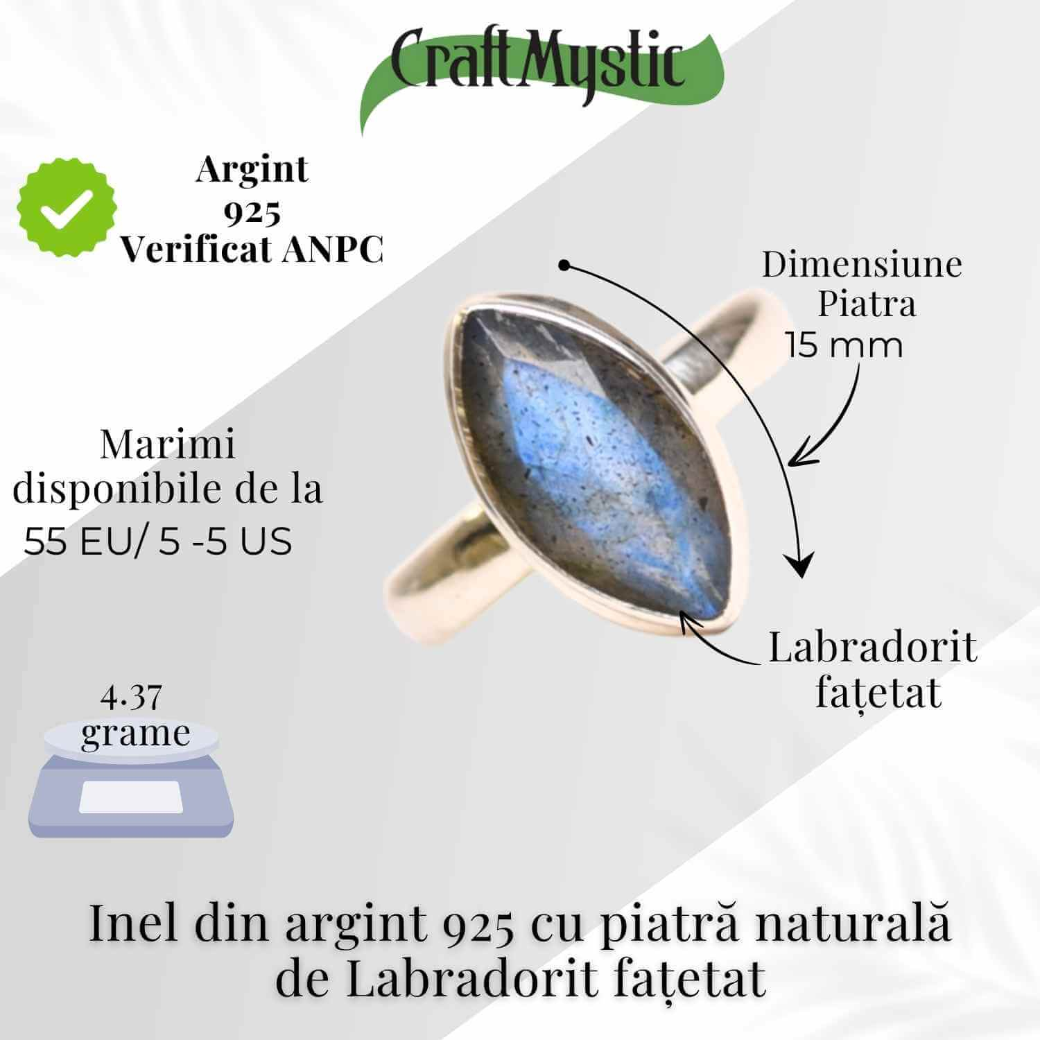 Acest inel din argint 925 cu Labradorit natural fațetat atrage prin reflexele sale albastre, asemenea unei lumini magice ascunse. Forma marquise, cunoscută și ca ochiul divin, este un simbol al clarviziunii, protecției și înțelepciunii interioare. Împreună, piatra și forma devin un talisman al intuiției, protecției energetice și al transformării sufletești.