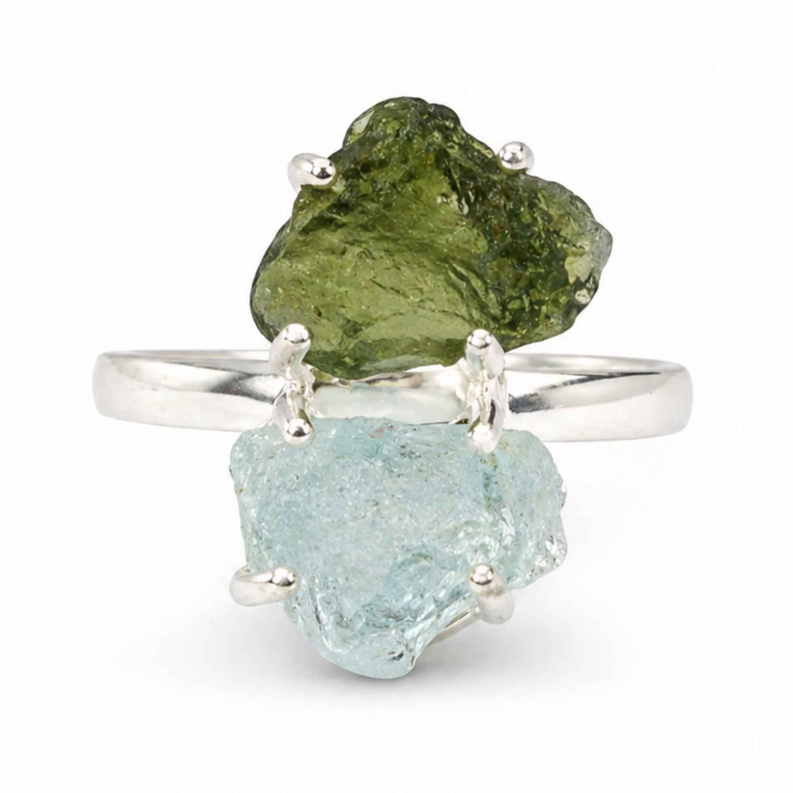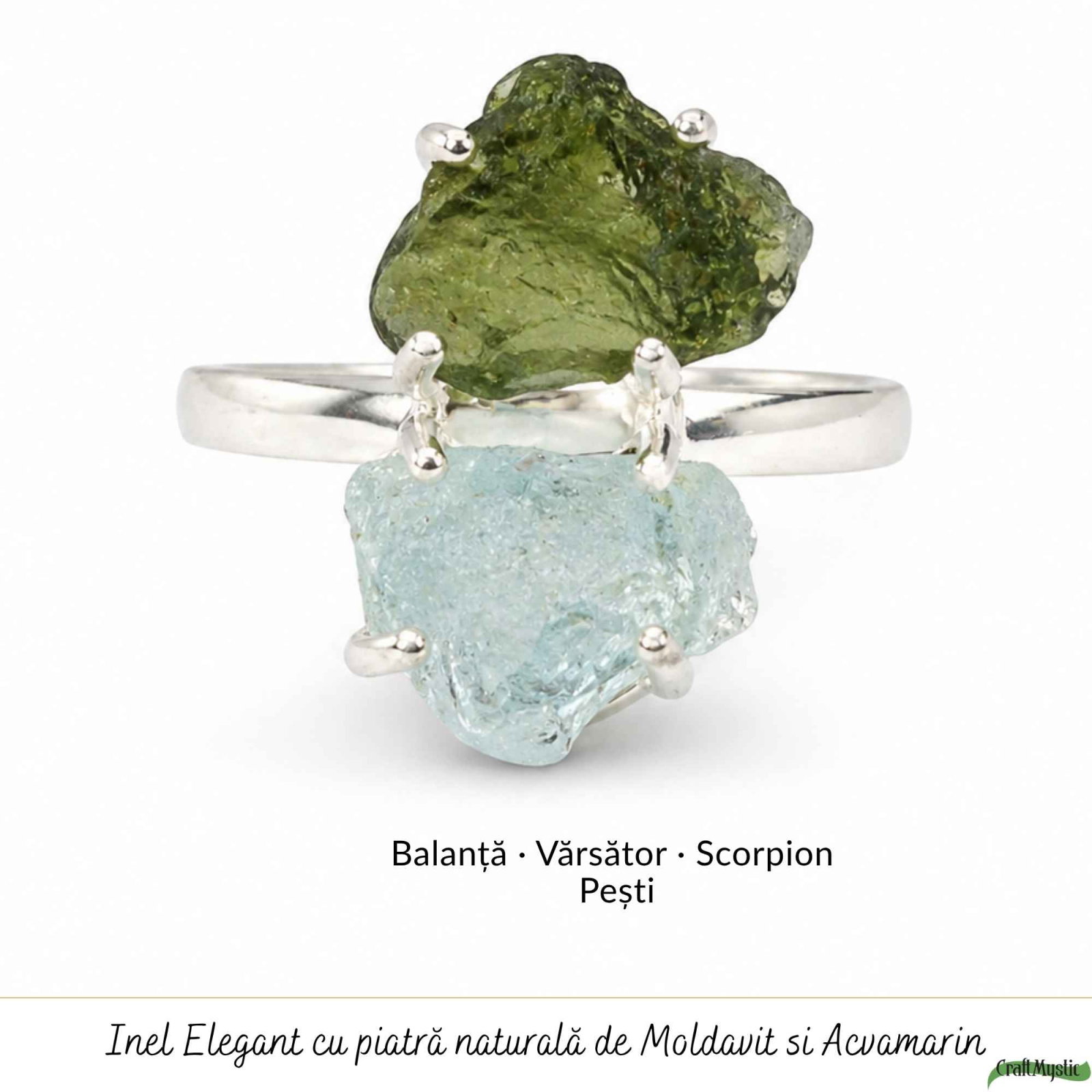 Inel din argint 925 cu moldavit și acvamarin – o combinație unică de transformare și liniște. Solid și expresiv, îți oferă claritate, echilibru și un stil autentic, plin de sens.