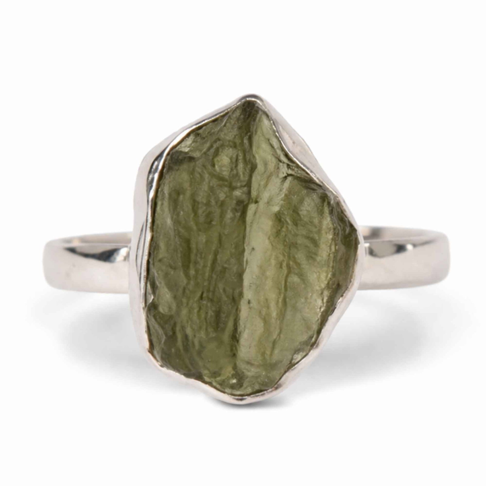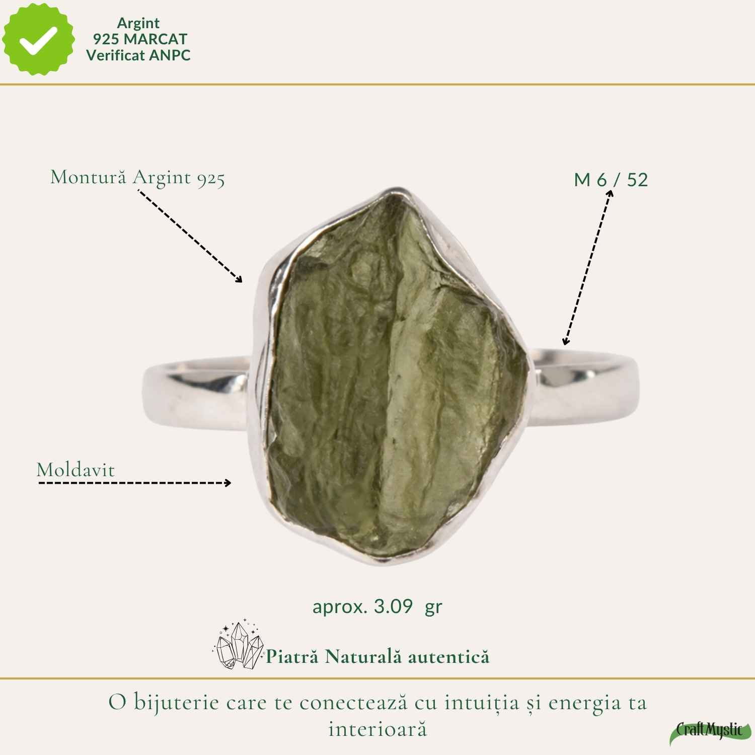 Un inel din argint 925 cu moldavit brut natural, o piatră rară născută din energie cosmică. Forma sa unică reflectă autenticitatea pură, iar vibrația sa susține transformarea și claritatea interioară. Este ușor de purtat, dar cu o prezență profundă – o bijuterie care te însoțește cu sens.