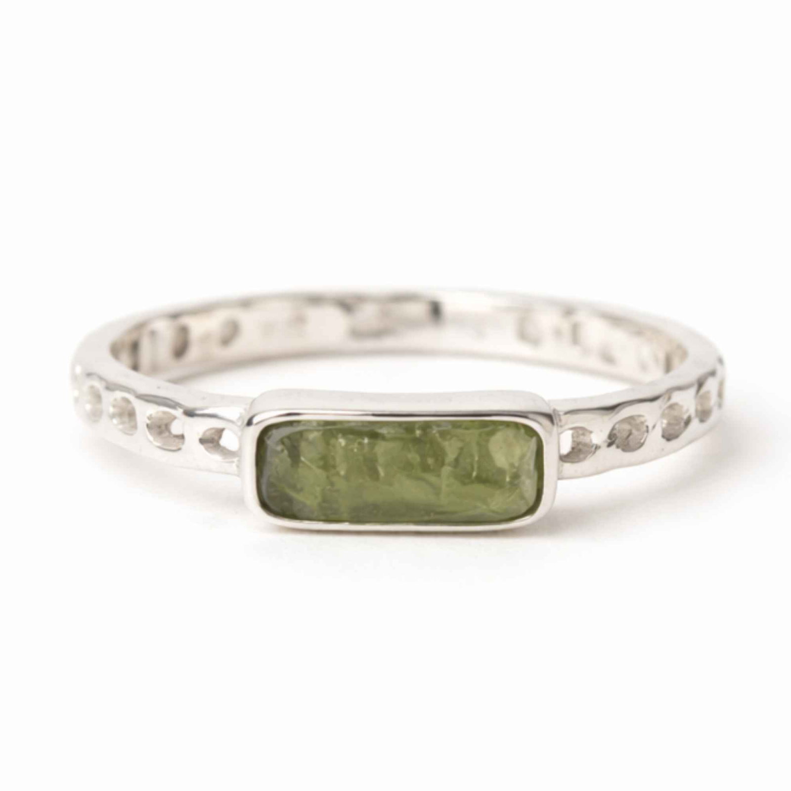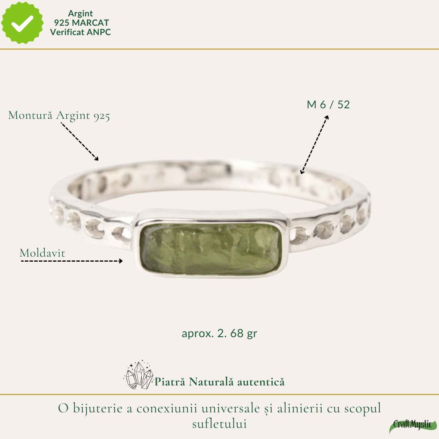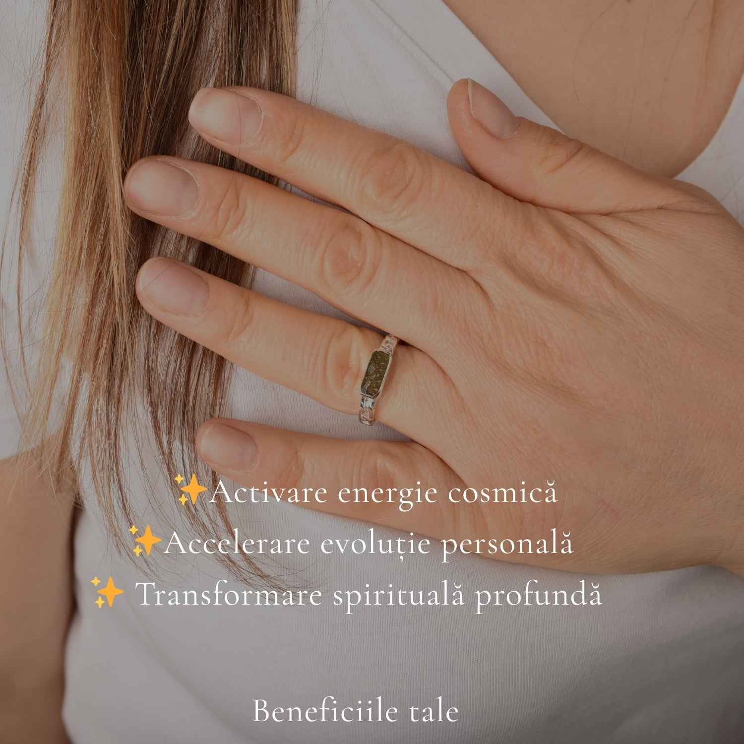 Inel din argint 925 cu moldavit brut în formă dreptunghiulară, o piesă cu energie puternică de transformare și stabilitate. Te susține în găsirea clarității și în asumarea direcției tale, fiind ușor de purtat, dar cu impact profund.