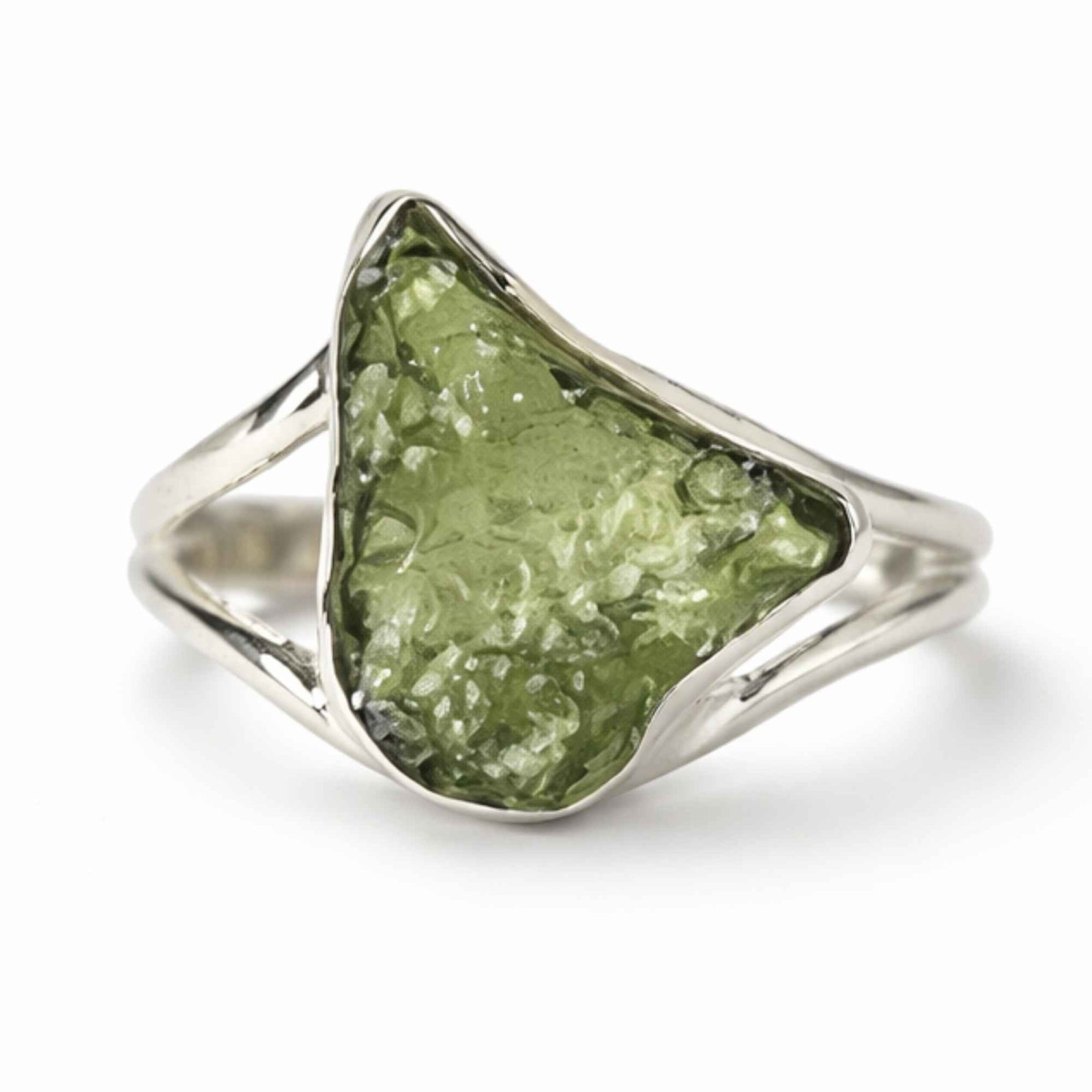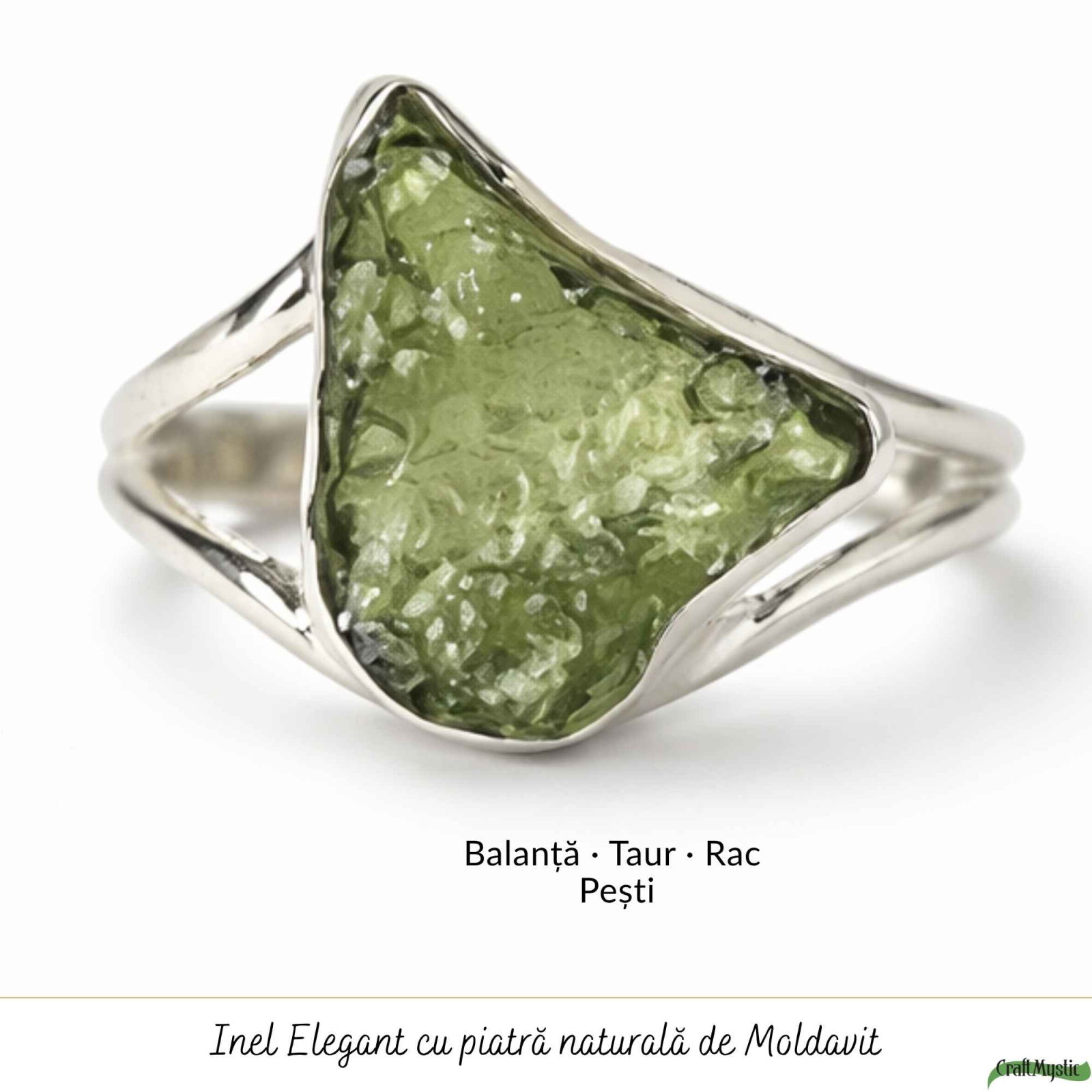 Un inel din argint 925, cu moldavit brut natural – o piatră rară, cu energie intensă și origine cosmică. Forma sa neuniformă reflectă autenticitatea pură, iar prezența sa solidă îl face să îl simți ca pe un simbol al transformării tale.