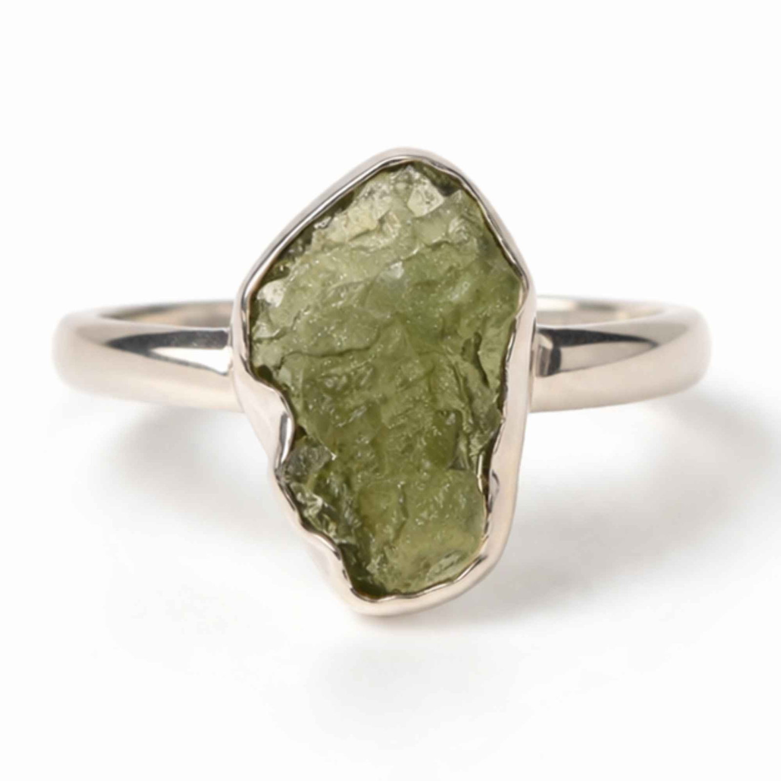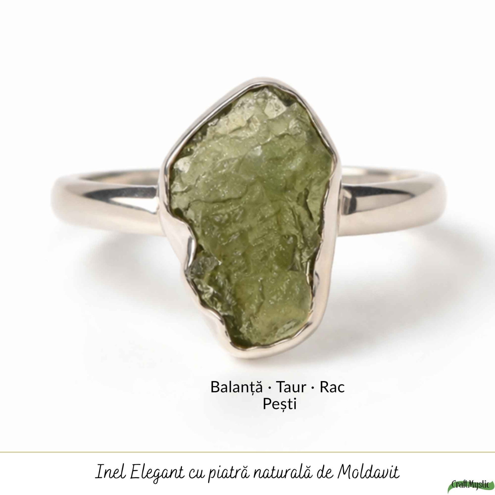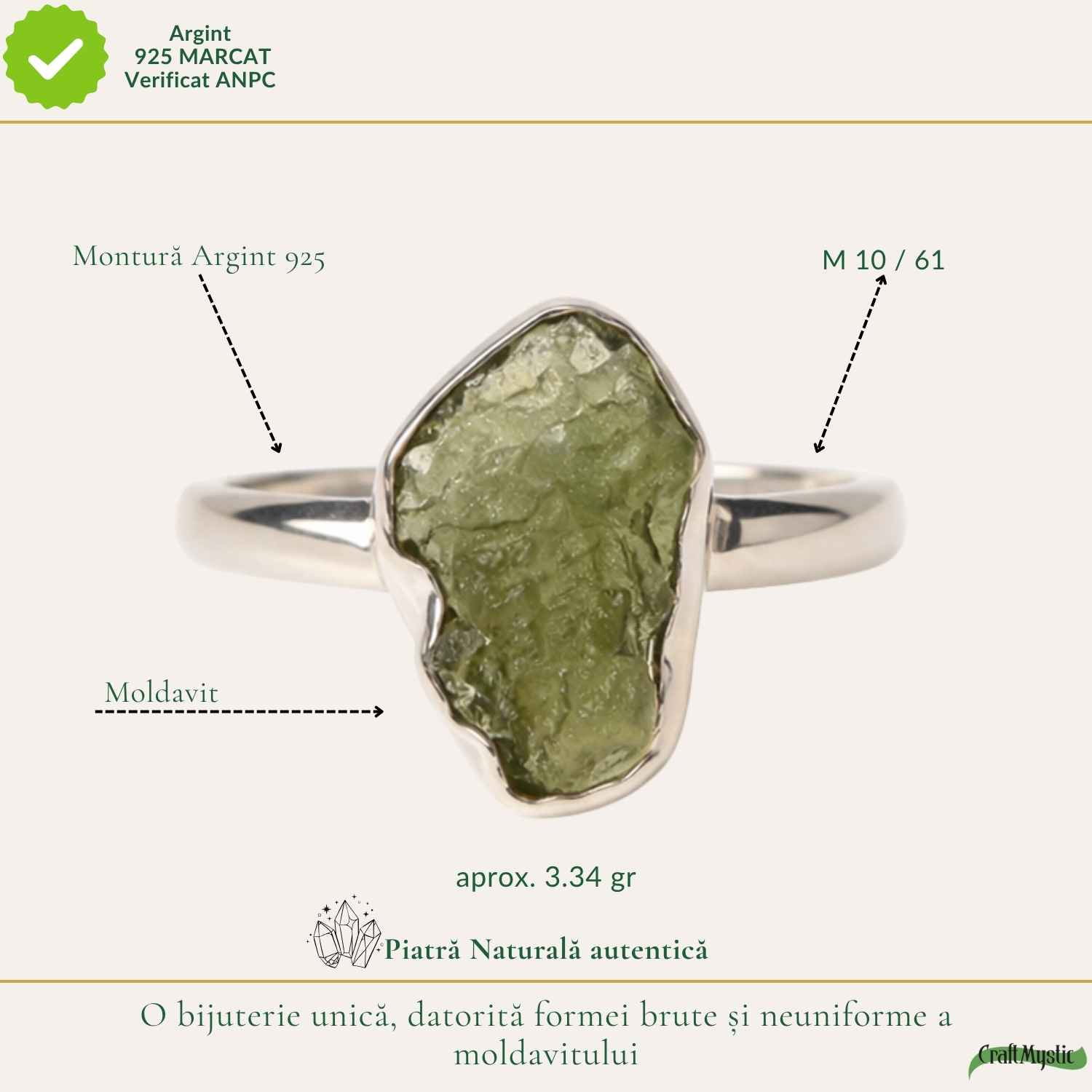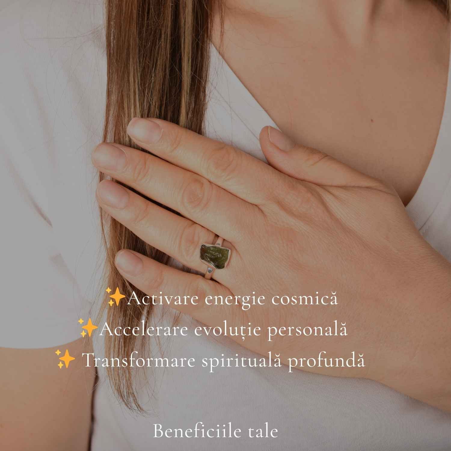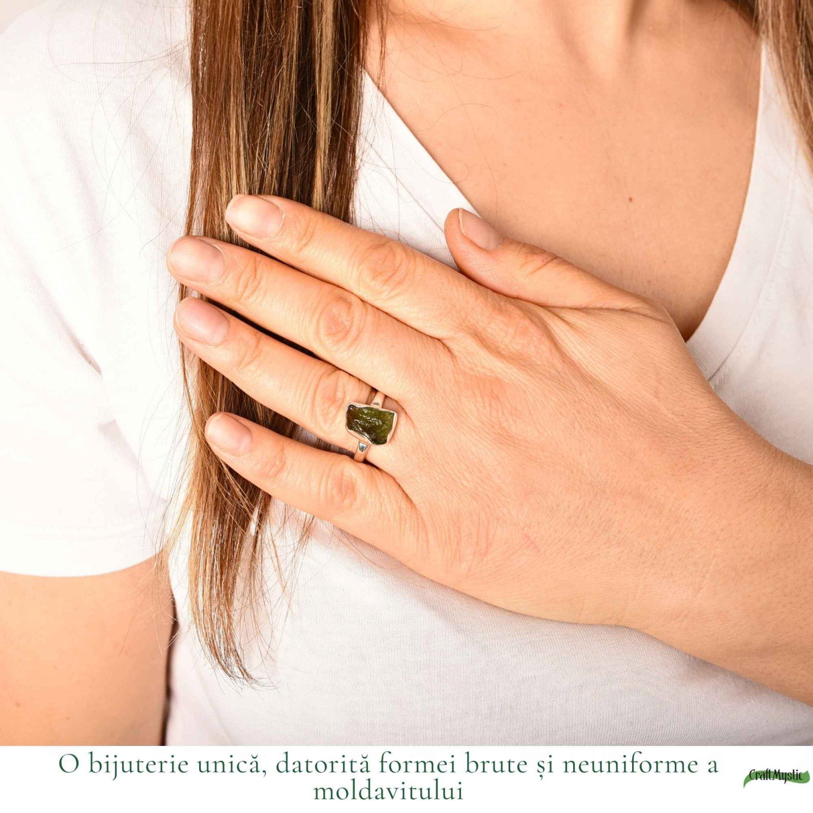 Un inel din argint 925 cu moldavit brut natural, o piatră rară născută din energie cosmică. Forma sa unică și vibrația intensă susțin transformarea și claritatea interioară. Este ușor, dar cu o prezență puternică – genul de bijuterie care se simte dincolo de aspect.