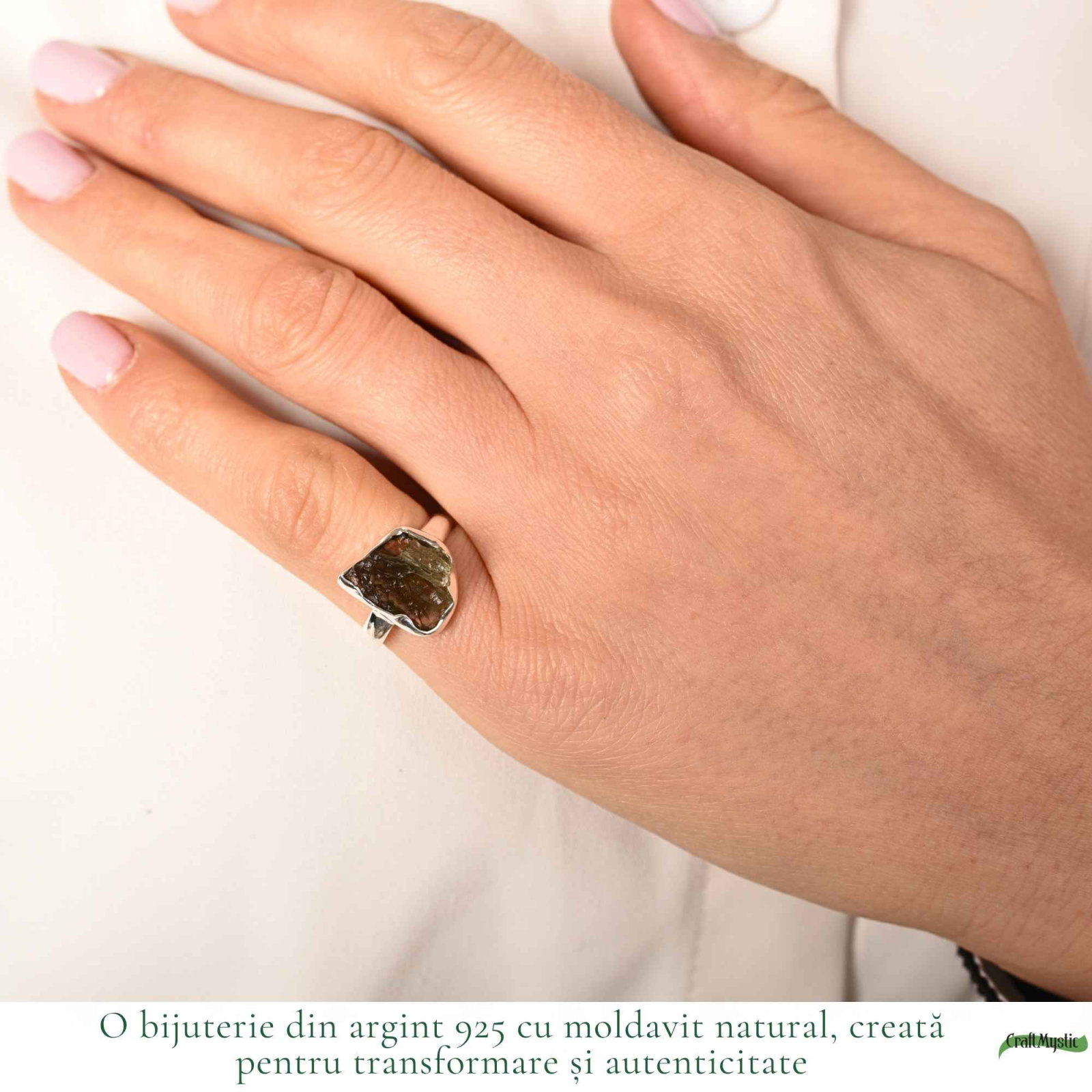 Un inel din argint 925 cu moldavit brut natural, o piatră rară formată din energie cosmică. Forma sa unică păstrează autenticitatea naturii, iar vibrația sa susține transformarea și claritatea interioară. Este ușor și confortabil, dar cu o prezență profundă – o bijuterie pe care o simți cu adevărat.