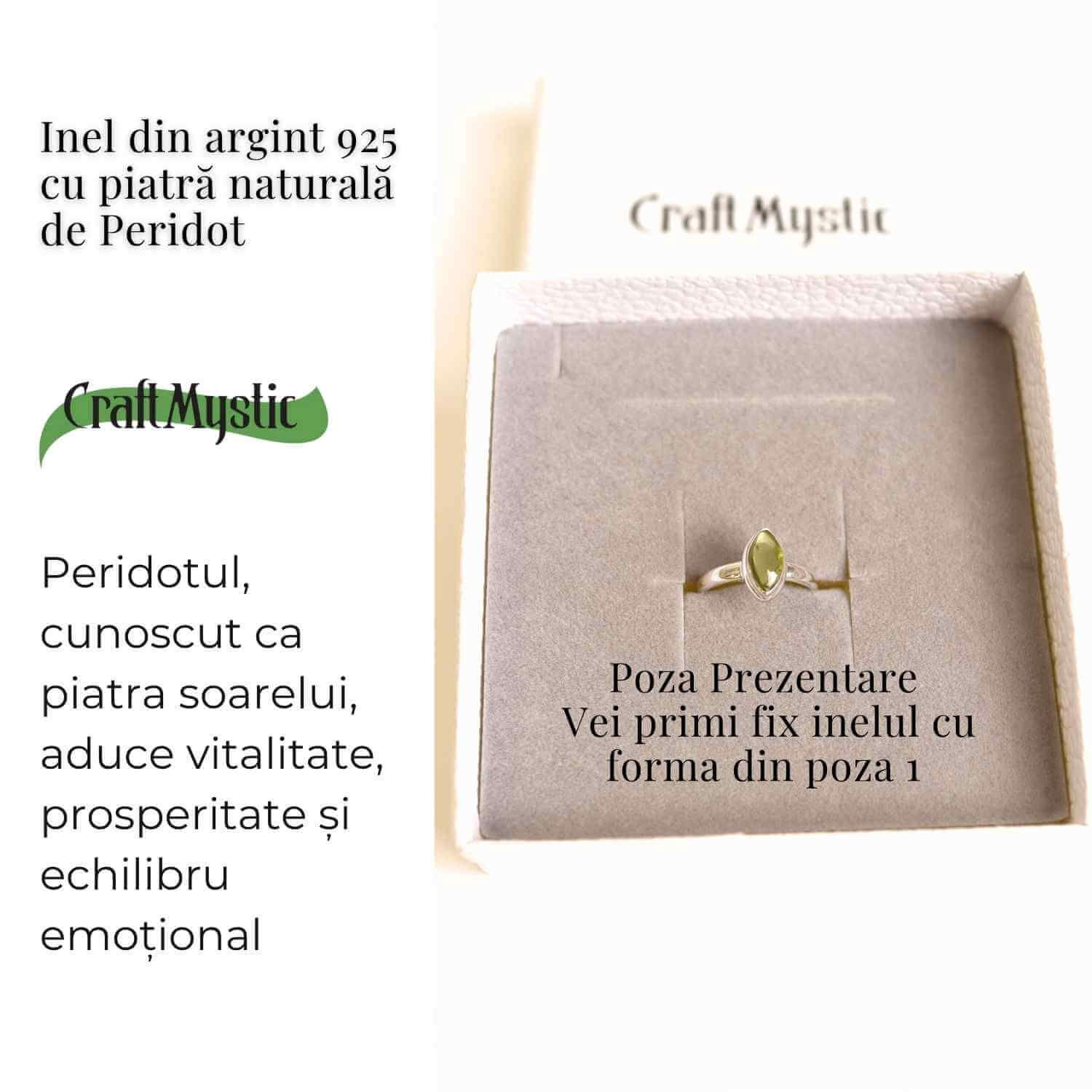 Acest inel din argint 925 cu piatră naturală de Peridot în formă de marquise aduce o energie solară și regeneratoare. Forma marquise, asemănătoare unei frunze sau ochi protectiv, simbolizează renașterea, claritatea și intuiția interioară, amplificând vibrațiile de vitalitate și protecție. Purtat pe deget, acest inel devine o amuletă a luminii, atrăgând prosperitatea și echilibrul emoțional.