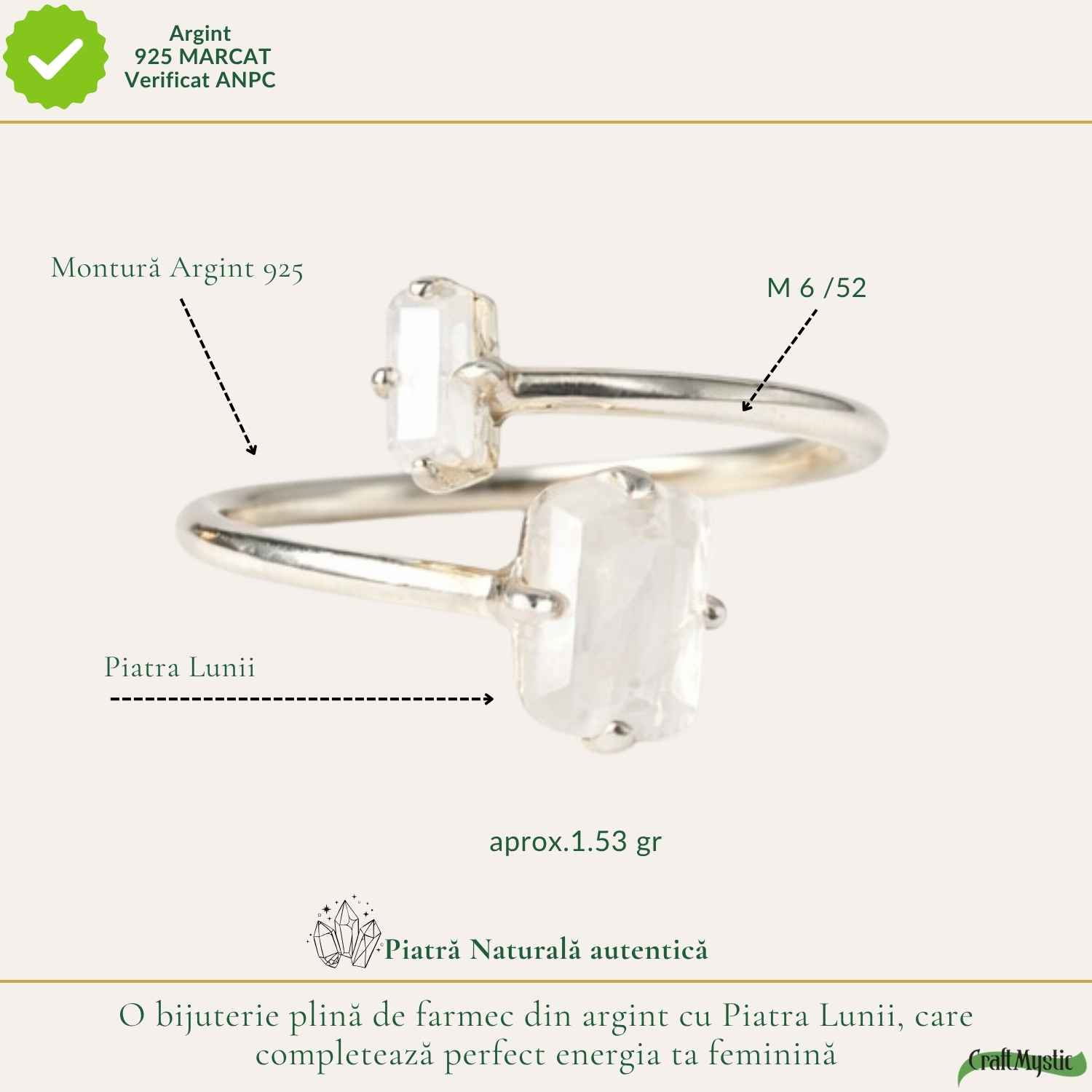 Inelul ajunge la tine in cutie cadou CraftMystic, pregatit sa fie oferit sau purtat imediat. Fiecare detaliu este atent pregatit.