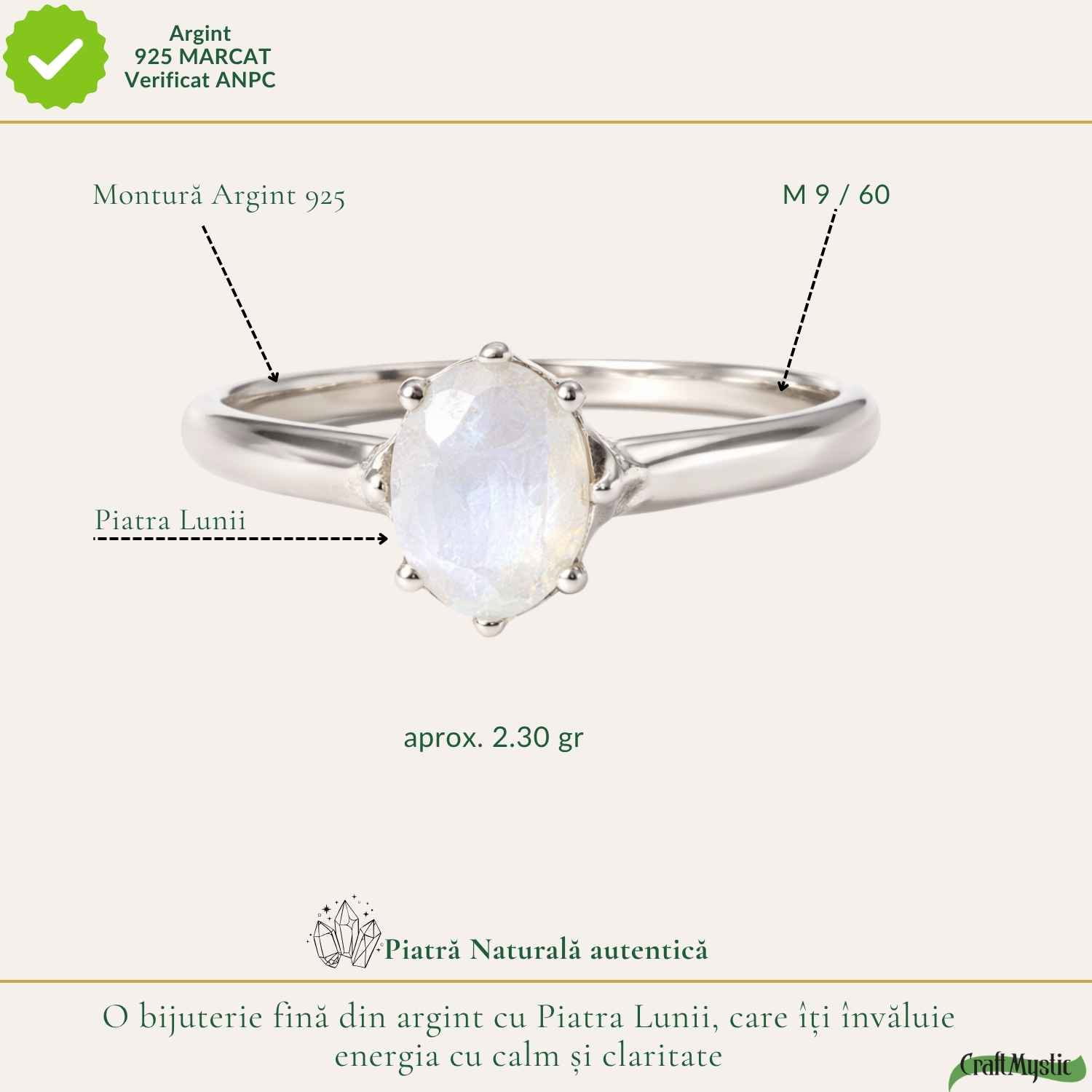Un inel delicat din argint 925 cu piatra lunii naturală, fațetată oval, creat pentru femeia care își ascultă intuiția și își dorește echilibru interior. Ușor și plin de simbol, este bijuteria pe care o porți zilnic ca să rămâi conectată cu tine.