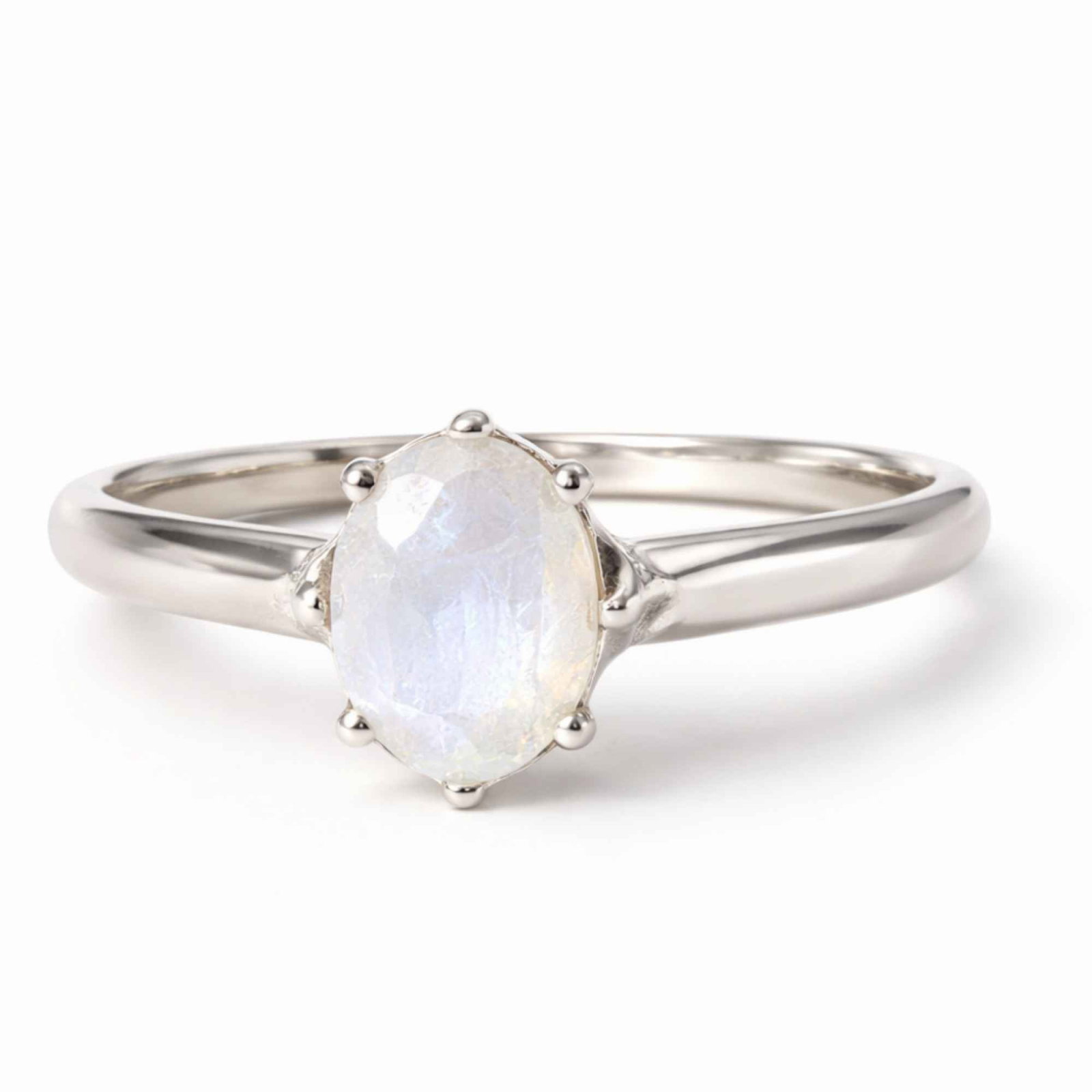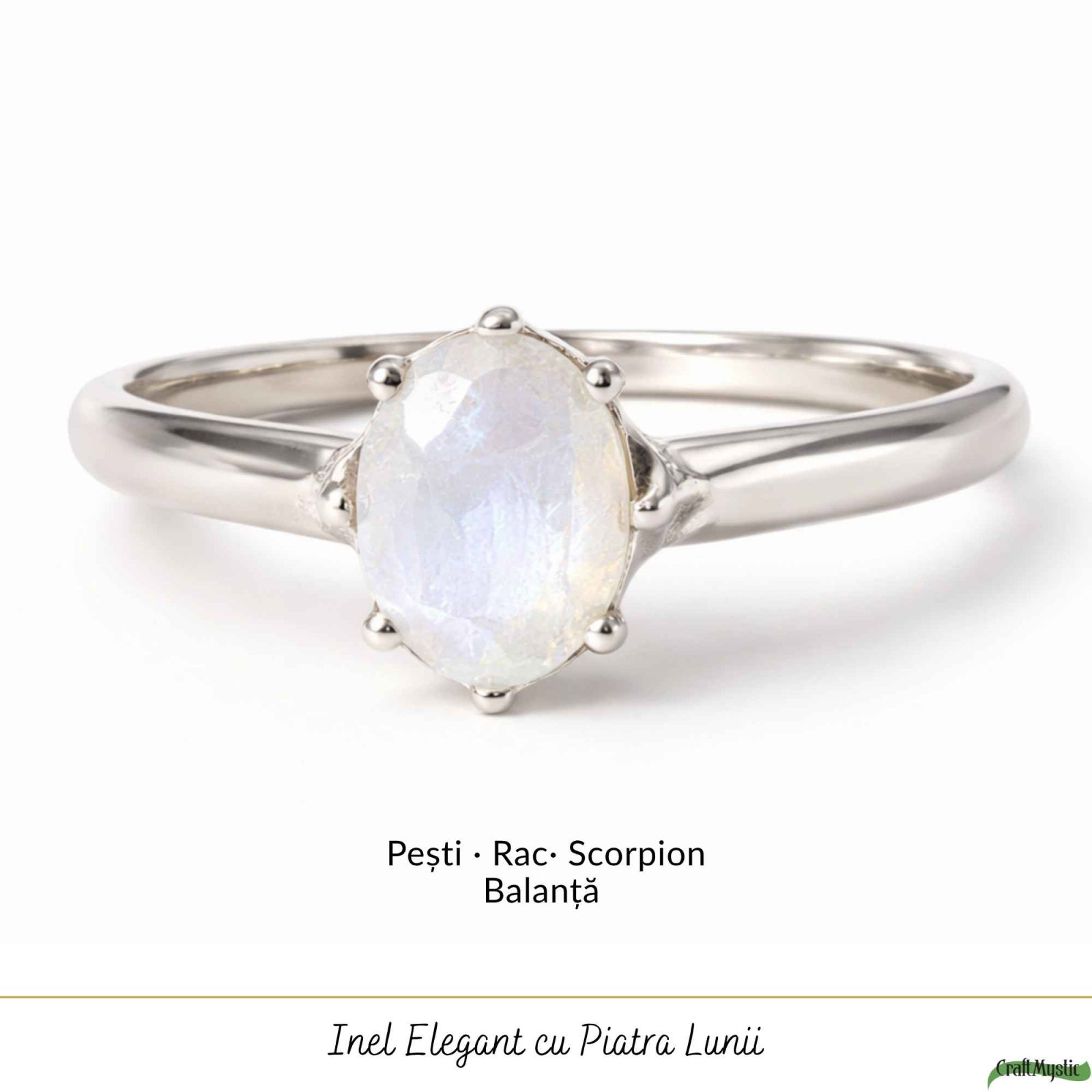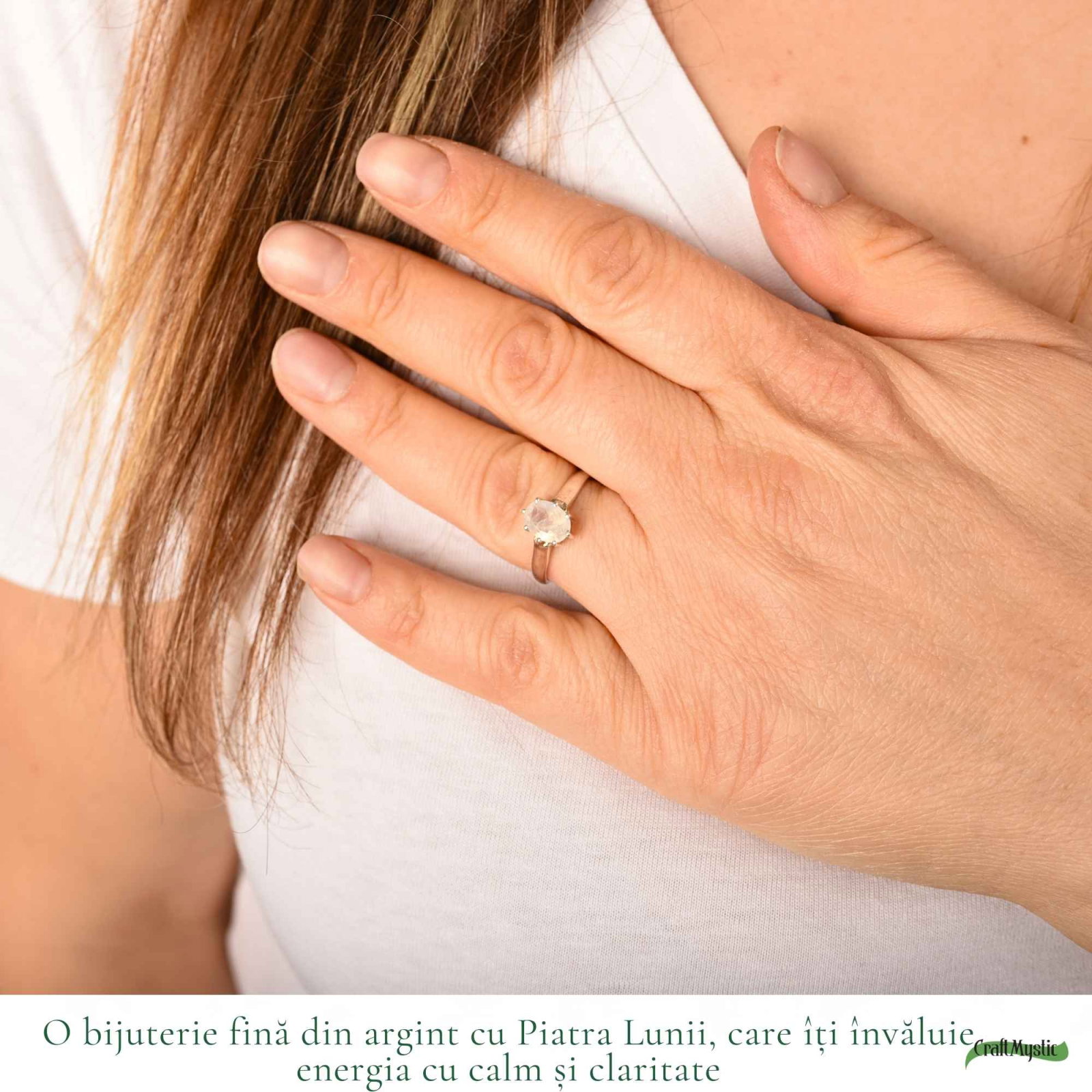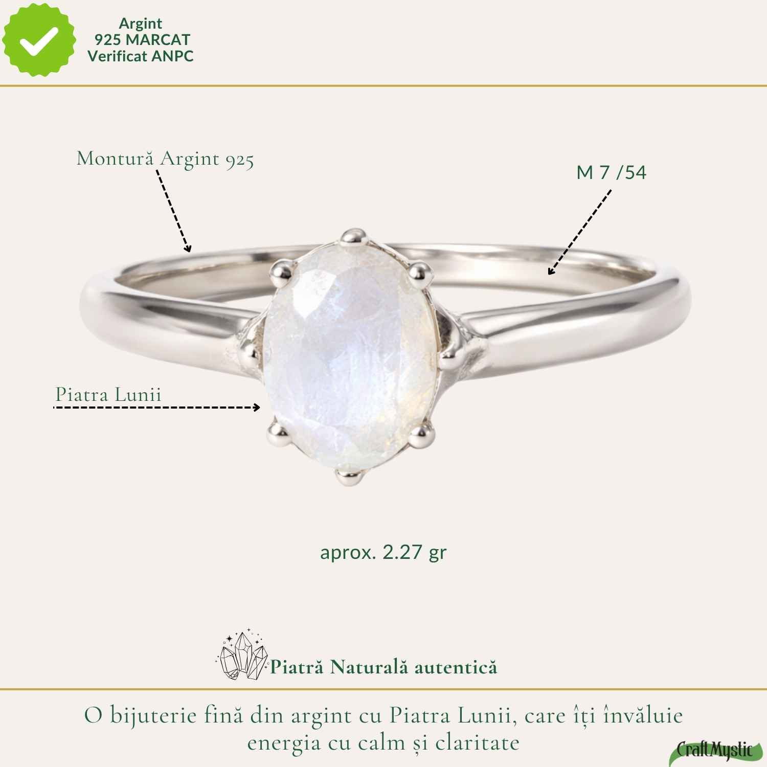 Un inel delicat din argint 925 cu piatra lunii naturală, fațetată oval, creat pentru femeia care își ascultă intuiția și își dorește echilibru interior. Ușor și plin de simbol, este bijuteria pe care o porți zilnic ca să rămâi conectată cu tine.
