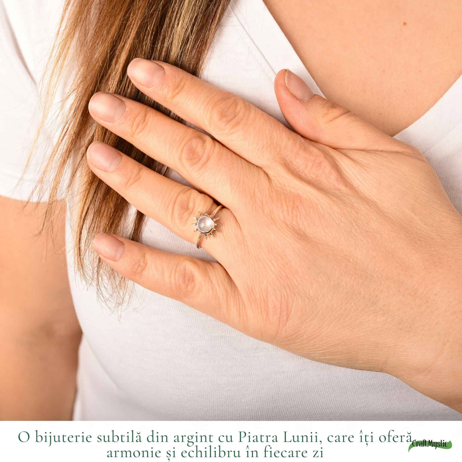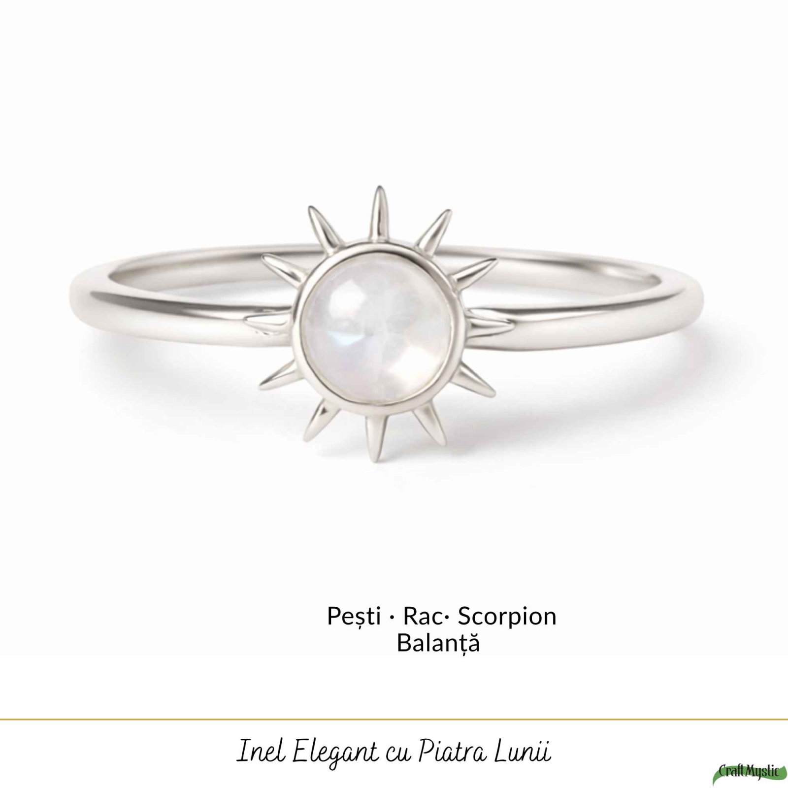 Un inel delicat din argint 925 cu Piatra Lunii naturală și simbol solar, creat pentru femeia care își ascultă intuiția și caută echilibru interior. Ușor și plin de semnificație, îți aduce o stare de calm, feminitate și lumină în fiecare zi.