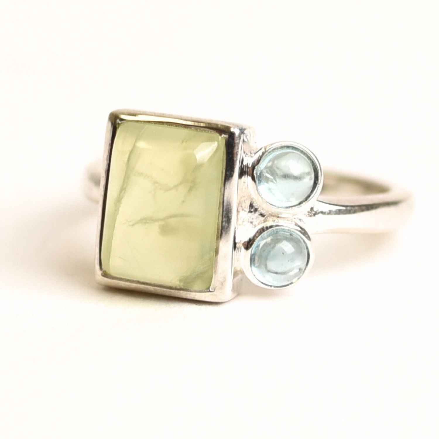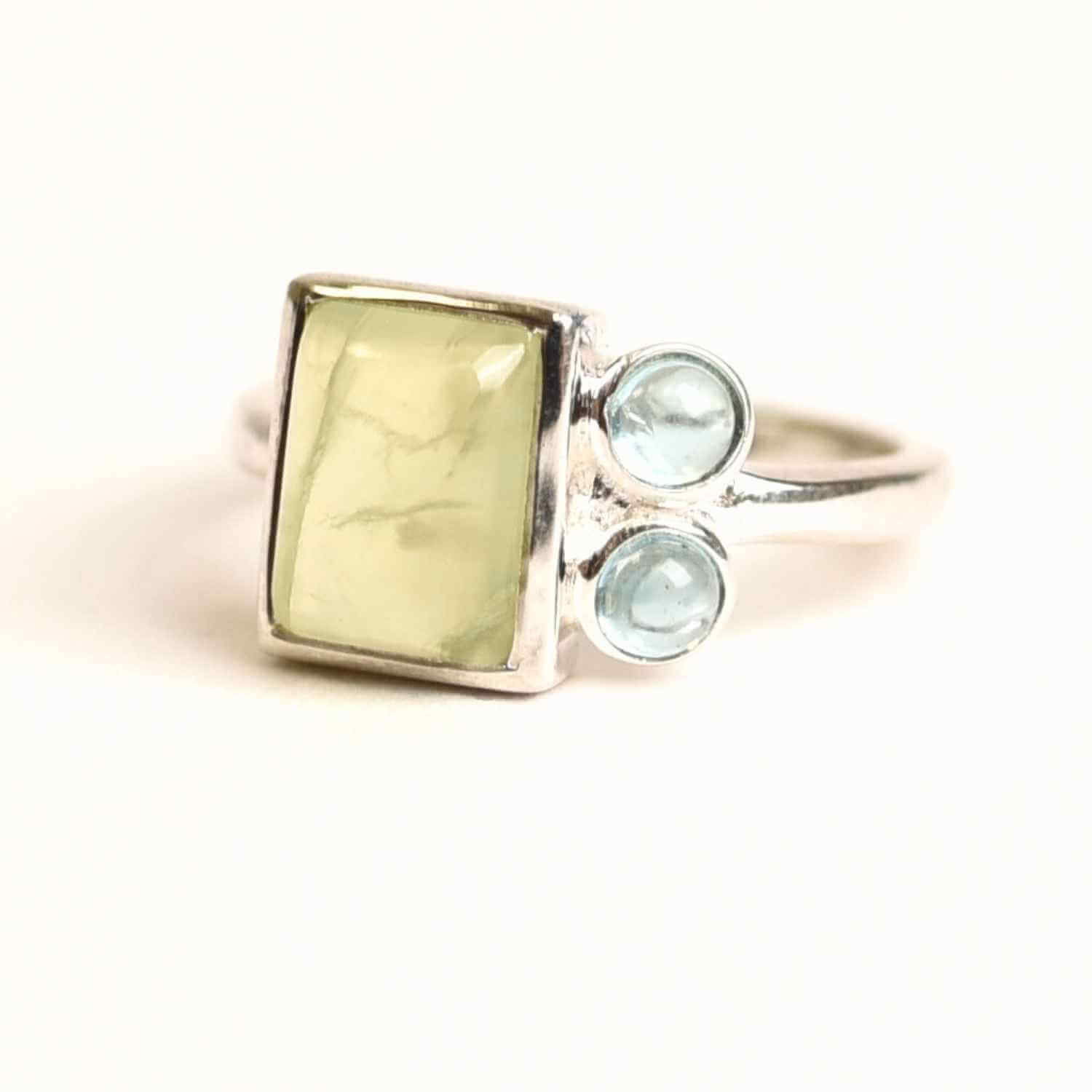 Acest inel din argint 925 cu Prehnite și Apatit albastru aduce un echilibru subtil între inimă și minte. Prehnitul, cunoscut drept „piatra viselor și a vindecătorilor”, favorizează armonia și protecția, în timp ce Apatitul albastru deschide calea către claritate mentală și comunicare autentică. Împreună, cele două pietre creează o conexiune profundă între intuiție și rațiune, inspirând pace și înțelepciune.