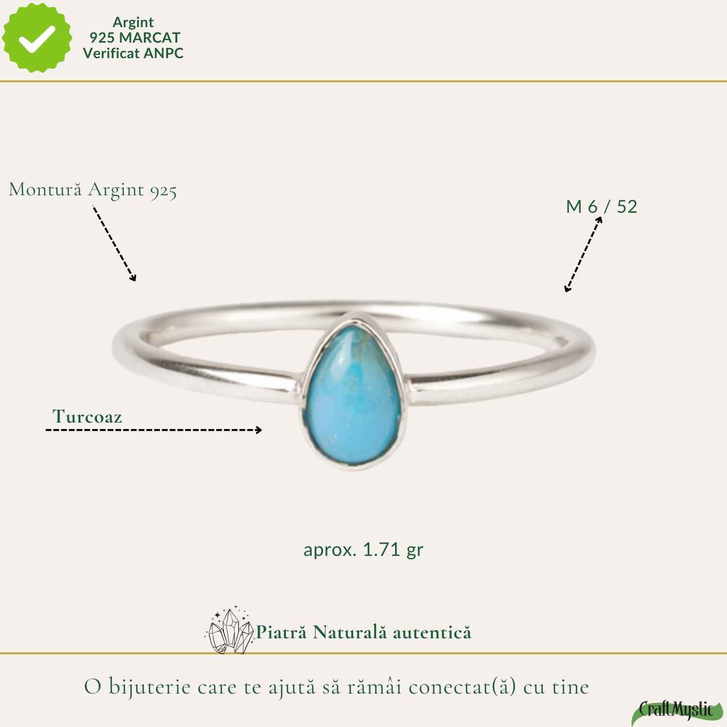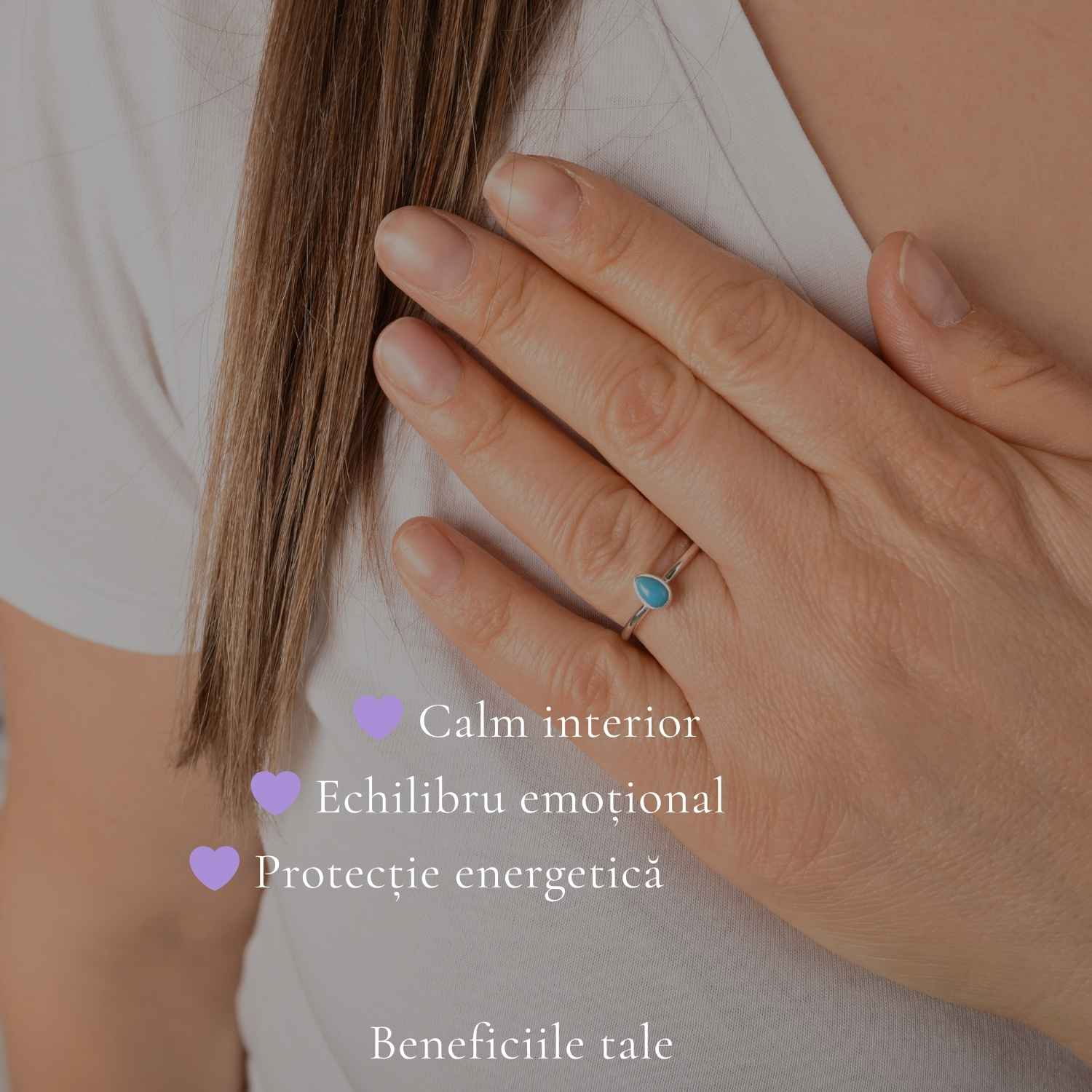 Un inel delicat din argint 925 cu turcoaz în formă de lacrimă, simbol al emoției și echilibrului. Ușor și fin, te însoțește discret și îți aduce o stare de liniște în fiecare zi.