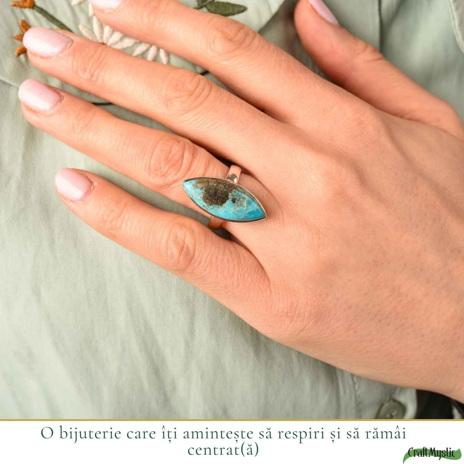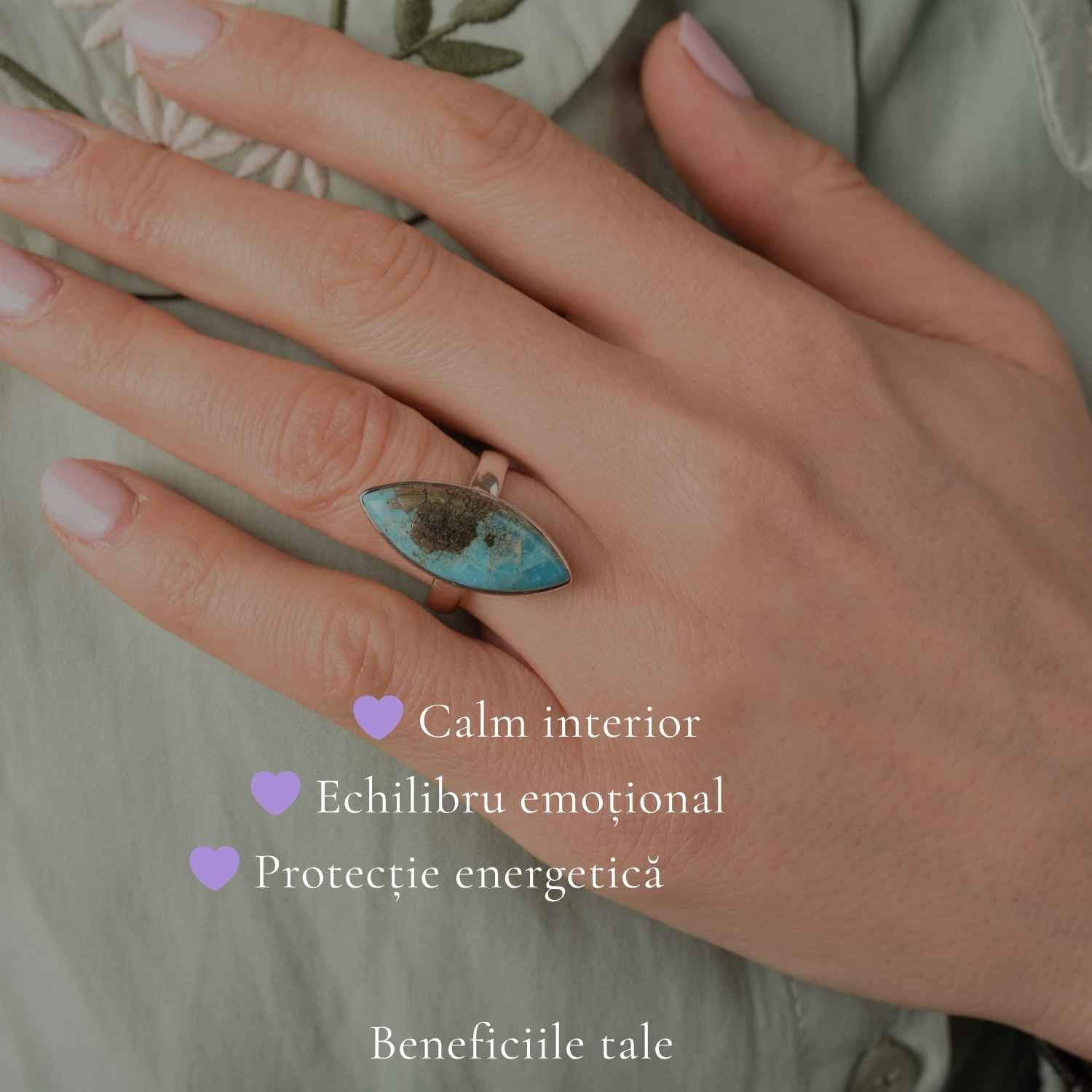 Un inel delicat din argint 925 cu turcoaz și pirită, care aduce protecție și echilibru în fiecare zi. O piesă fină, dar cu energie puternică, pe care o simți de fiecare dată când o porți.