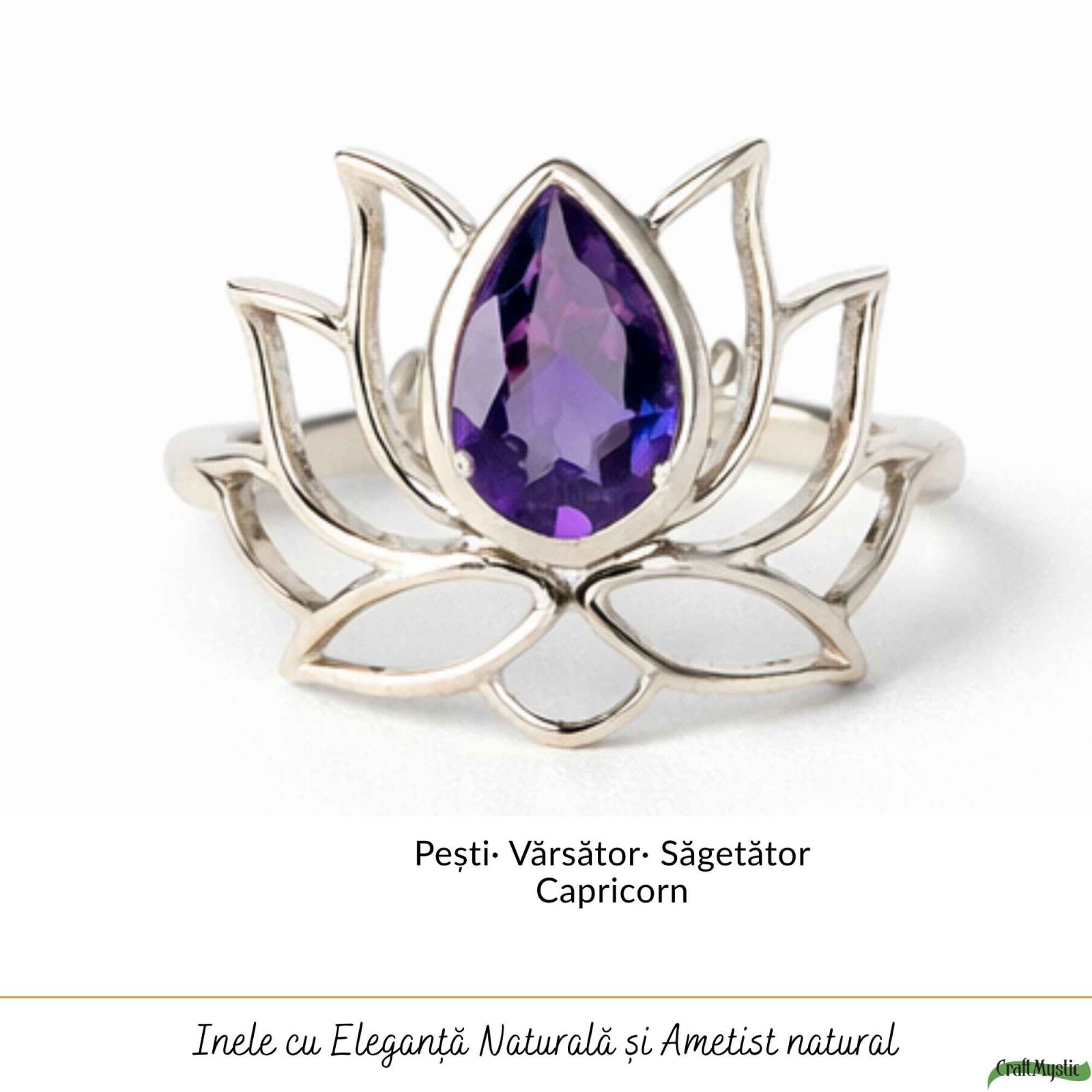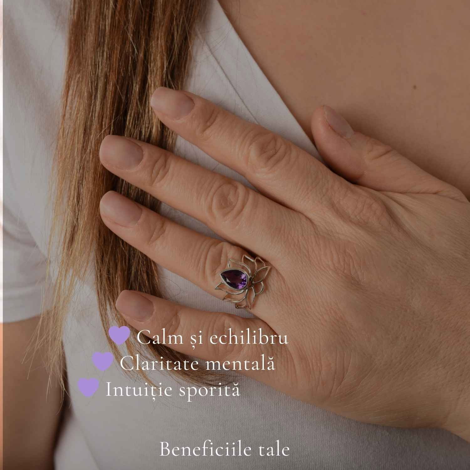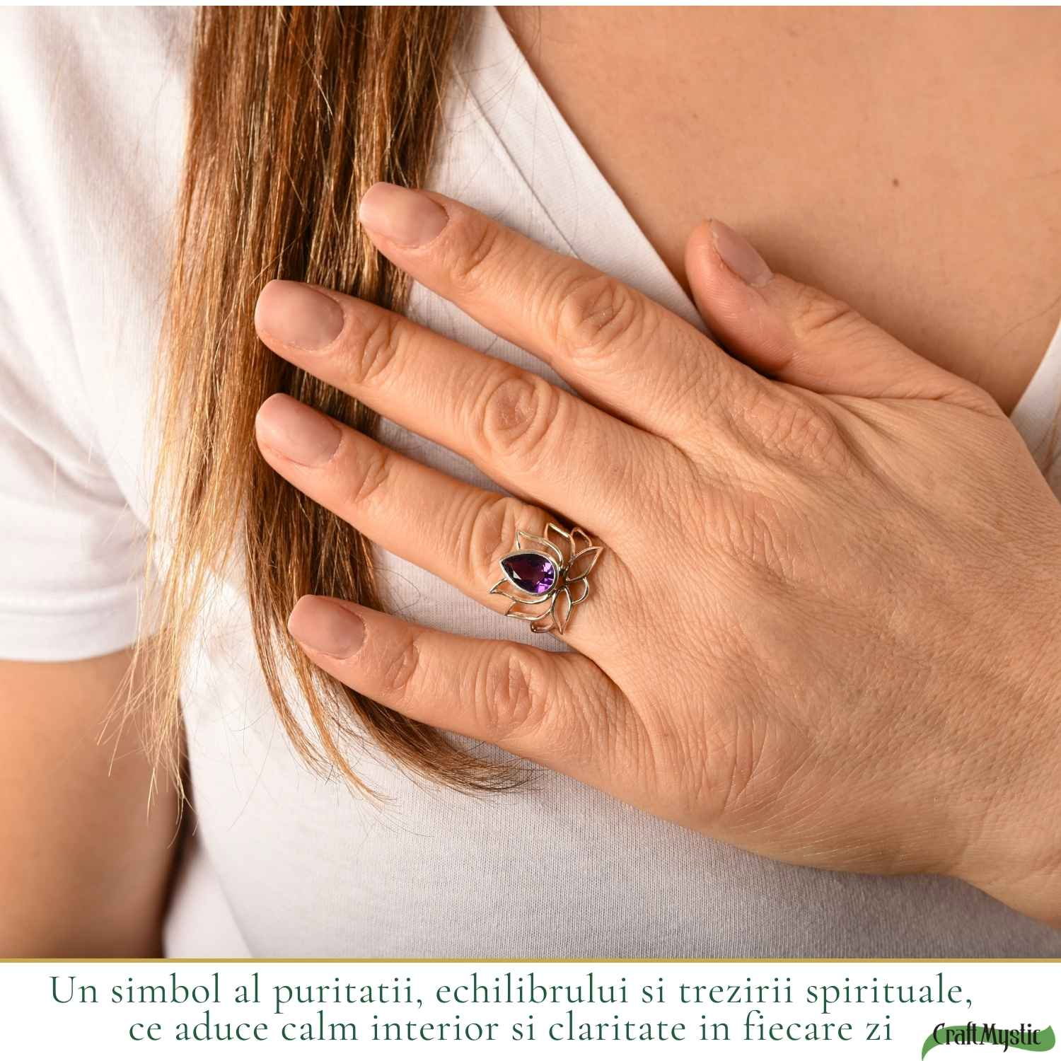 Acest inel din argint cu ametist natural, în forma delicată a florii de lotus, poartă energia liniștii și a renașterii interioare – exact acel mic ritual de echilibru pe care îl porți pe deget în fiecare zi.
