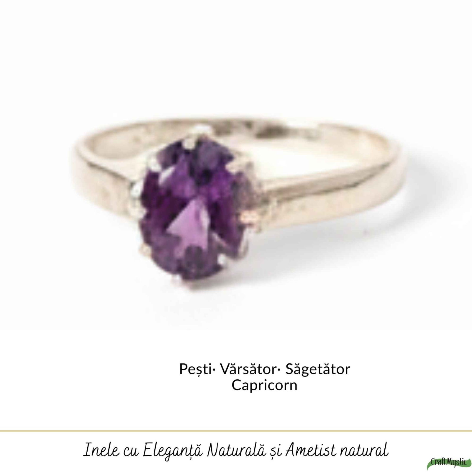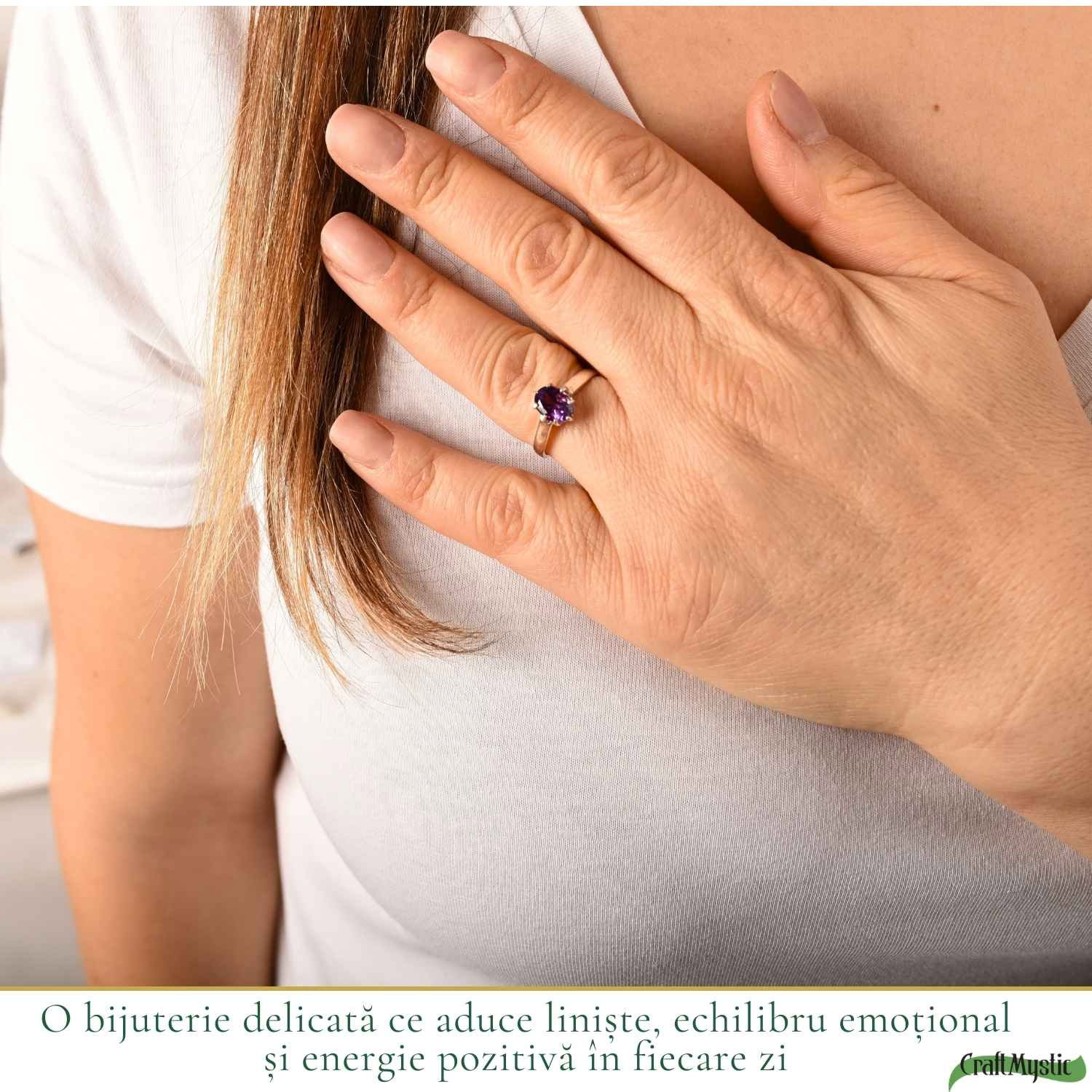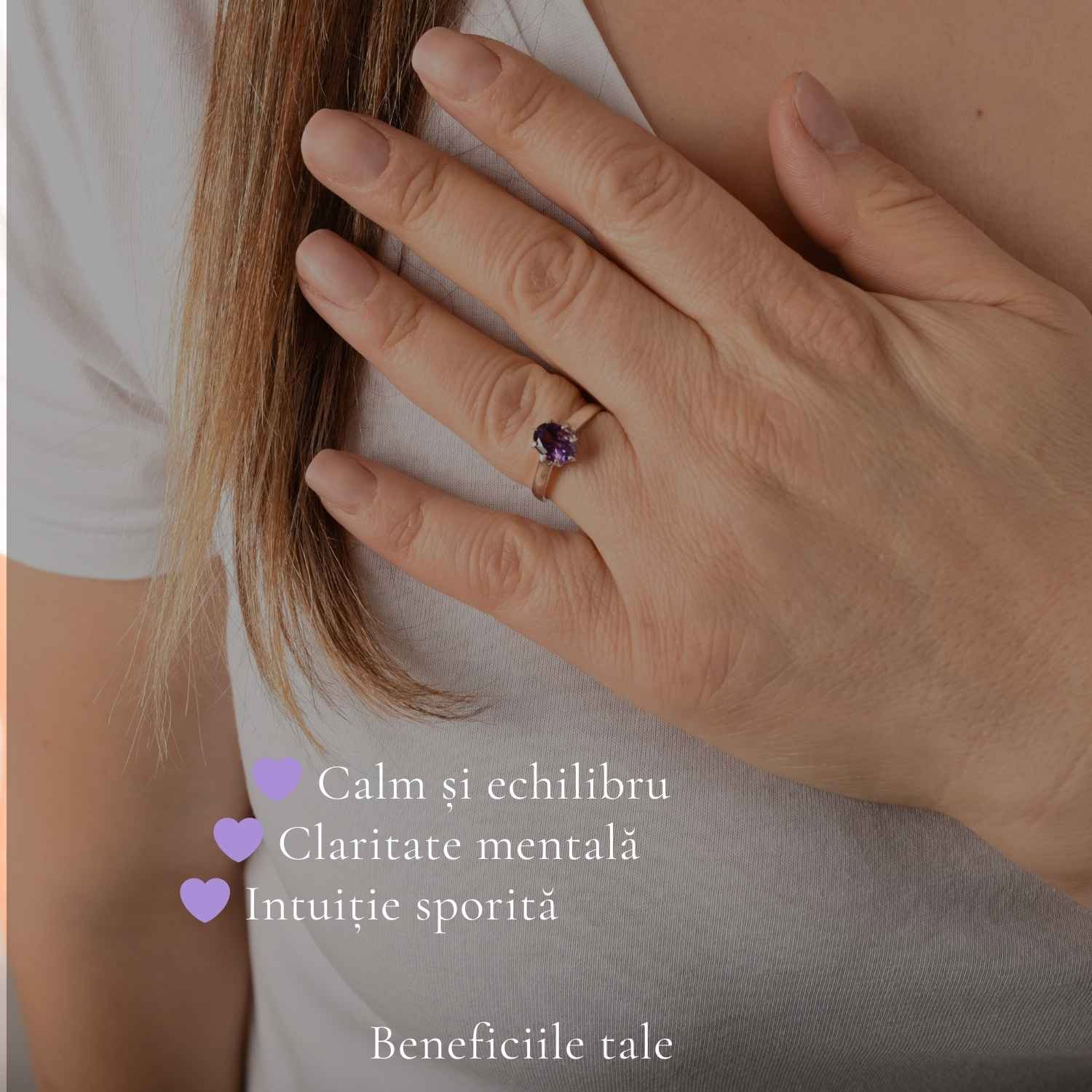 Îți pui inelul dimineața și observi reflexiile violet ale ametistului când lumina cade pe piatră. Forma ovală îi dă o eleganță clasică, potrivită atât pentru o zi la birou, cât și pentru o ieșire relaxată. Este confortabil și plăcut pe mână, iar după câteva minute devine parte din tine.