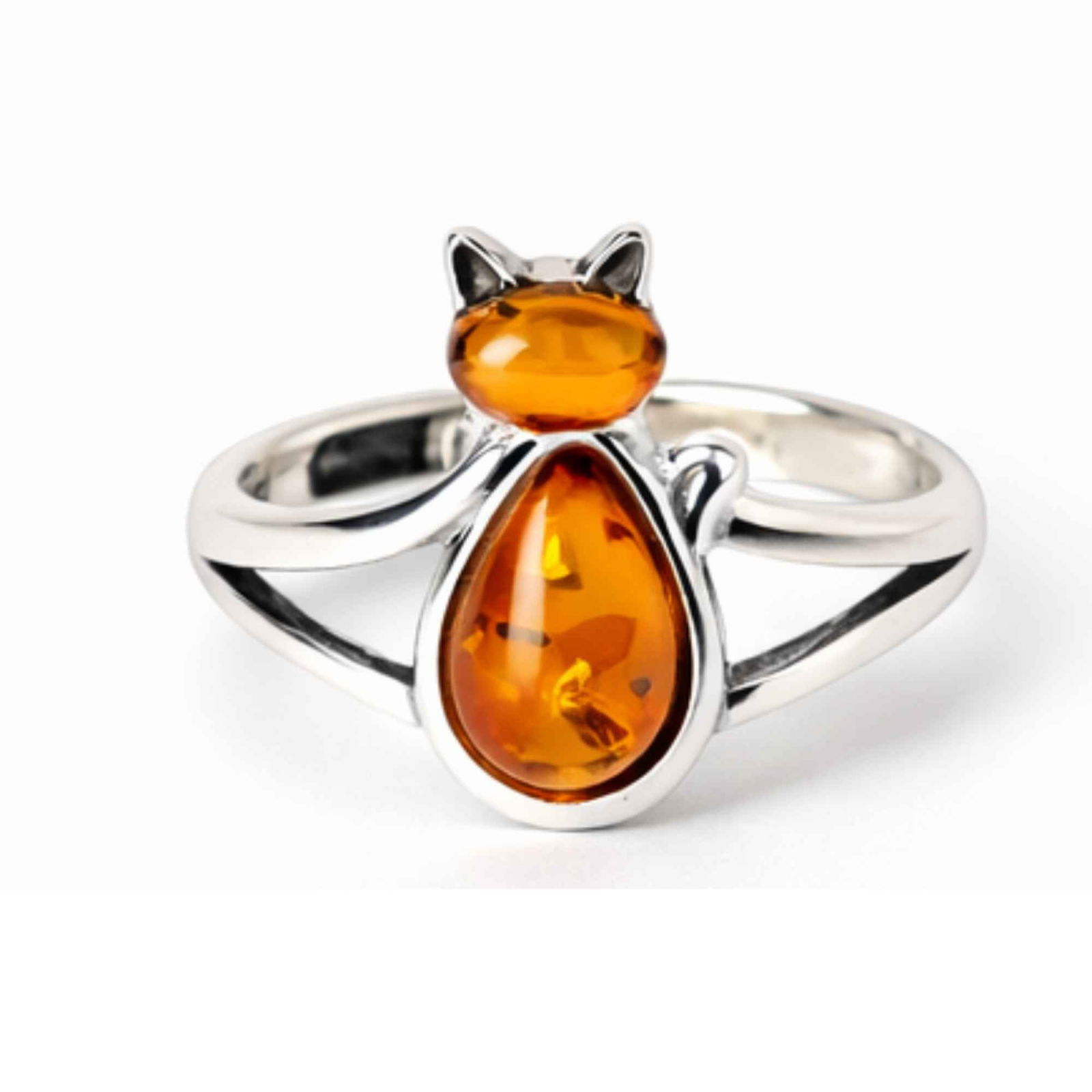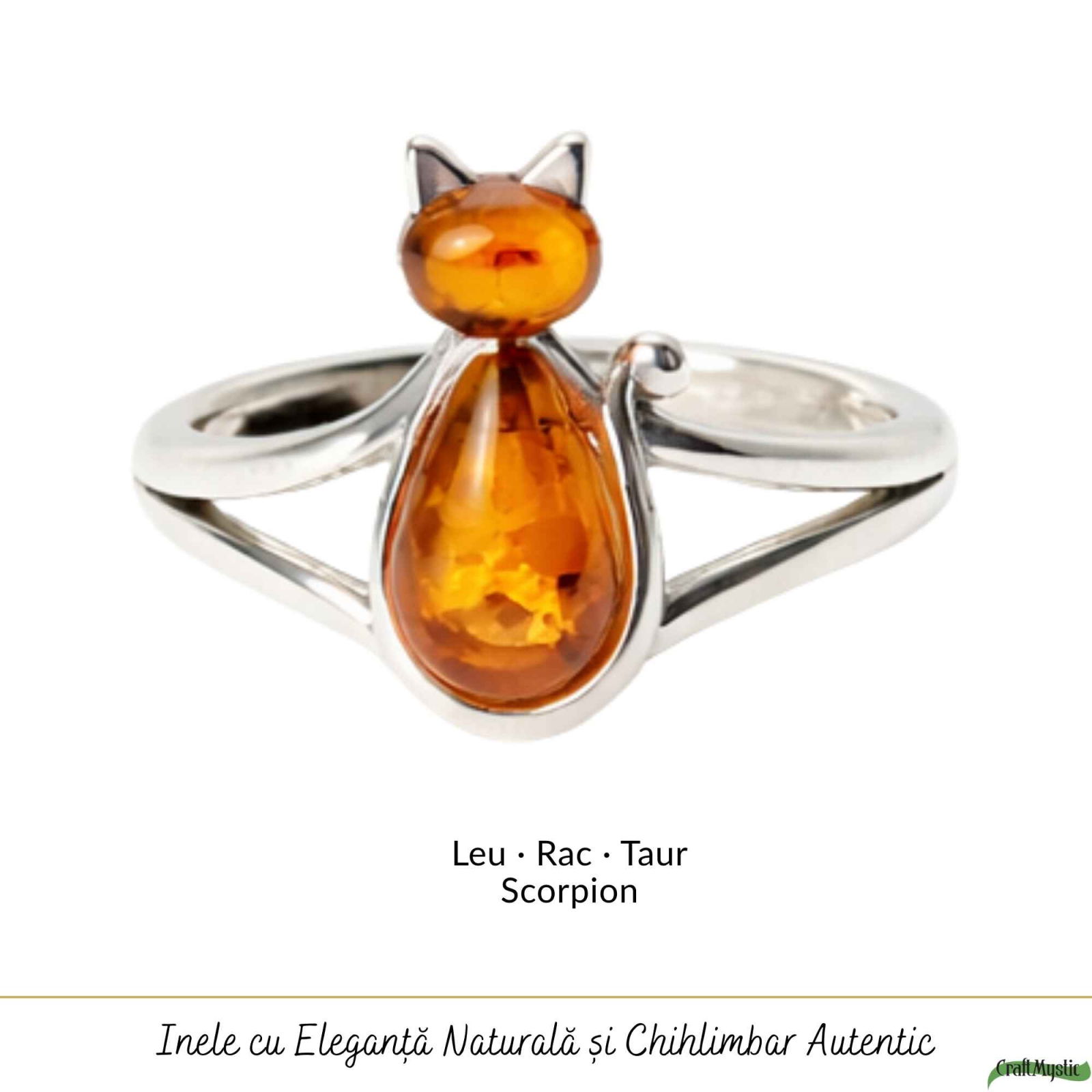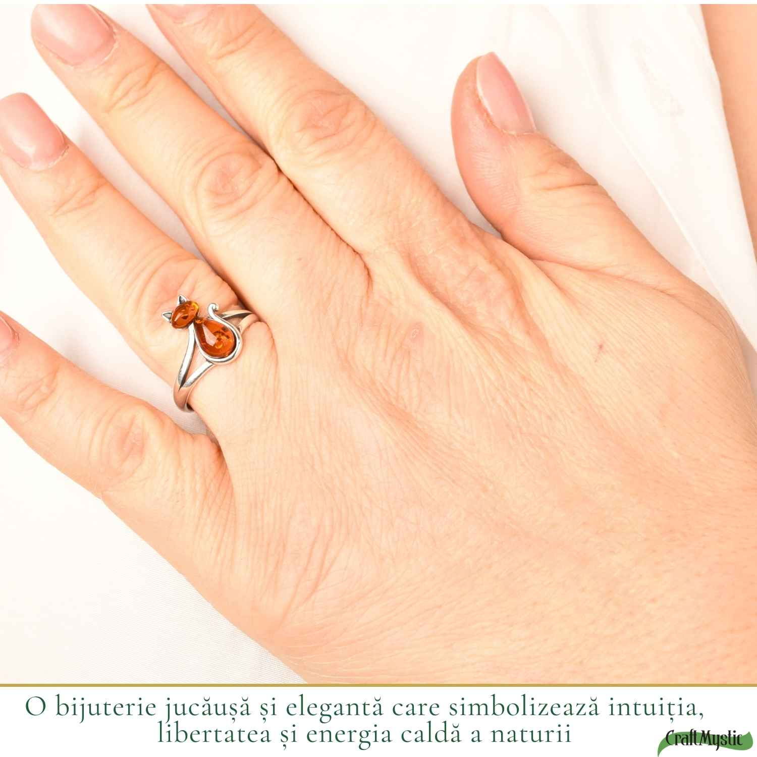 Inel delicat din argint 925 cu pisică și chihlimbar natural, o bijuterie plină de farmec care simbolizează intuiția, libertatea și energia caldă a naturii. Designul reglabil îl face confortabil de purtat zilnic și perfect pentru un cadou special.