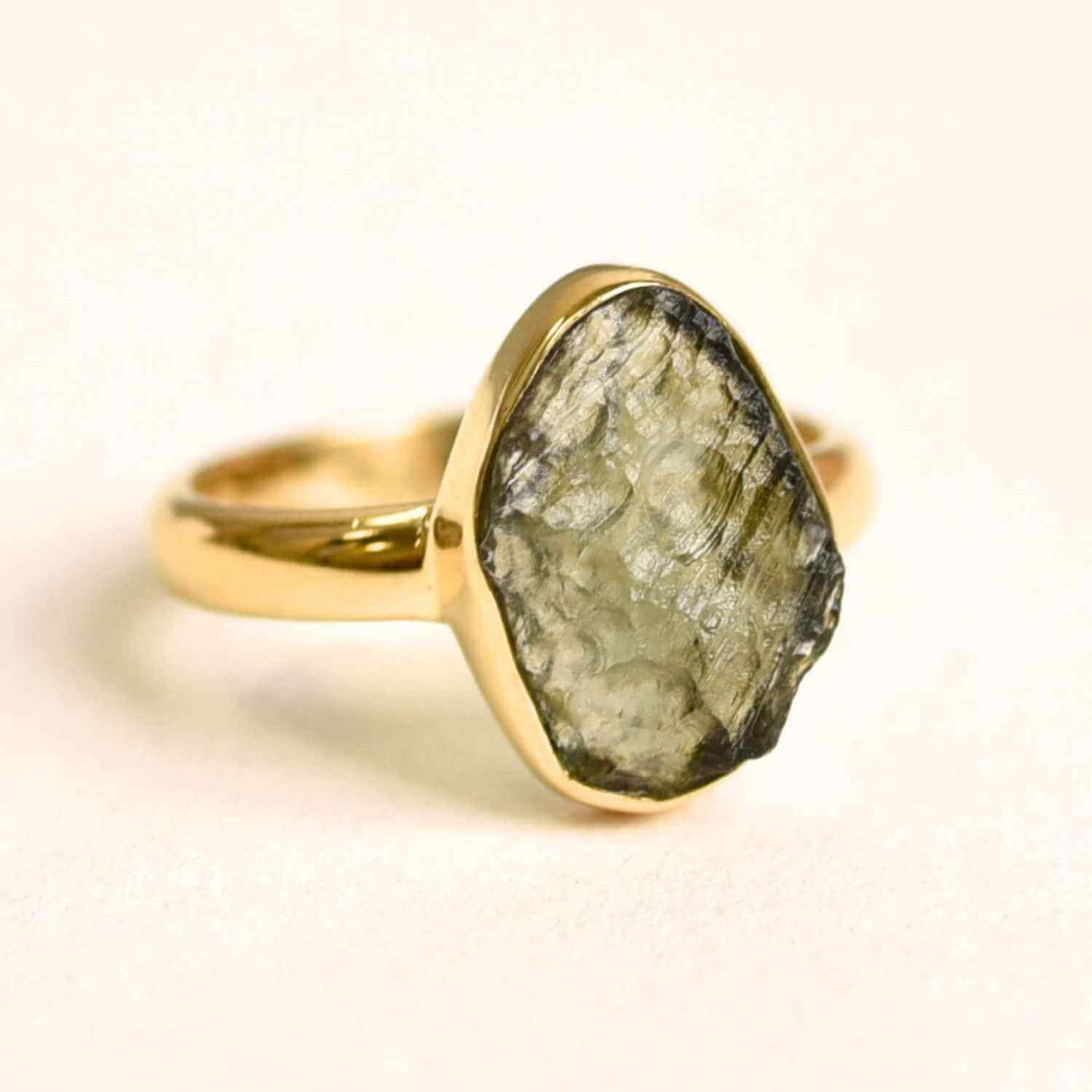 Un inel rar cu Moldavit natural brut, piatra transformarii si a conexiunii cosmice. Fiecare piesa are forma sa naturala, creata de natura, iar unele pot sugera vizual inima (iubire), scutul (protectie) sau aripa (evolutie) – fara a fi slefuite intentionat. Alege piesa care rezoneaza cu tine si bucura-te de energia ei autentica.