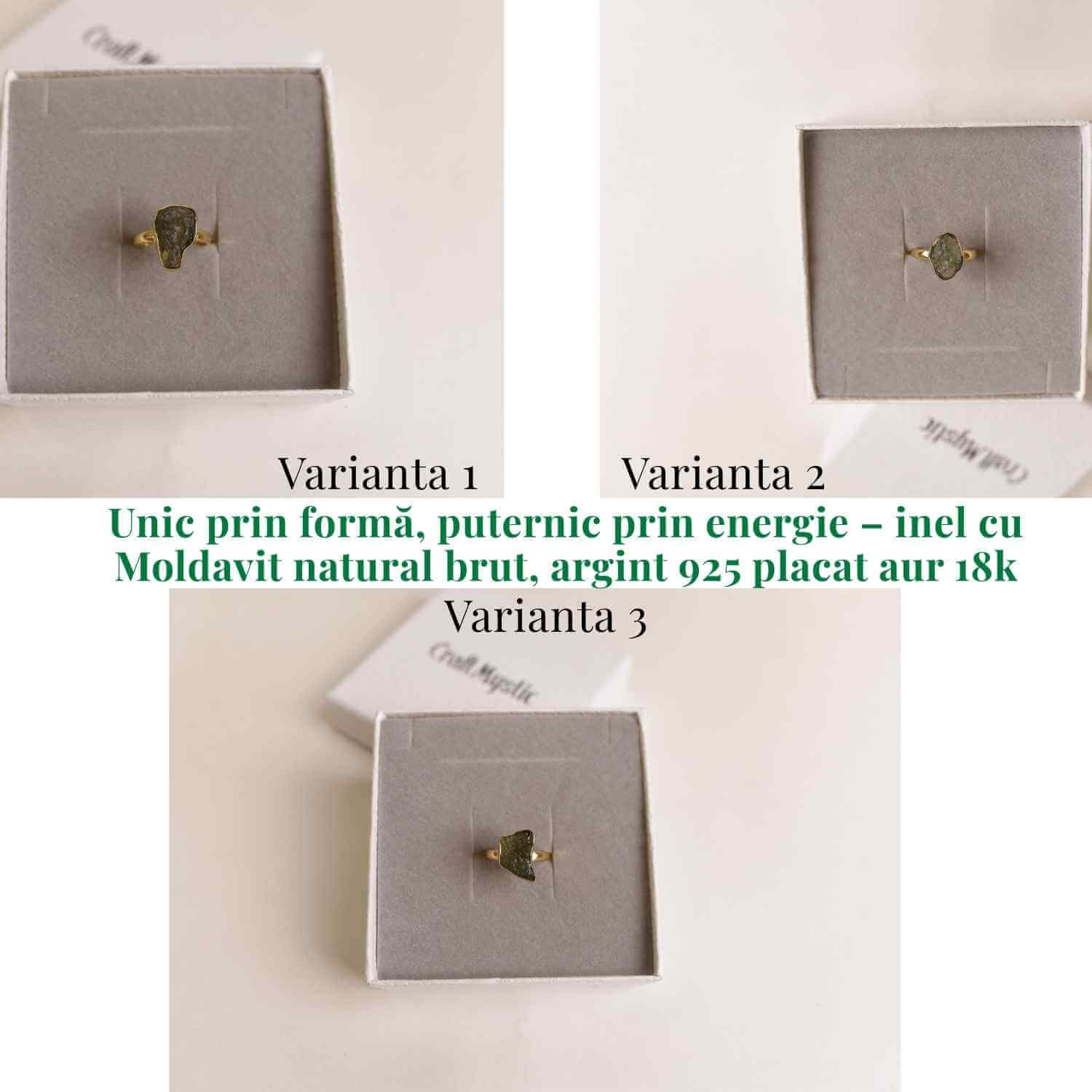 Un inel rar cu Moldavit natural brut, piatra transformarii si a conexiunii cosmice. Fiecare piesa are forma sa naturala, creata de natura, iar unele pot sugera vizual inima (iubire), scutul (protectie) sau aripa (evolutie) – fara a fi slefuite intentionat. Alege piesa care rezoneaza cu tine si bucura-te de energia ei autentica.