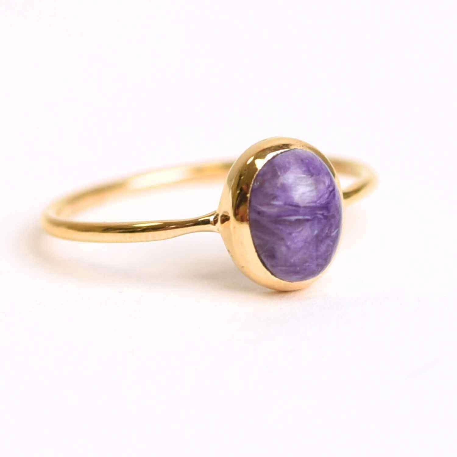 Inelul cu piatra de Charoite te conectează cu forța transformării interioare și clarității mentale profunde.