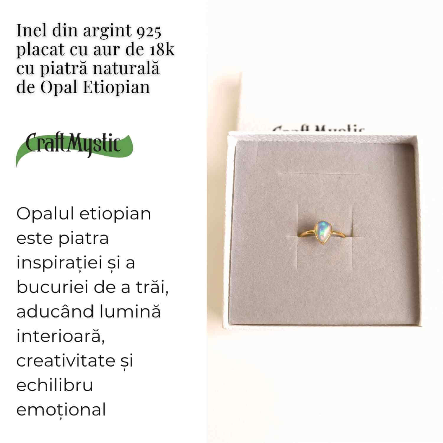 Acest inel delicat cu piatră naturală de Opal Etiopian în formă de lacrimă este o bijuterie care îmbină frumusețea unică a curcubeului de culori cu simbolul lacrimii – purificare și vindecare emoțională. Opalul este piatra visătorilor, aducând inspirație și deschidere către planurile subtile, iar forma sa transmite eliberare și curățare interioară.