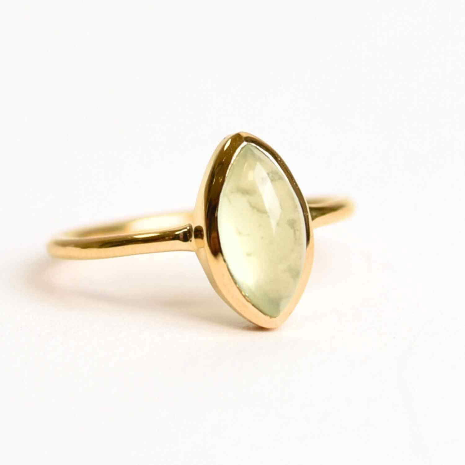 Un inel care poartă energia calmului și a echilibrului – Prehnitul, cu reflexele sale verzi diafane, este o piatră a liniștii interioare și a legăturii cu sufletul. Forma marquise (ochi divin) simbolizează clarviziunea, protecția și concentrarea asupra esențialului. Împreună, aurul cald și Prehnitul translucid creează o bijuterie ce aduce echilibru între inimă și minte, oferind purtătoarei o stare de pace și încredere în propria intuiție.