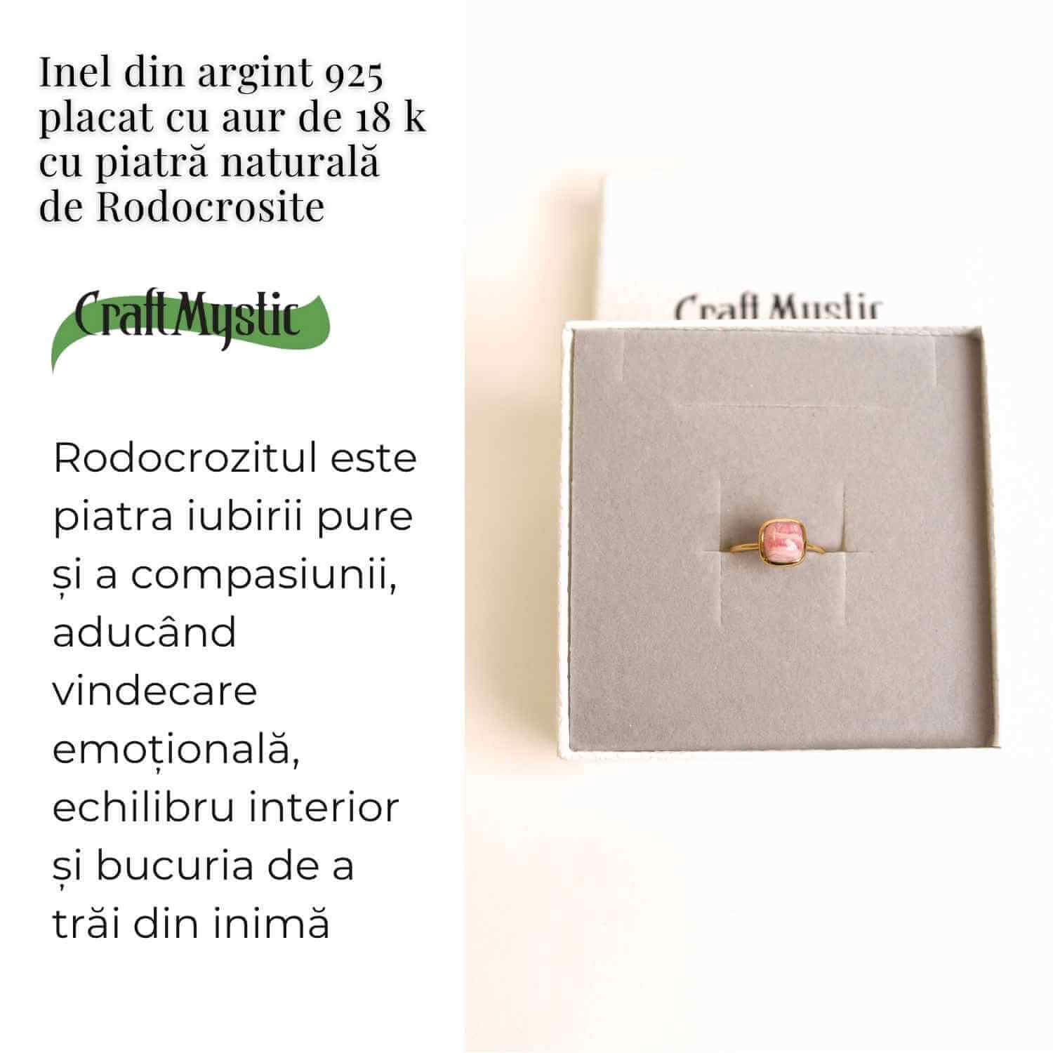 Acest inel delicat, cu piatră naturală de Rodocrozit, emană o vibrație caldă de iubire și blândețe. Forma pătrată simbolizează stabilitatea, încrederea și armonia interioară, fiind un amulet al echilibrului emoțional. Cunoscută ca „piatra iubirii pure”, Rodocrozitul deschide inima, vindecă rănile trecutului și redă bucuria autentică de a iubi și de a fi iubit.