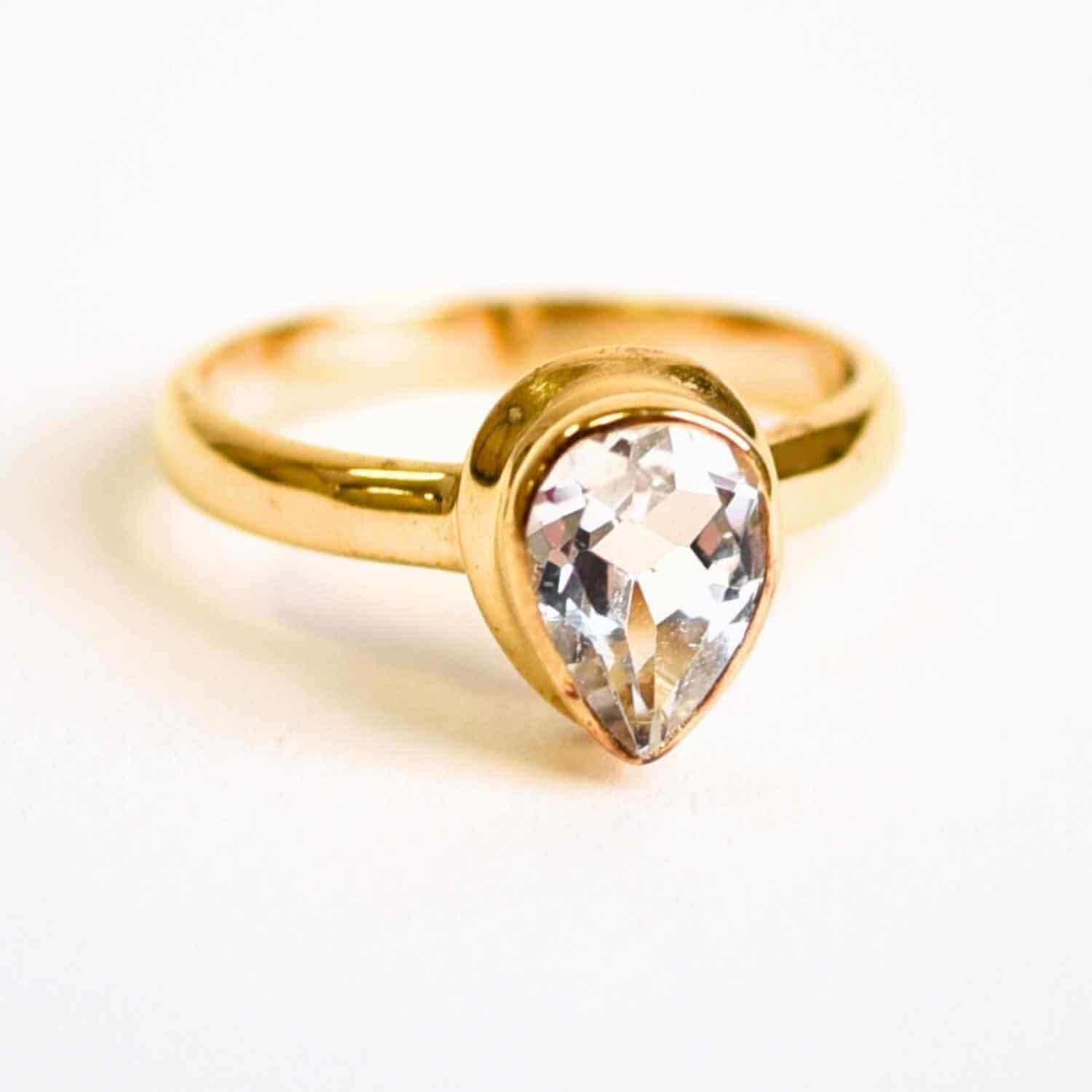 Acest inel rafinat din argint 925 placat cu aur de 18K, încrustat cu un Topaz Alb fațetat în formă de lacrimă, aduce o eleganță pură și o energie de lumină. Forma de lacrimă simbolizează purificarea, transformarea emoțională și renașterea sufletului, iar Topazul Alb este cunoscut ca piatra clarității și a inspirației divine. Împreună, acestea creează un talisman al echilibrului și al încrederii interioare.