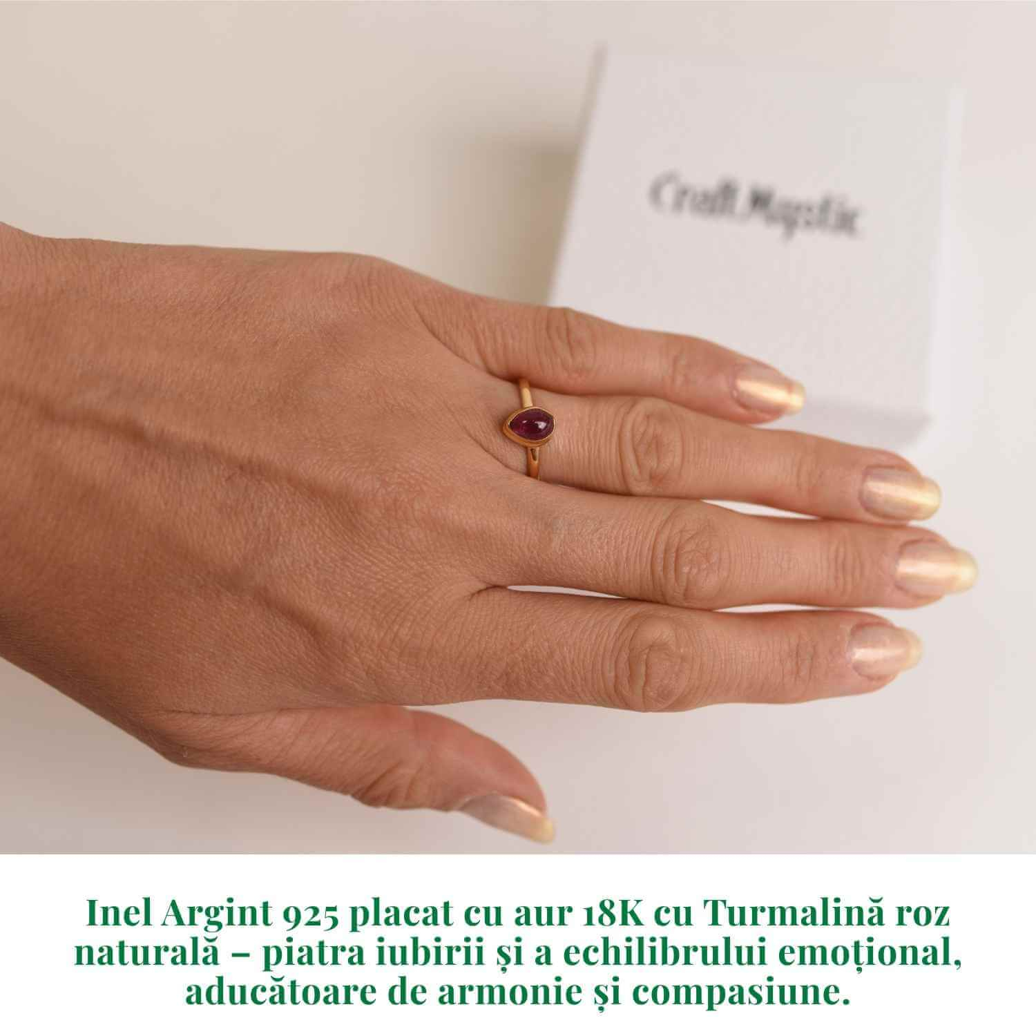 Descoperă rafinamentul turmalinei roz – piatra iubirii, a blândeții și a echilibrului emoțional. Acest inel delicat din argint 925 placat cu aur 18k pune în valoare un cabochon oval de turmalină roz, oferind o strălucire caldă și o energie plină de armonie.